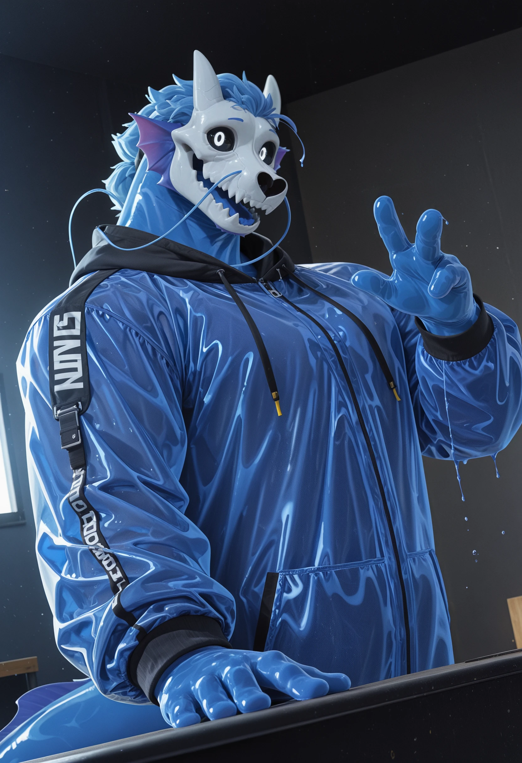 kann0_suk0yiko, liquid body, anthro, male, flesh whiskers, solo, hi res, tail, muscular, big muscles, broad shoulders, blue hair, blue body, white eyes, fins, goo creature, black sclera, barbel (anatomy), skull head, dripping, tiny white horns