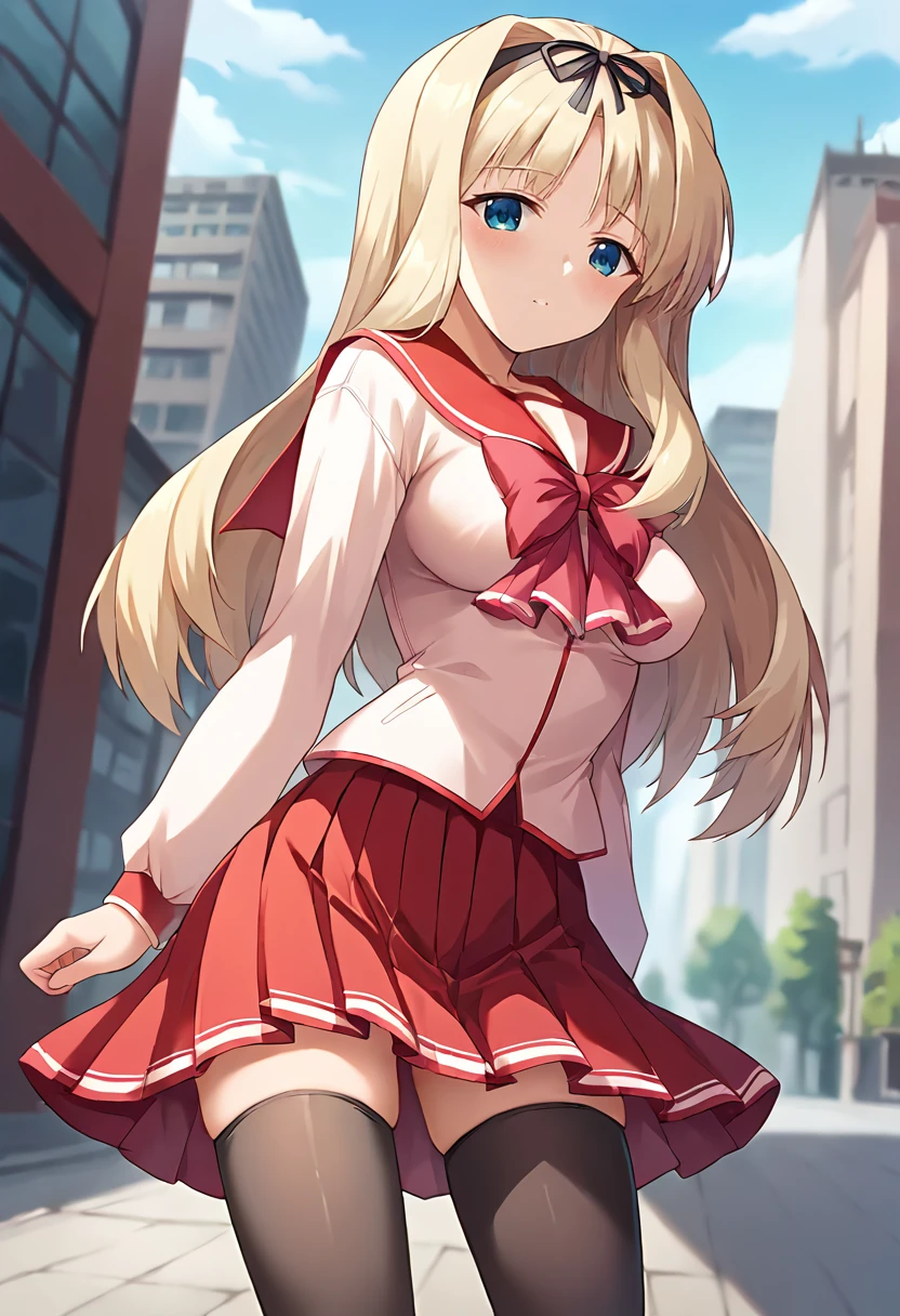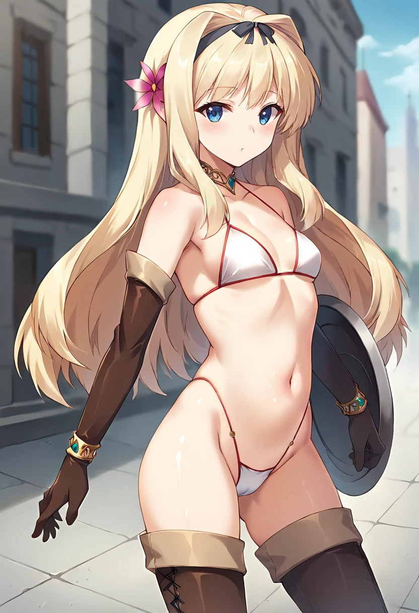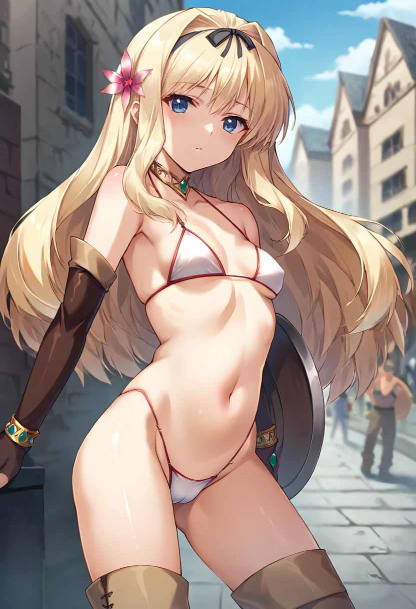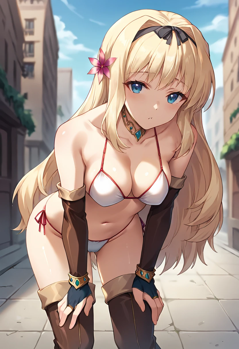 score_9, score_8_up, score_7_up, masterpiece, source_anime, 1girl, ct_sasa, long hair, medium breasts, blonde hair, black hairband, gold choker, hair flower, white bikini, elbow gloves, bracelet, brown thigh boots, outdoors, city, depth of field, looking at viewer, cowboy shot, shiny skin, Negative prompt ❌: