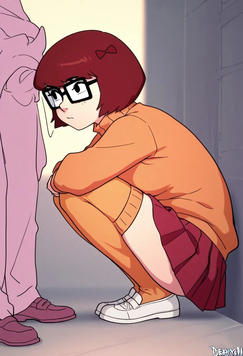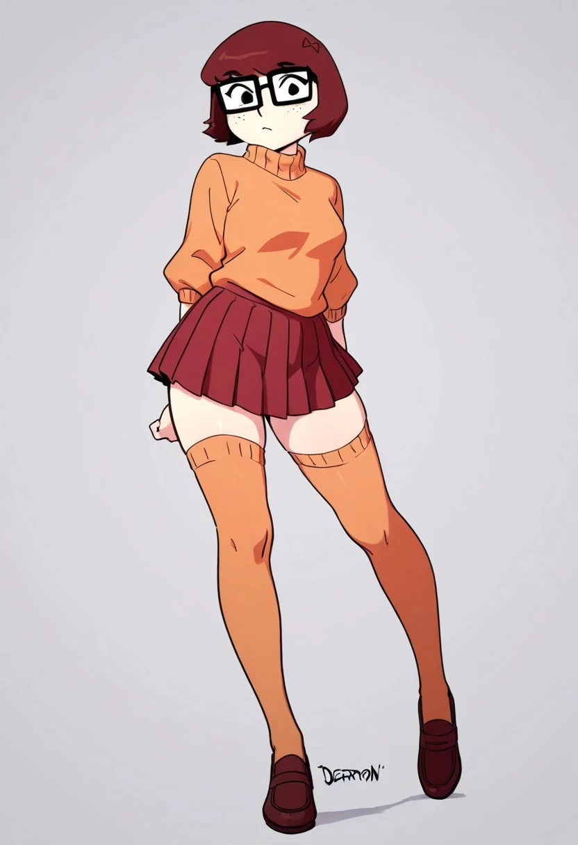 velma_drpxon, 1girl, glasses, short hair, freckles, turttleneck sweater, pleated skirt, orange thighhighs, shoes,