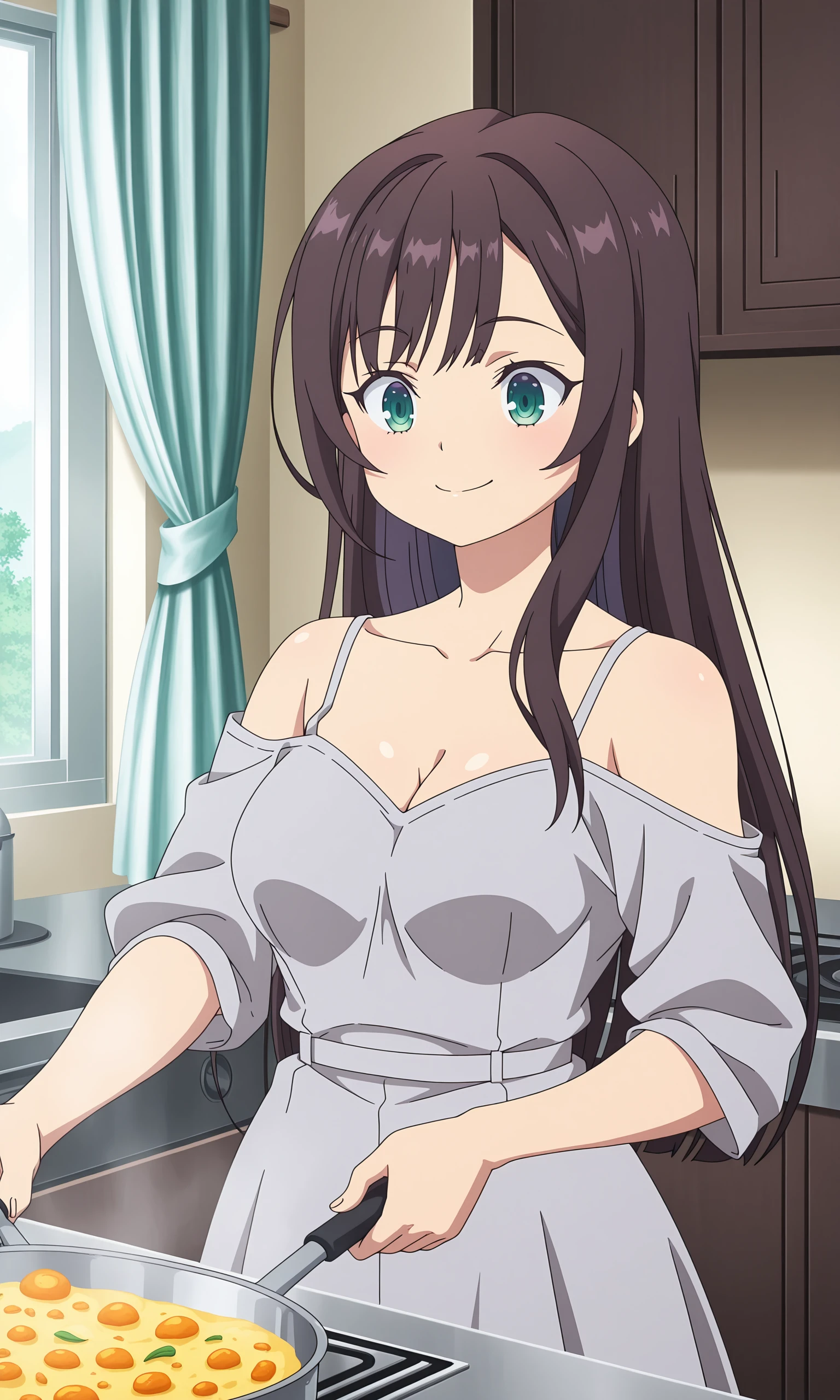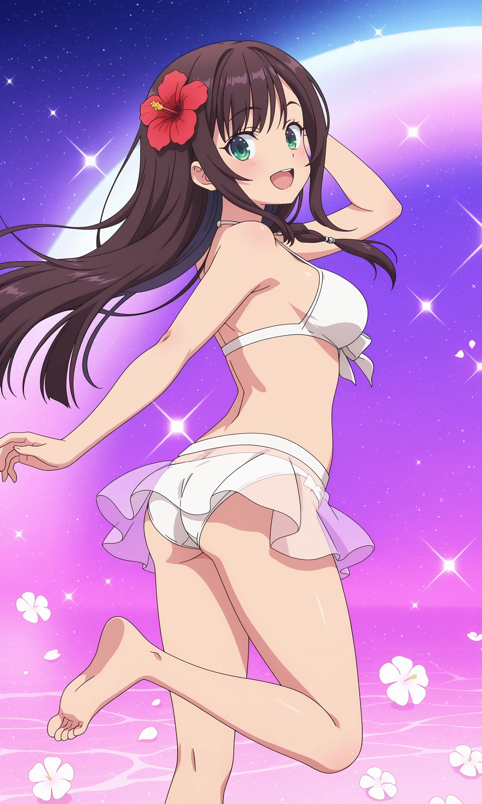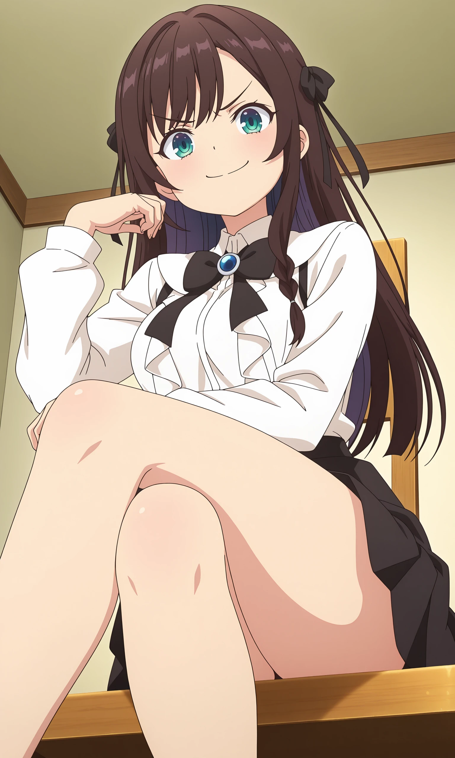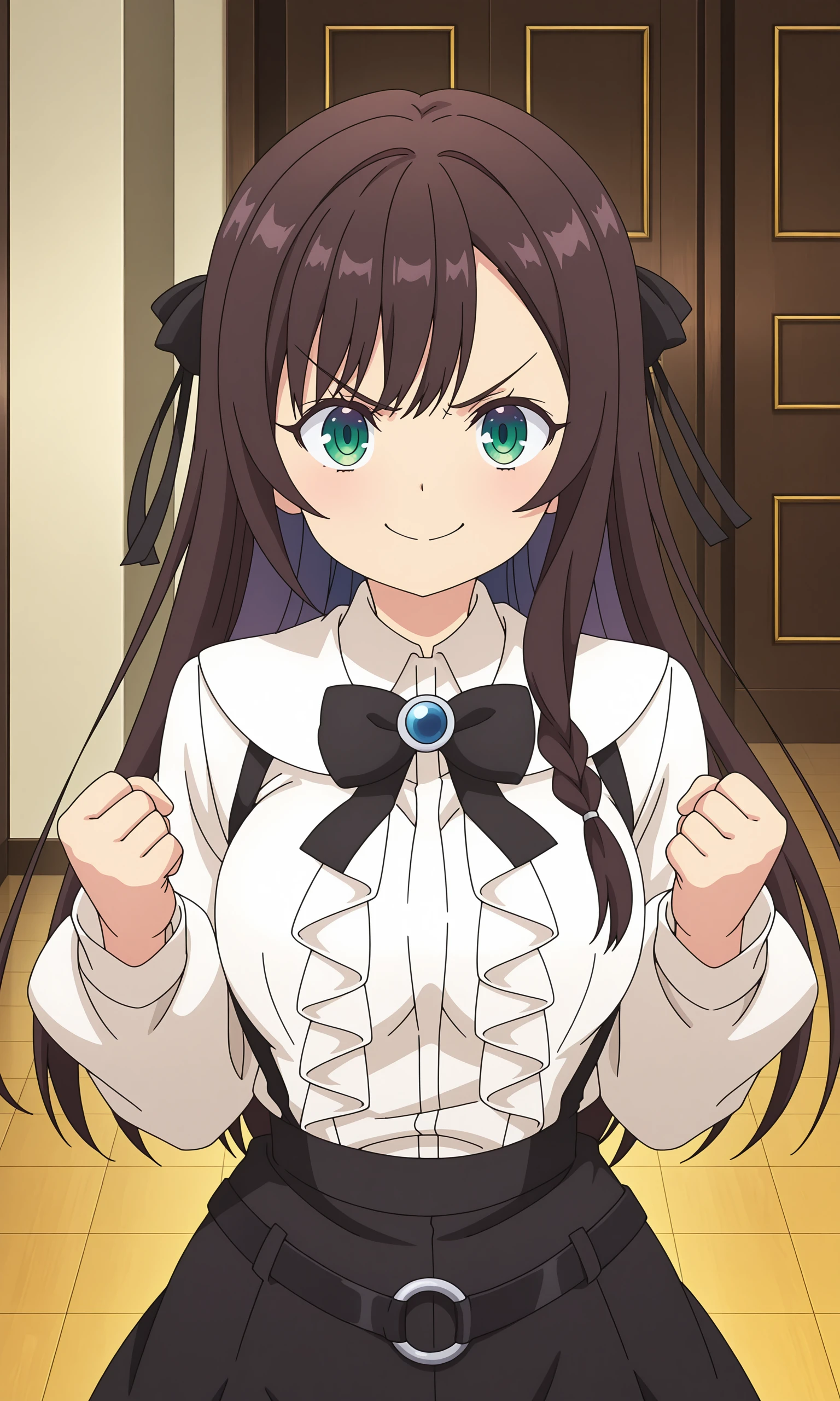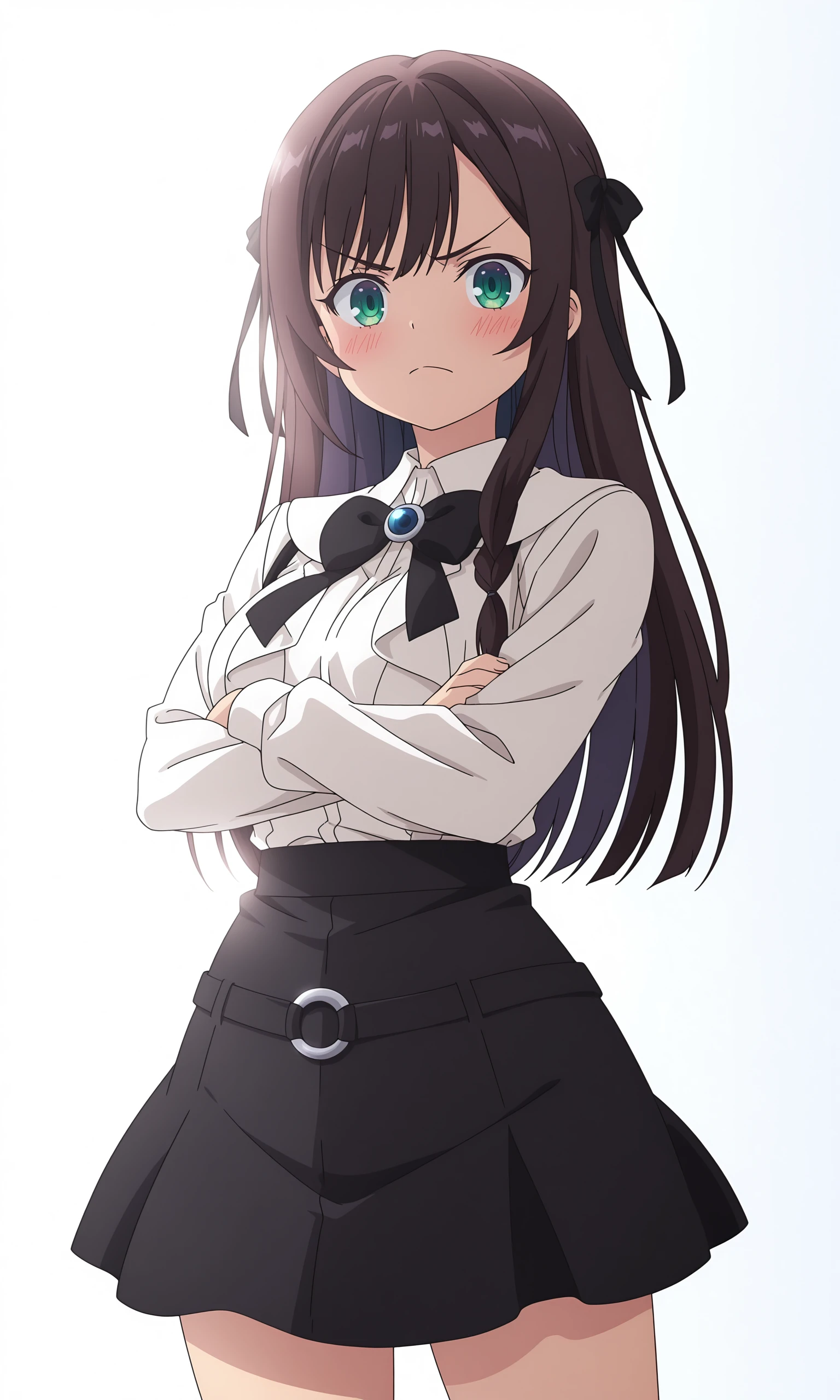 Alina, long hair, brown hair, multicolored hair, green eyes, bangs, hair ribbon,