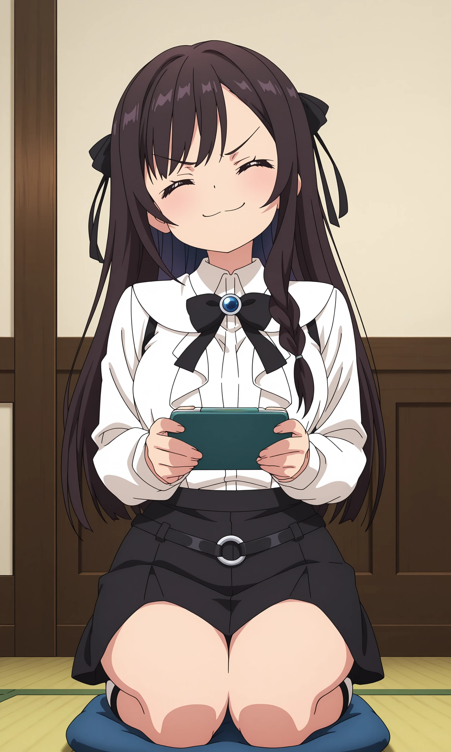 solo, skirt, shirt, socks, white socks, white shirt, black footwear, black skirt, suspenders, shoes, long sleeves, mary janes, suspender skirt, bow, ribbon