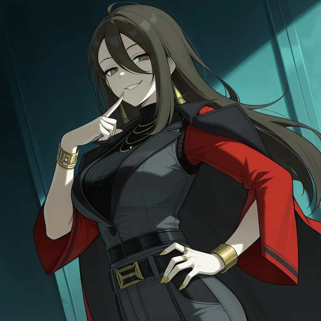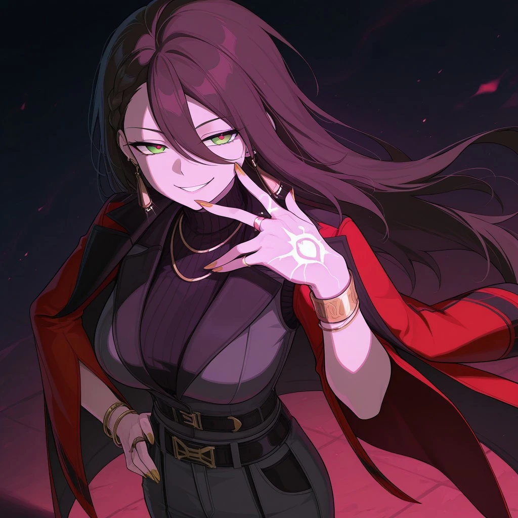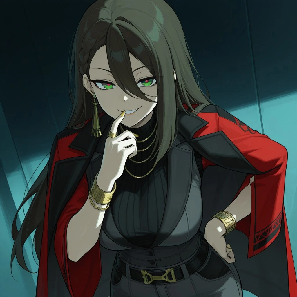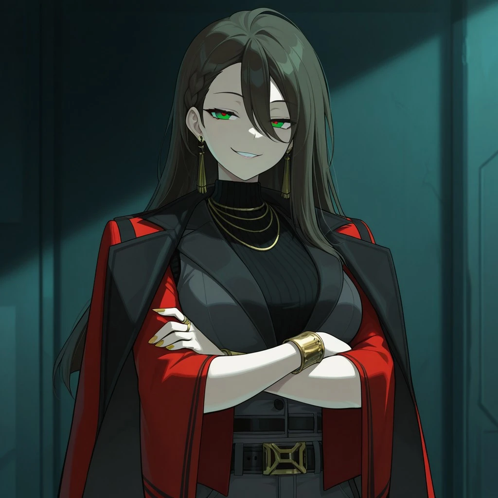 Character: 1girl, dark brown hair, long hair, hair between eyes, side braid, green eyes, red pupils, large breasts, golden nailpolish,