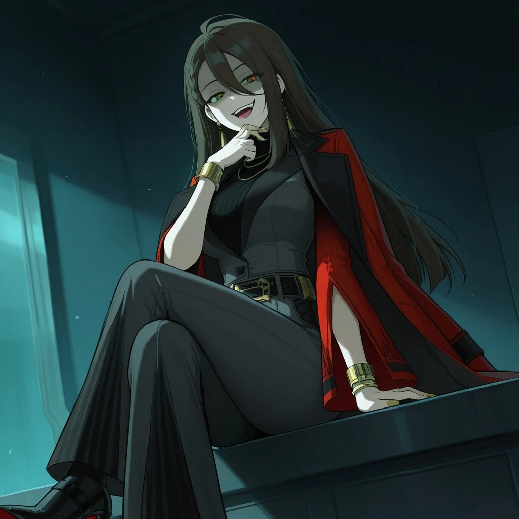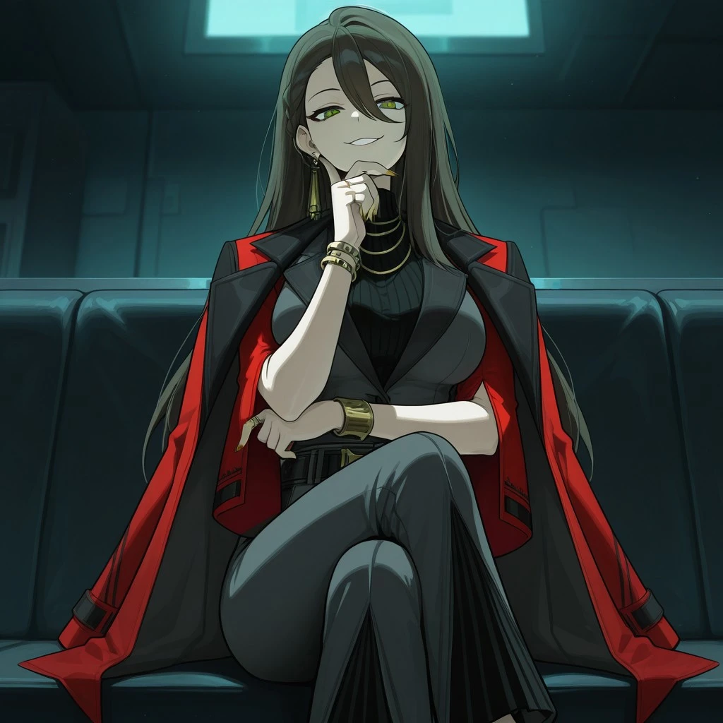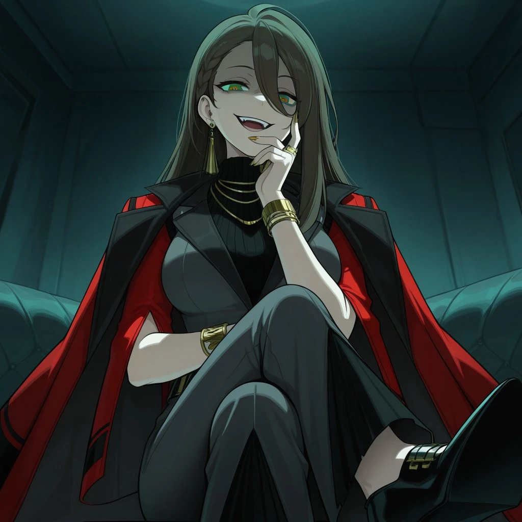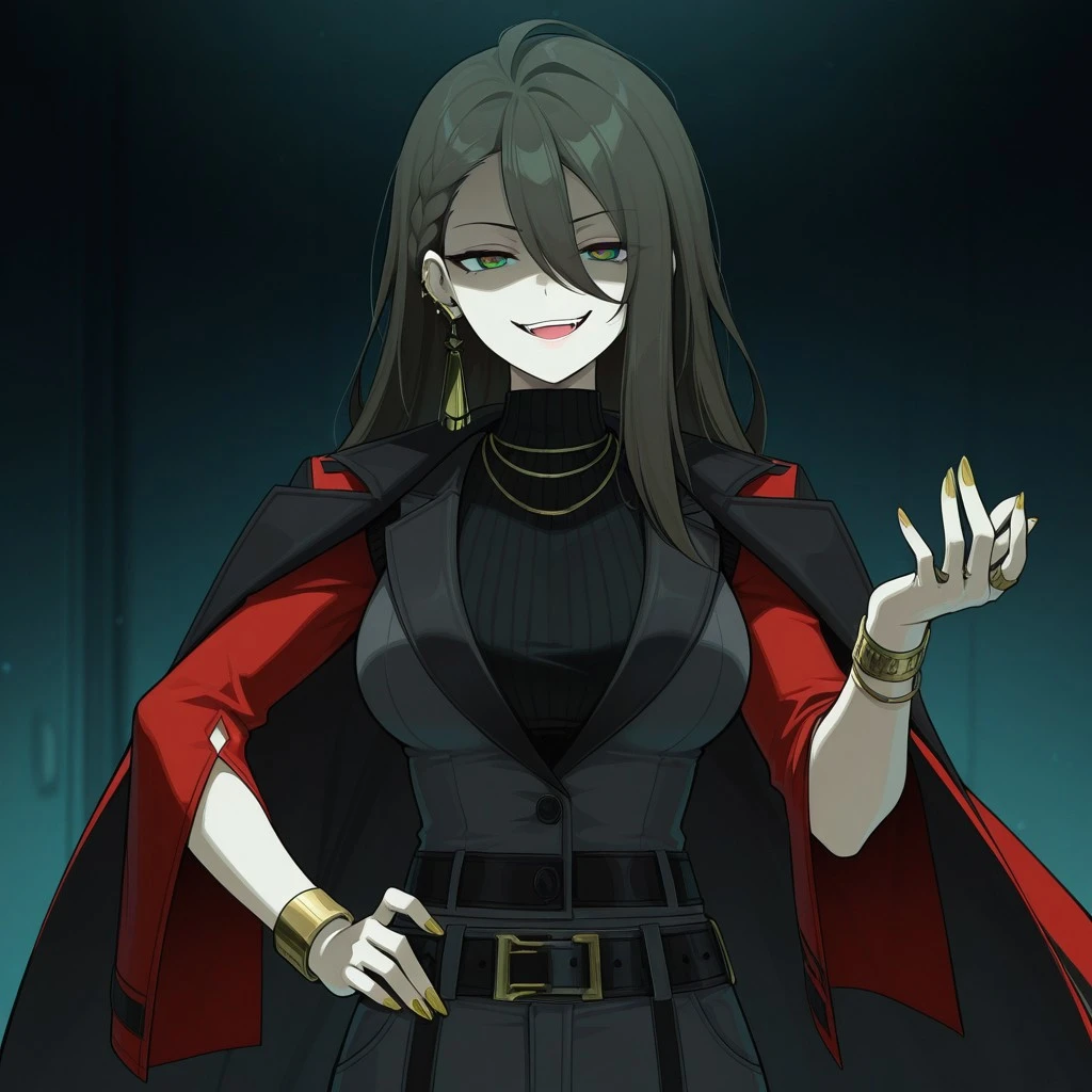 Character: 1girl, dark brown hair, long hair, hair between eyes, side braid, green eyes, red pupils, large breasts, golden nailpolish,