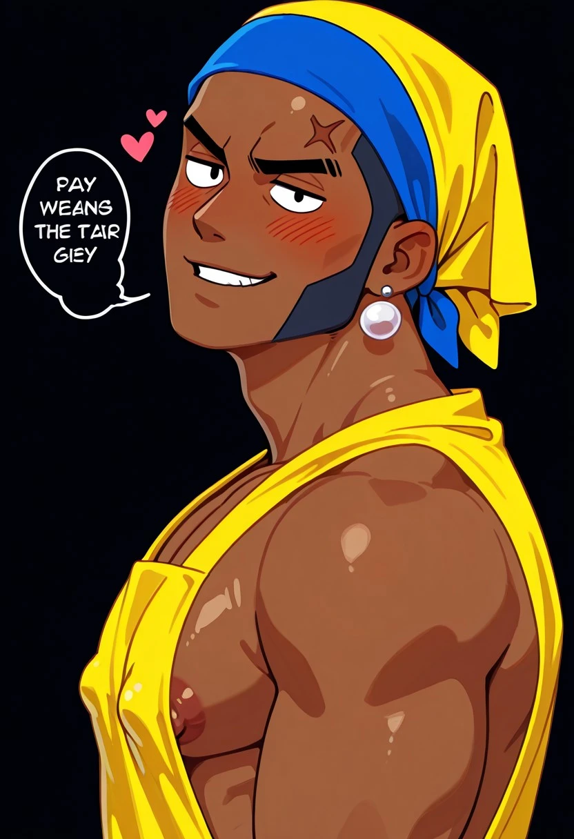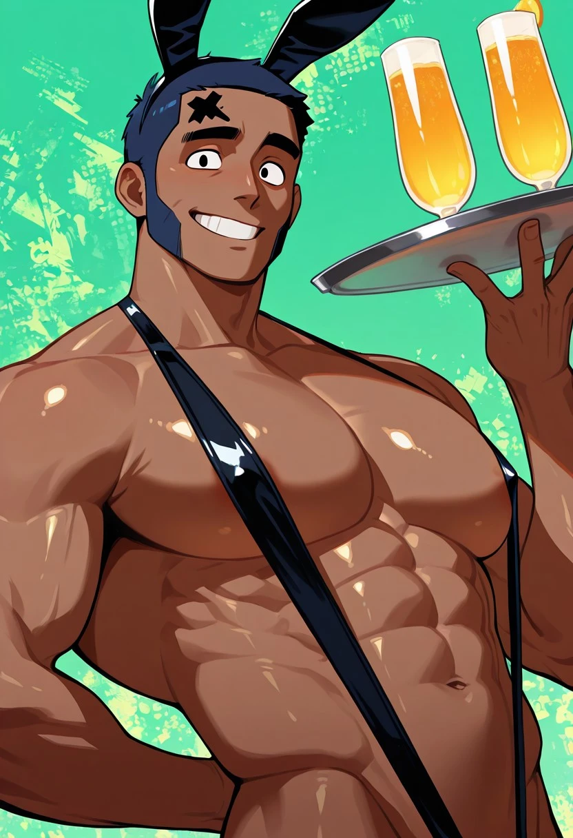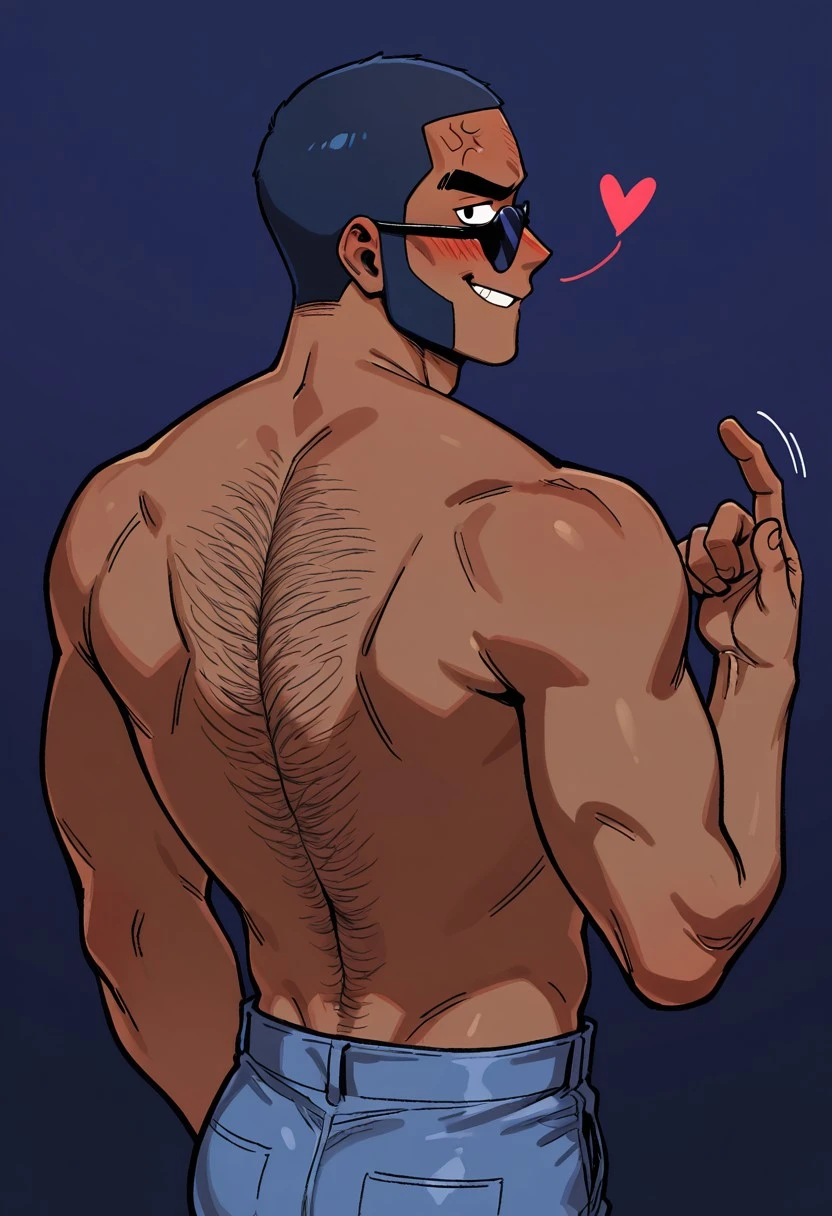 BSbr0ck, 1boy, dark skinned male, dark blue hair, very short hair, sunglasses_on_forehead, long eyebrows, black eyebrows, black eyes, blue vest, white t-shirt, pants,