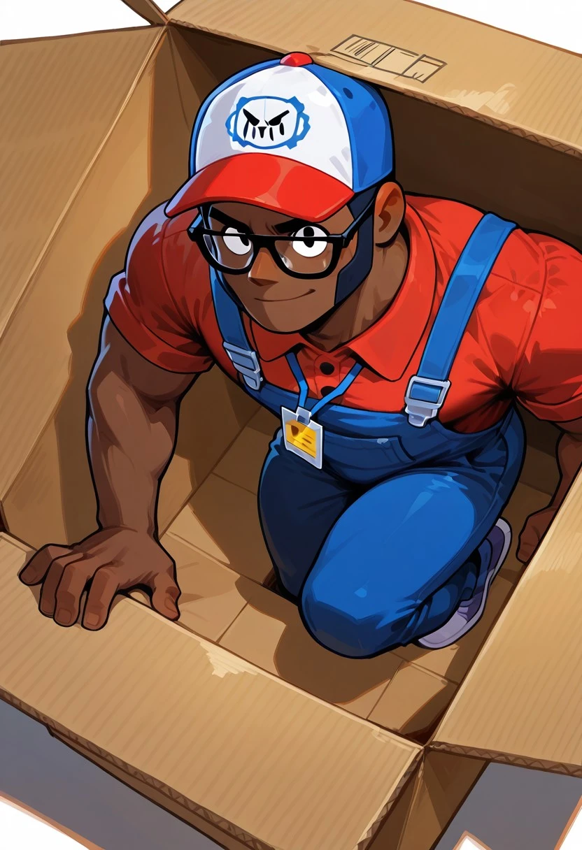 P0stalBrock, 1boy, very dark skinned male, dark hair, very short hair, coloring cap, glasses, black eyes, long sidebuns, red collared t-shirt, blue overol, brawl_stars