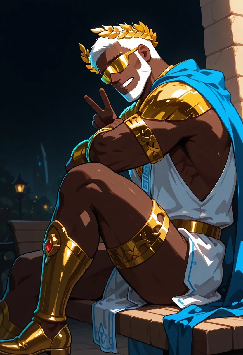 Z3us_Br0ck, 1boy, very dark skinned male, white hair, very short hair, beard, sidebuns, gold laurel crown, golden glasses, golden body jewerly, white and blue tunic, blue cape, golden footwear,
