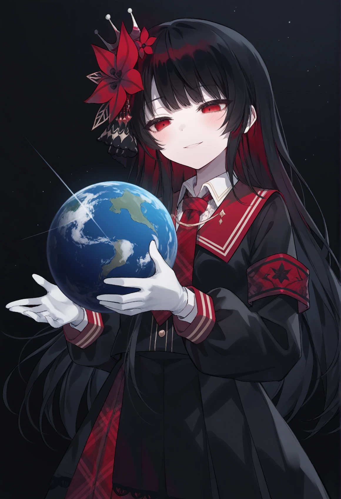 all tag:nikaido hiro,blush,multicolored hair,colored inner hair,single sidelock,hair flower,red flower,hair ribbon,hair ornament,mini crown,red sailor collar,plaid necktie,red necktie,side cape,black jacket,collared shirt,white shirt,long sleeves,red armband,floral print,white gloves,pleated skirt,black skirt,long skirt,lace-trimmed skirt,plaid skirt,red skirt,skirt under skirt,black pantyhose,black shoes,