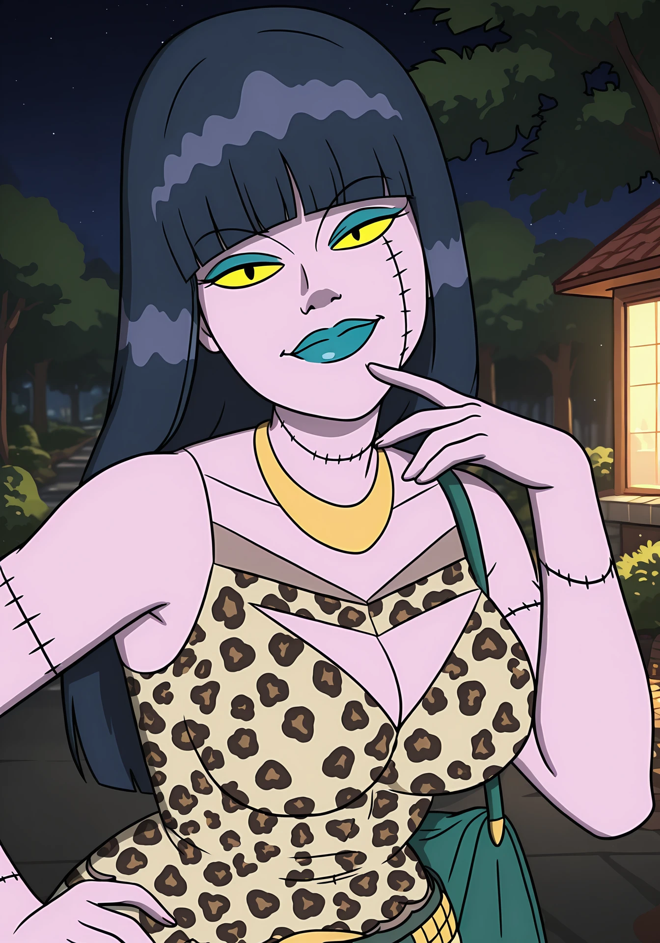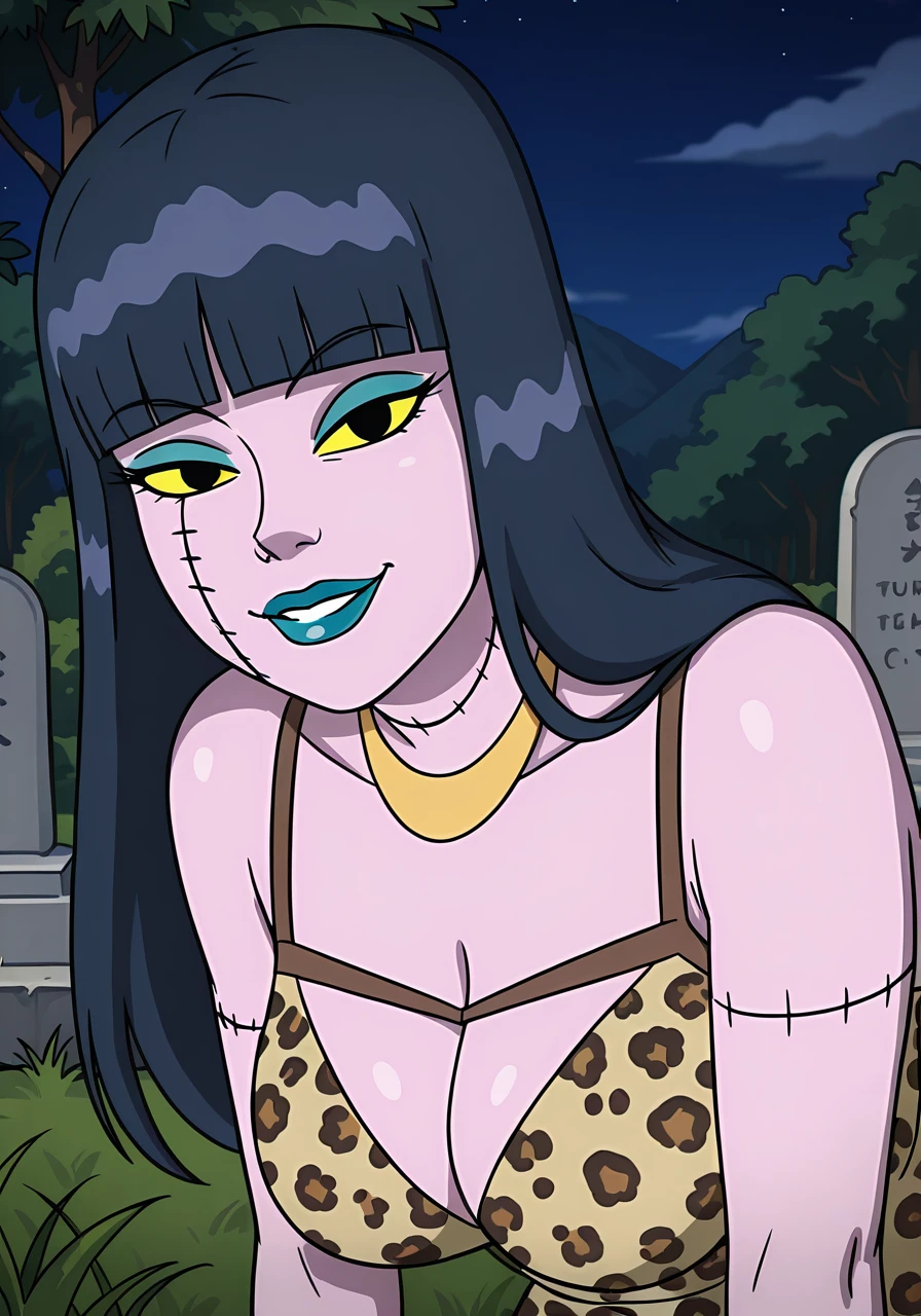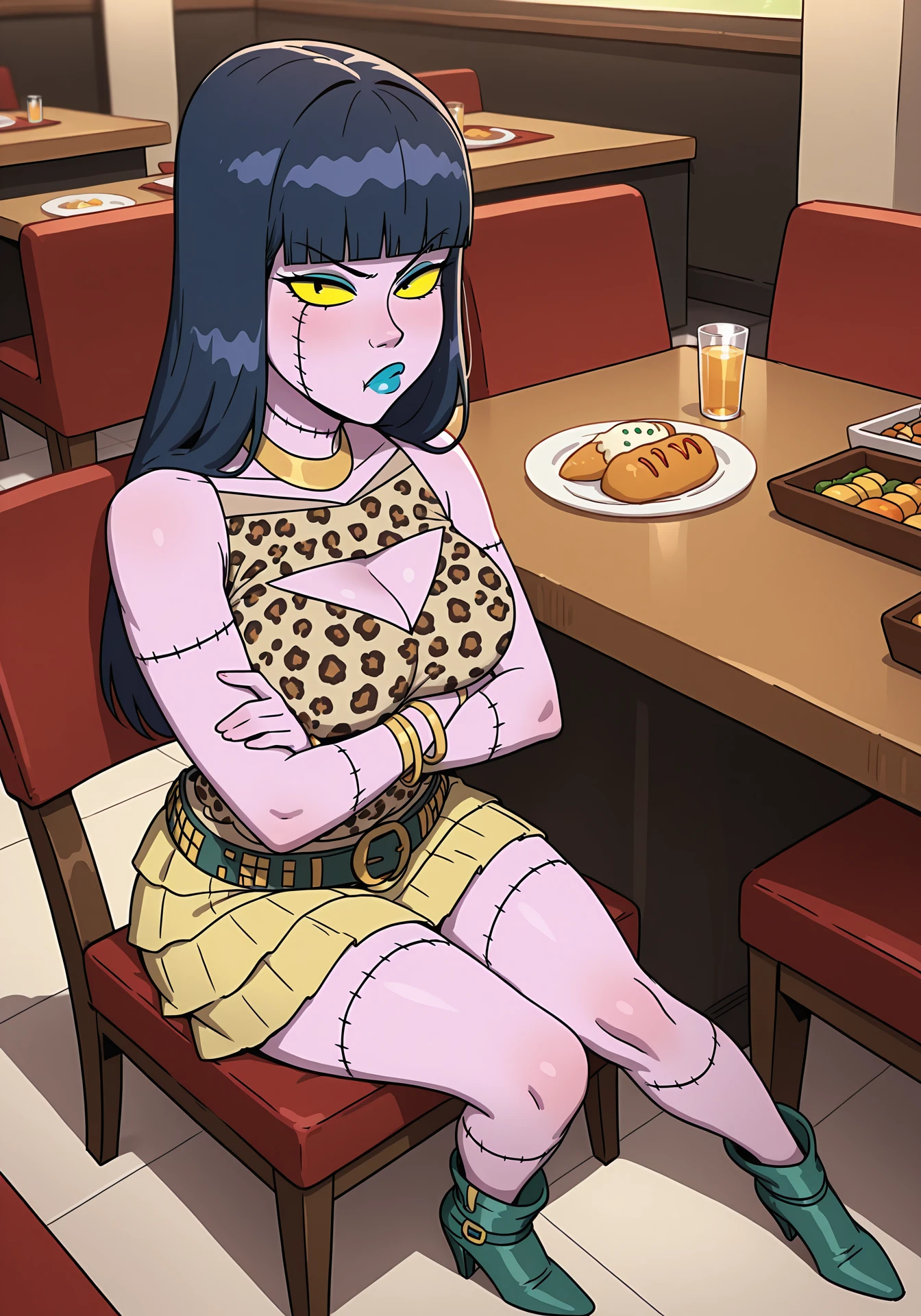 donnavesuvius, long hair, bangs, black hair, yellow sclera, blunt bangs,colored skin,lipstick, colored sclera, purple skin, teal lips, stitches, zombie girl