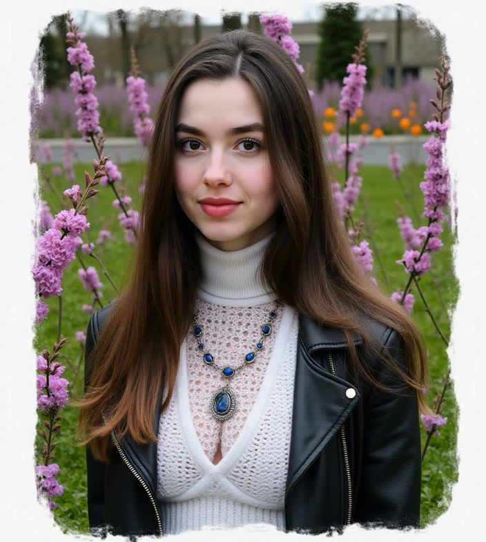 Example prompt: Portrait of a woman, Intricate jewel embellished turtleneck sweater, in a warm and vibrant outdoor background filled with nature, leaves, and soft bathed in golden sunlight. Enigmatic woman wearing a vintage turtleneck or a jacket with retro details over a T-shirt, adorned with Art Deco jewelry. The background is a blurred riverbank, with golden reflections in the water and reeds swaying in the wind