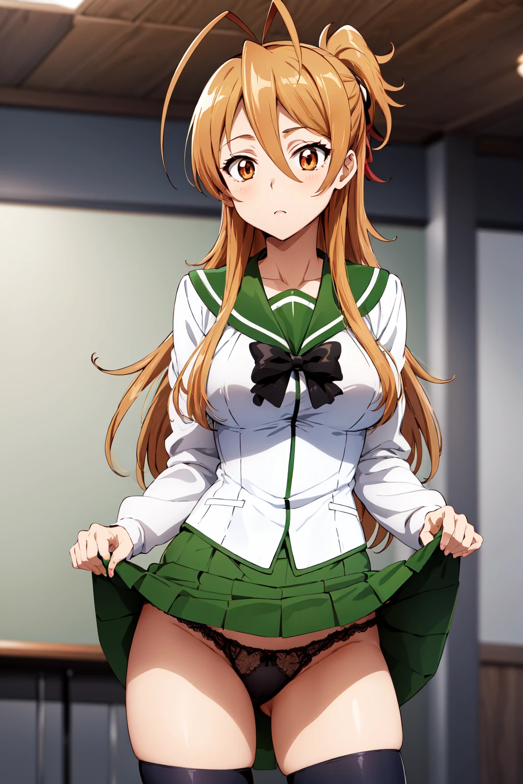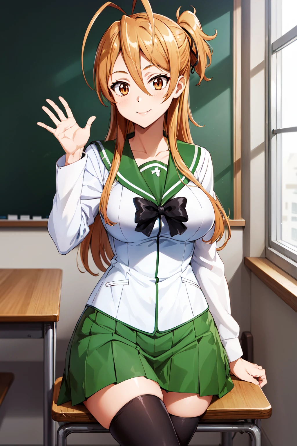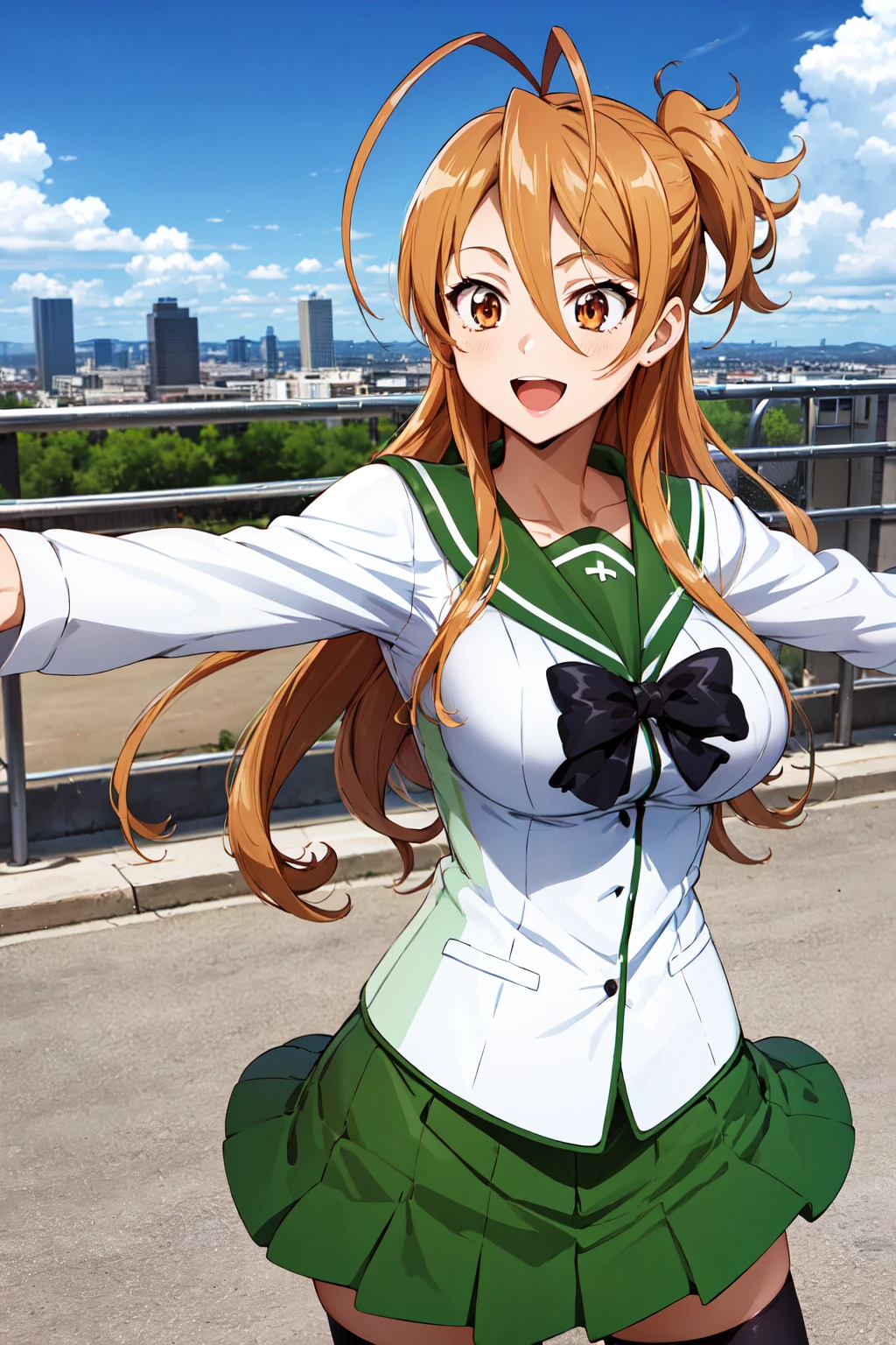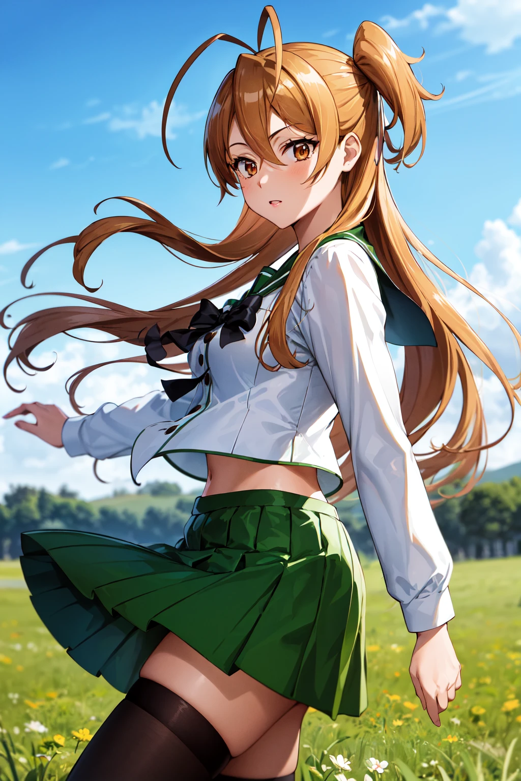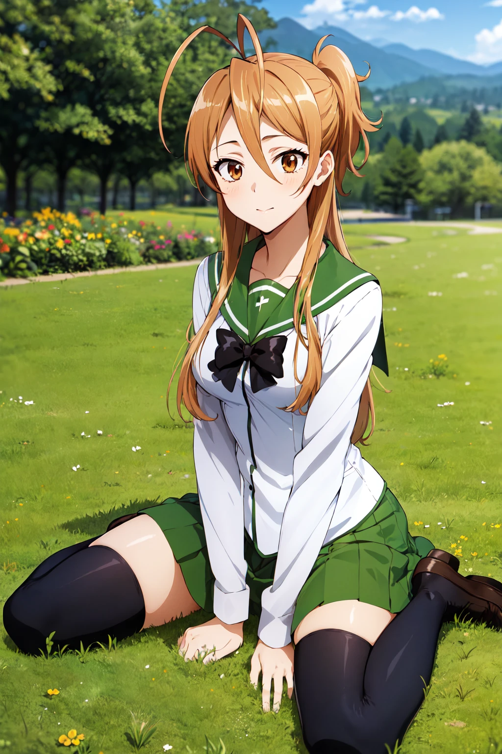 1girl, solo, long hair, brown hair, antenna hair, brown eyes, school uniform, green sailor collar, black bowtie, white shirt, long sleeves, pleated skirt, green skirt, black thighhighs