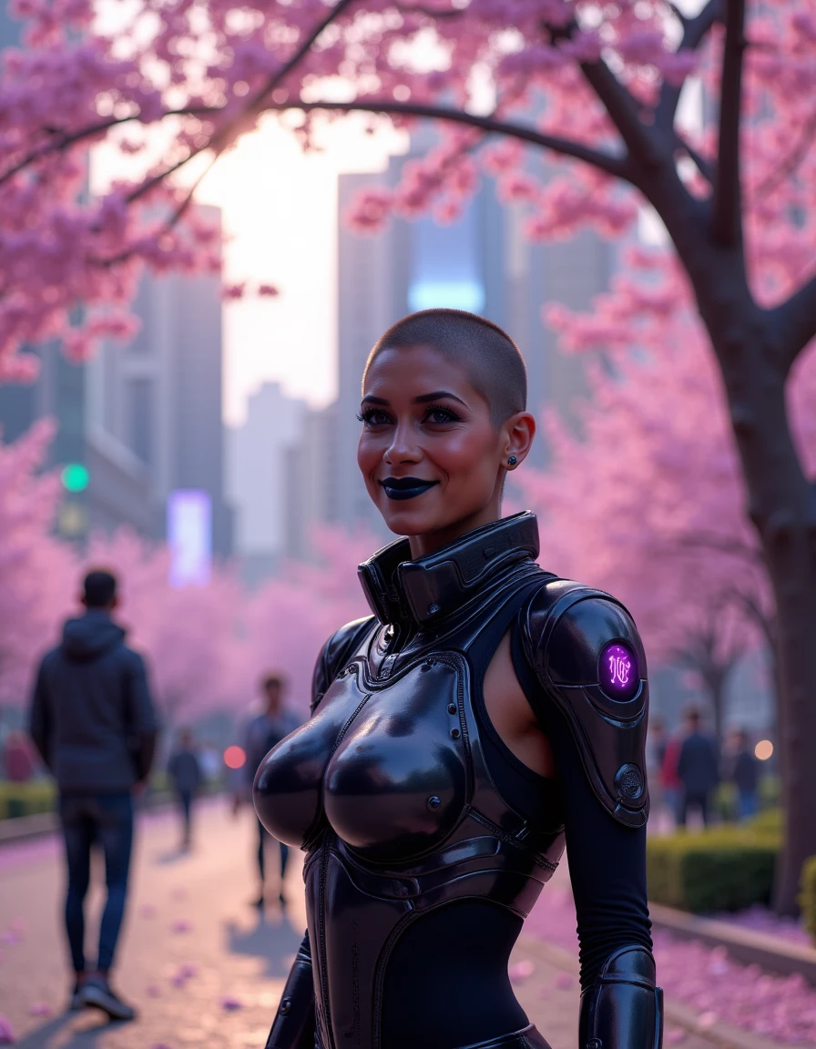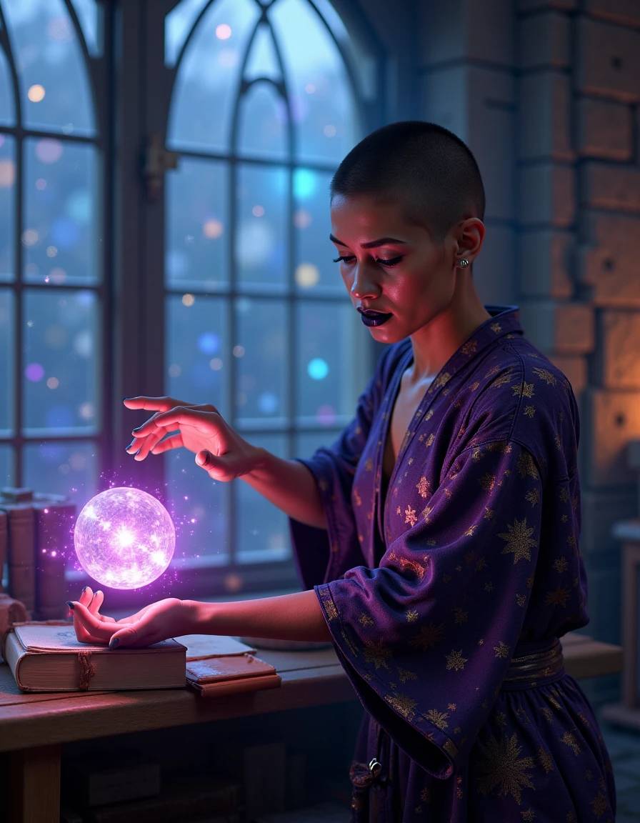 Isabella, a beautiful latina Colombian woman with dark olive skin, athletic body type, and shaved head, and expressive lavender purple eyes, she is wearing black lipstick and dark eye shadow,