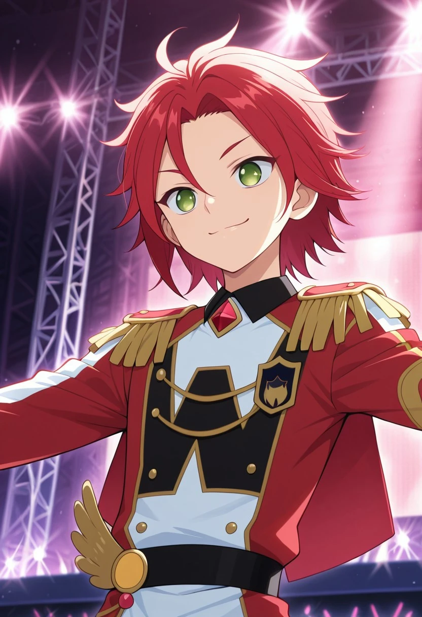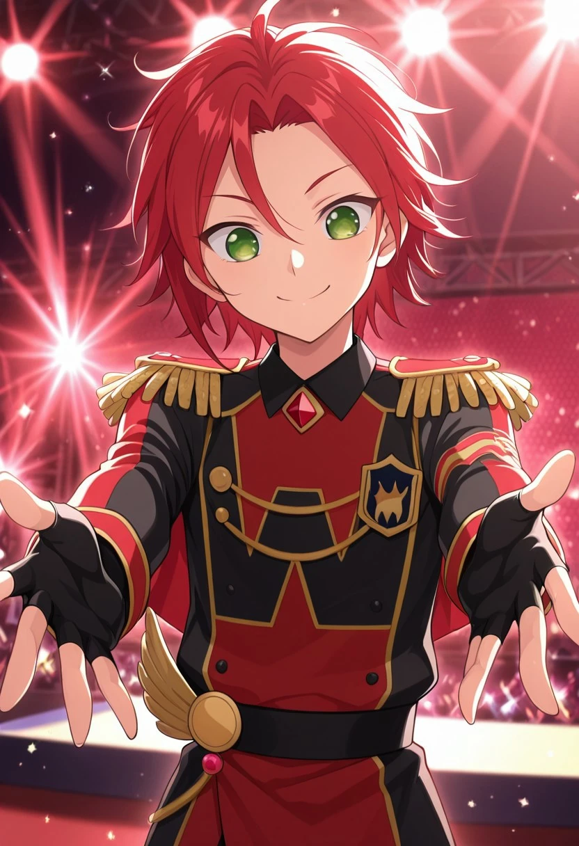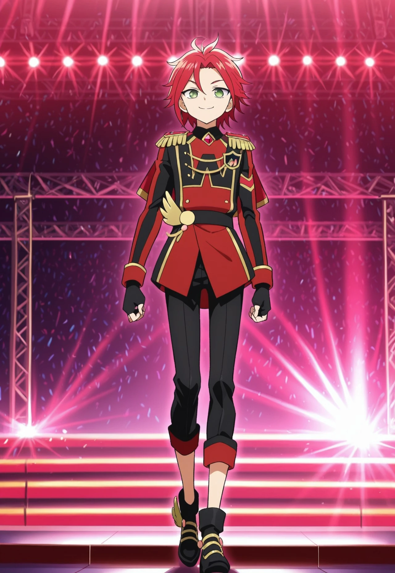 1boy, male focus, solo, green eyes, red hair, idol outfit, epaulettes, red and black jacket, short cape, red cape, belt, black pants, capri pants, ankle boots, black footwear, black gloves, fingerless gloves,