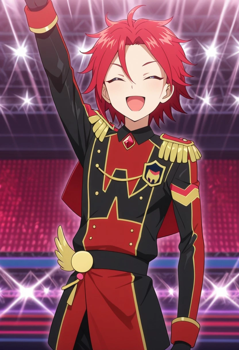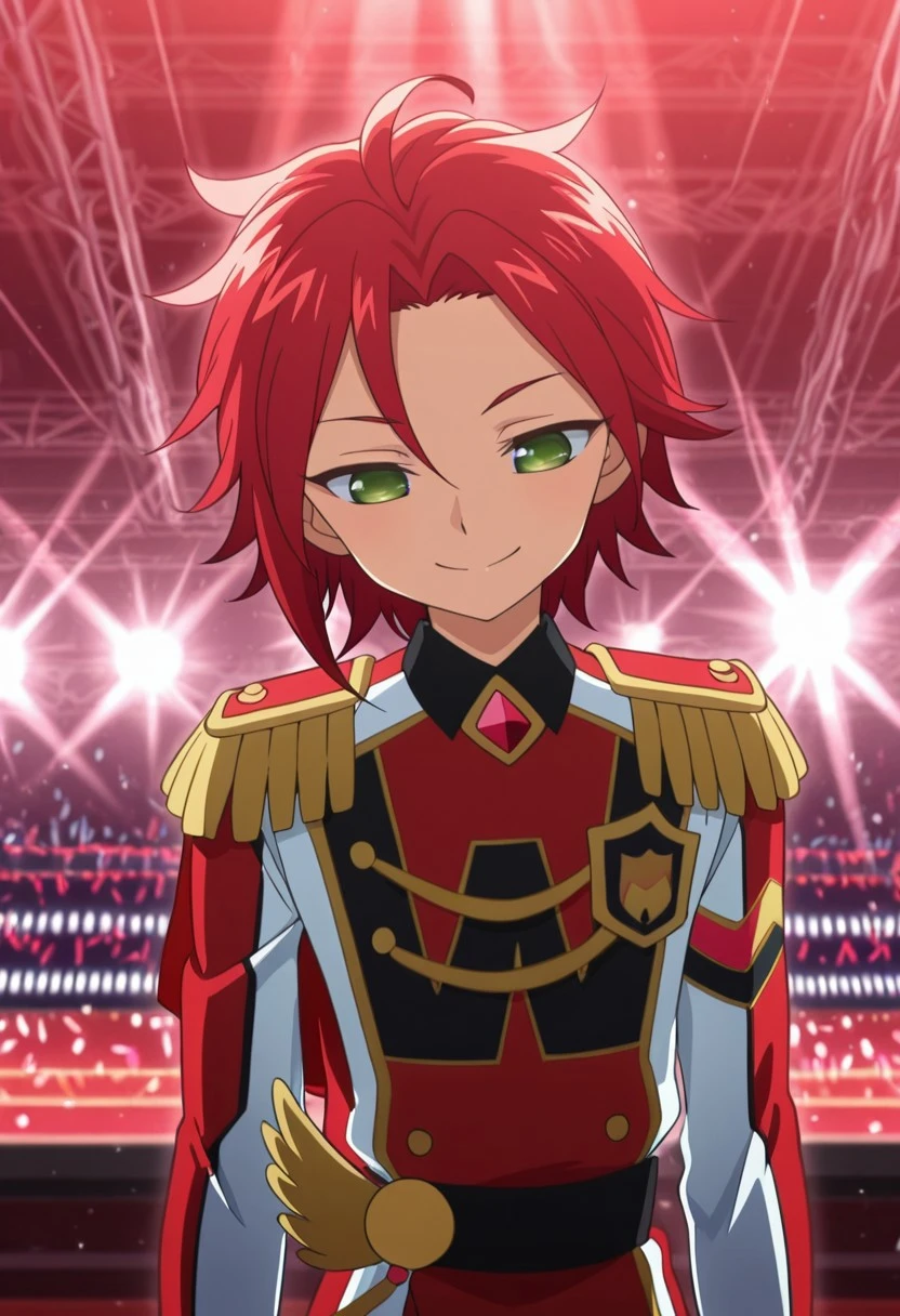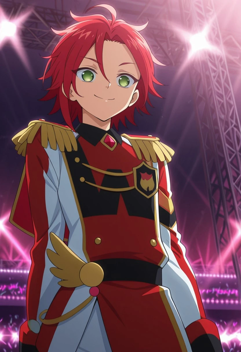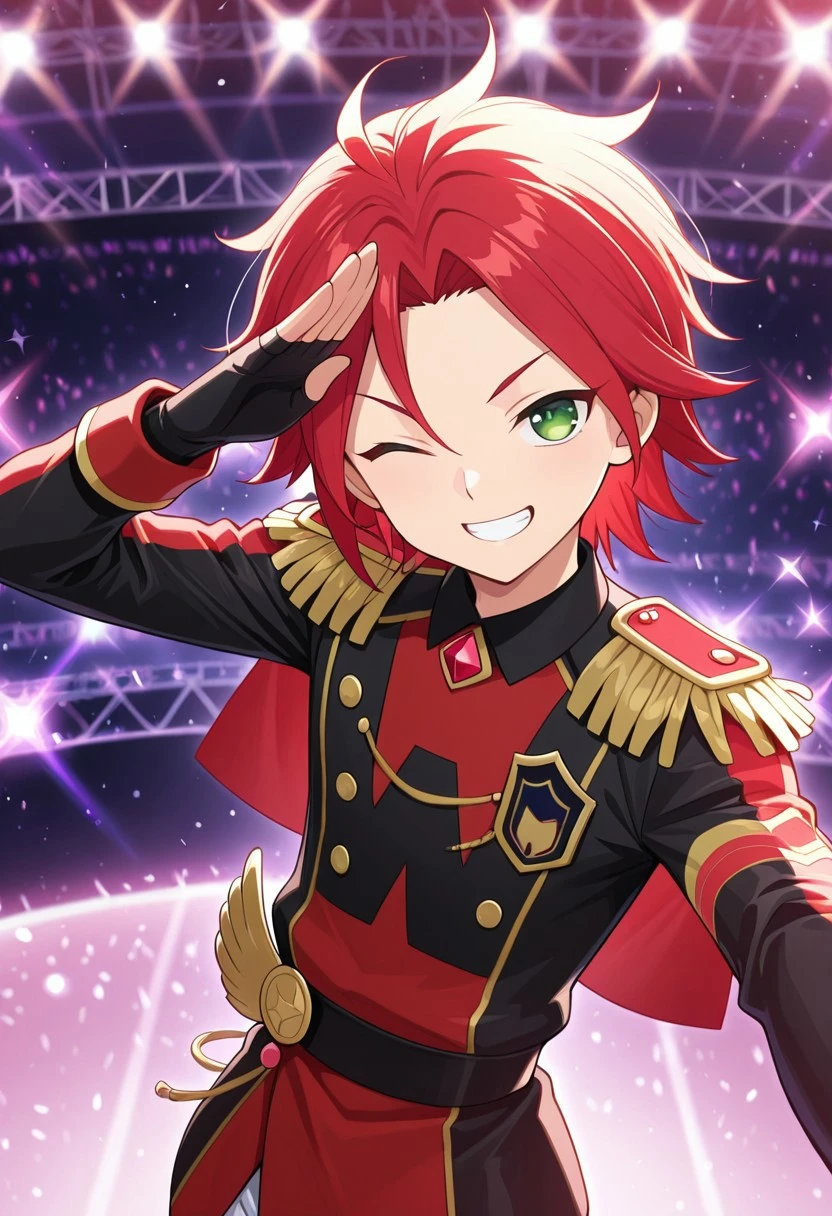 1boy, male focus, solo, green eyes, red hair, idol outfit, epaulettes, red and black jacket, short cape, red cape, belt, black pants, capri pants, ankle boots, black footwear, black gloves, fingerless gloves,