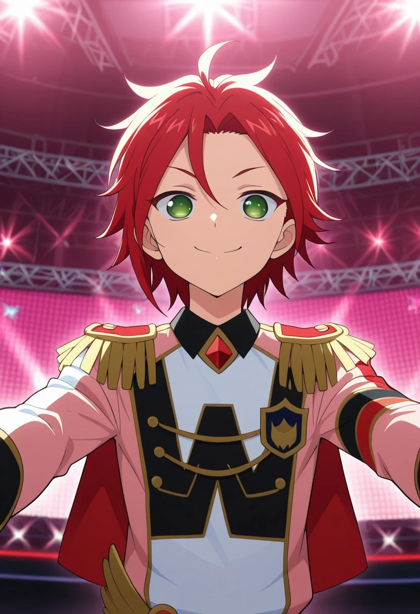 1boy, male focus, solo, green eyes, red hair, idol outfit, epaulettes, pink jacket, short cape, red cape, belt, pink pants, capri pants, ankle boots, black footwear, white gloves, fingerless gloves,