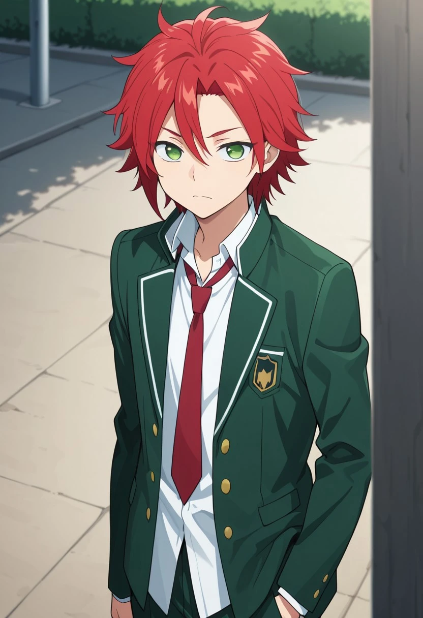 1boy, male focus, solo, green eyes, red hair, school uniform, white shirt, collared shirt, red necktie, green jacket, open jacket, brown pants,