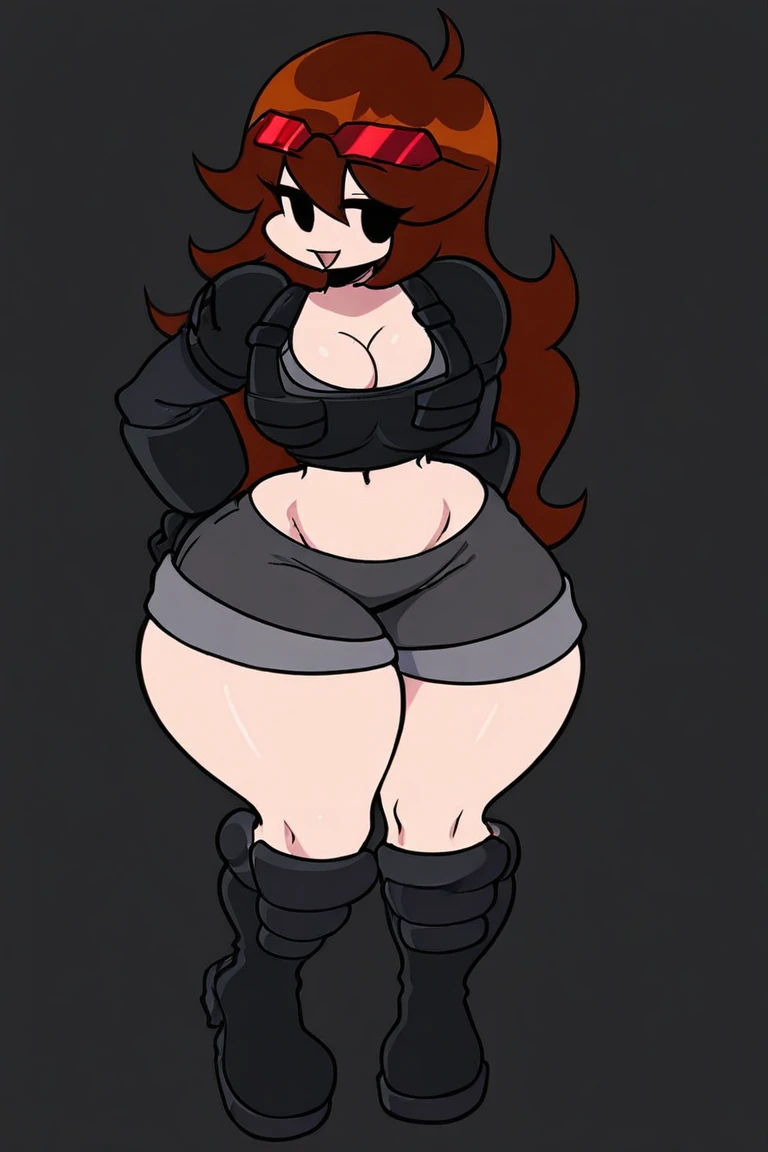GirlfriendFNF, agent gf,solo,1girl,light skin,brown hair,long hair,black eyes,no sclera, sleeves, bubble butt, big breasts, open eyes, gray hot shorts, red glasses, big ass, grey sports bra, body armour, thick thighs, wide hips, black boots,