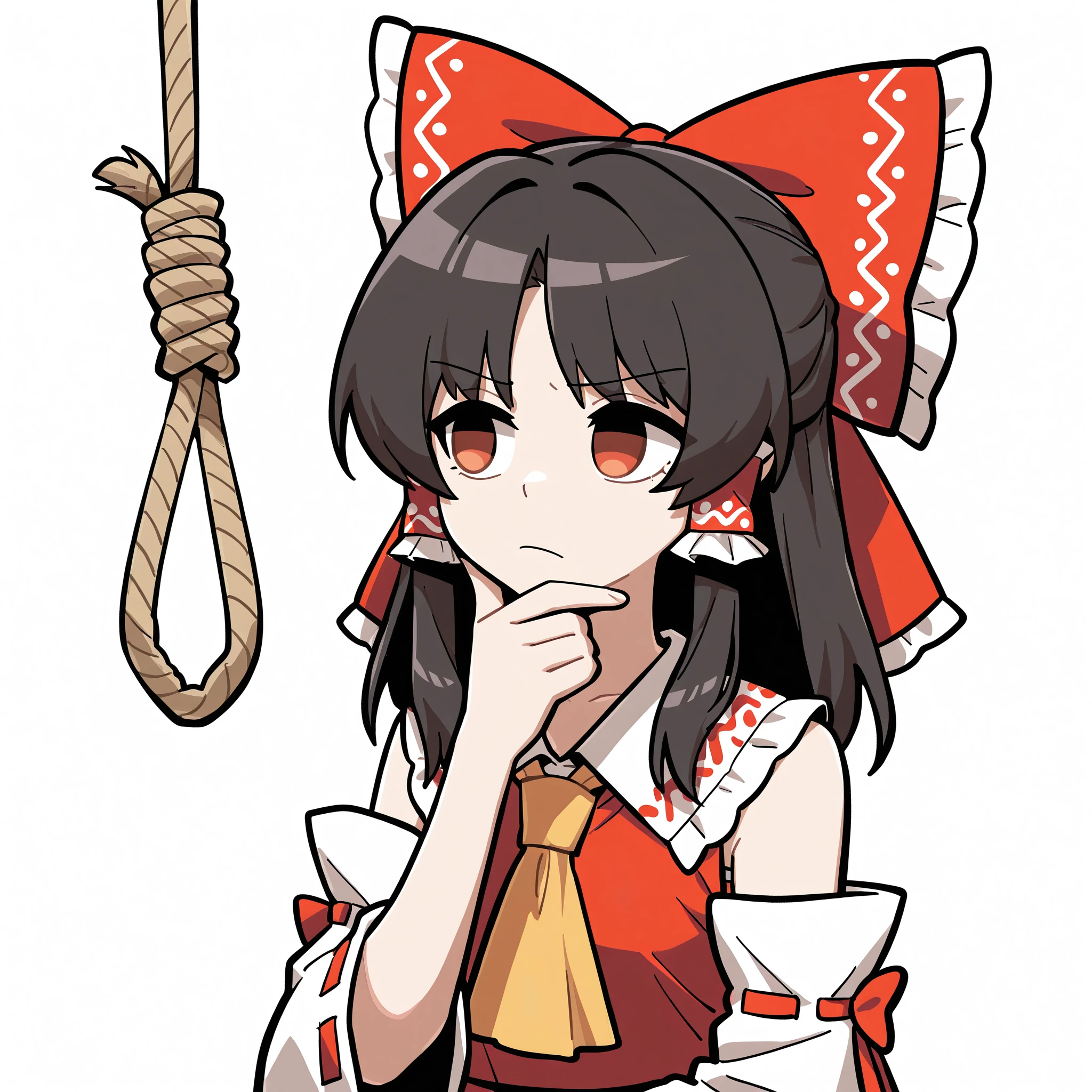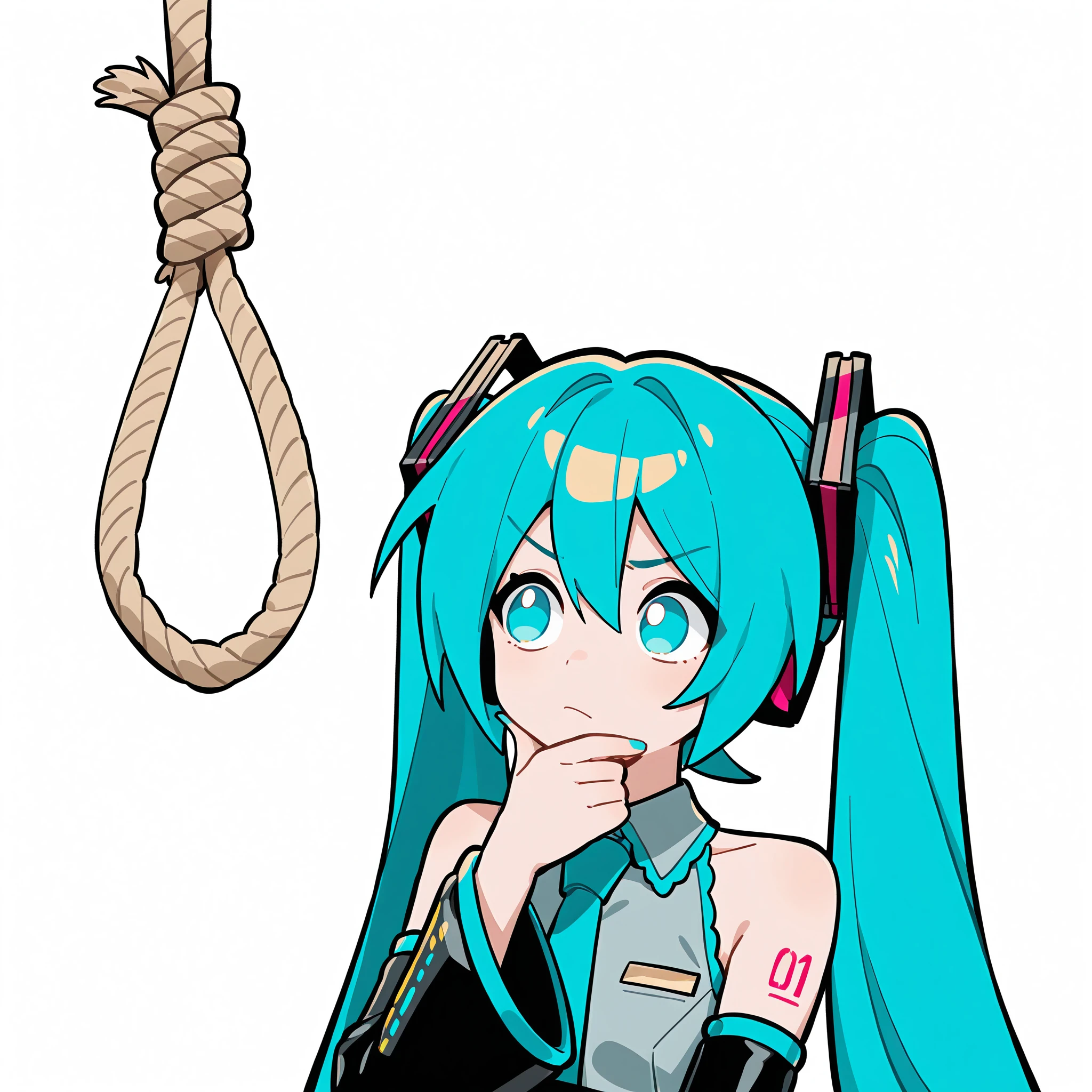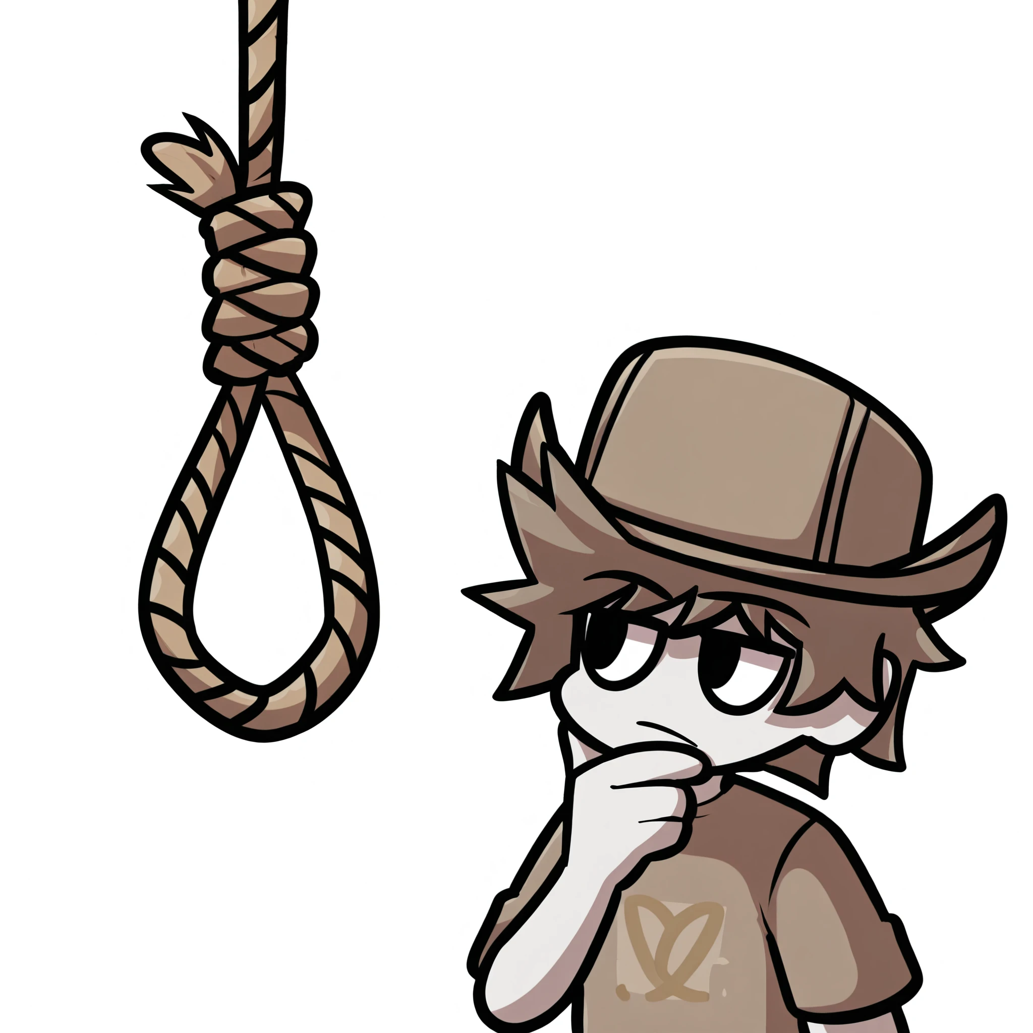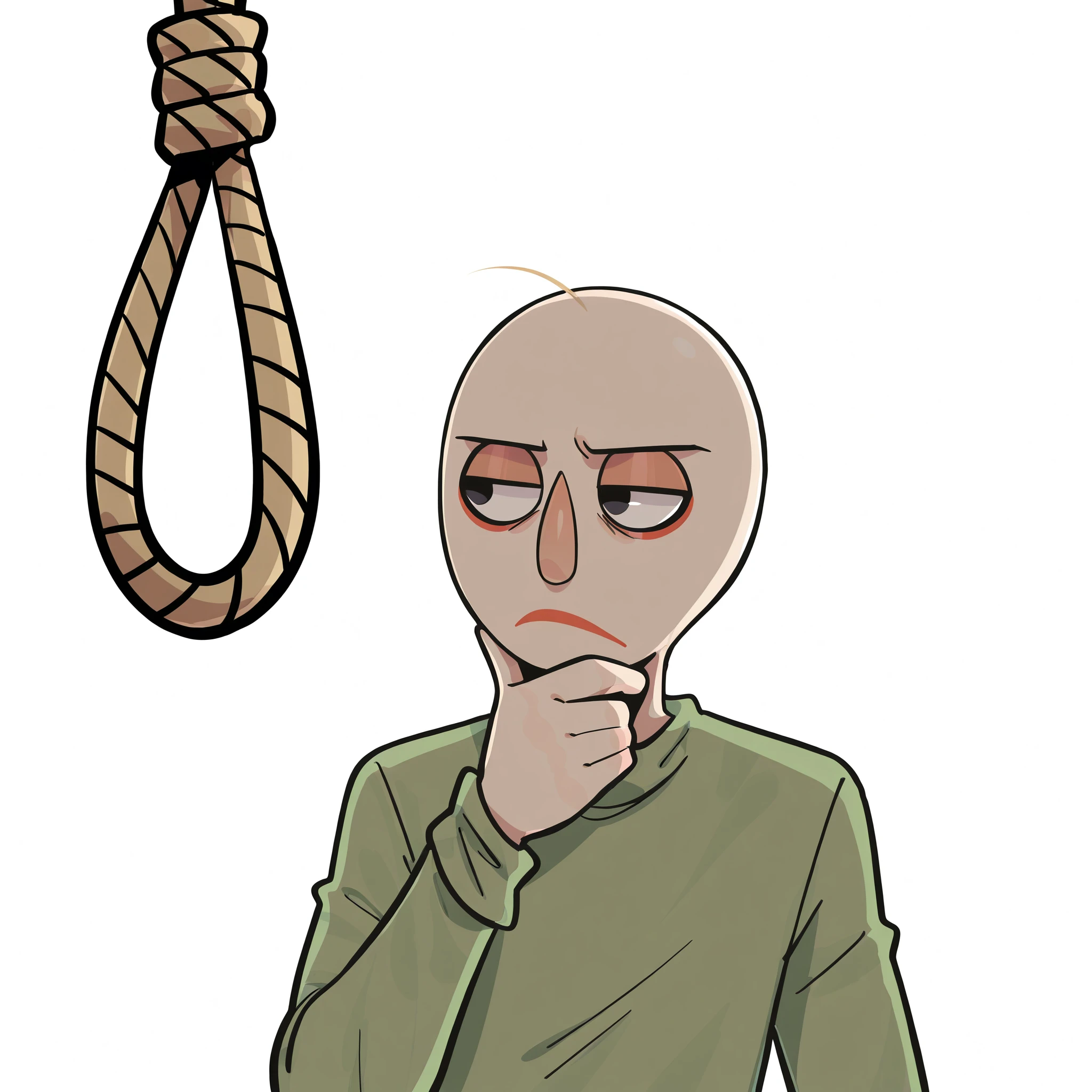 mlaofmd-lora, looking at noose, rope, noose, thinking, looking at object, hand on own chin