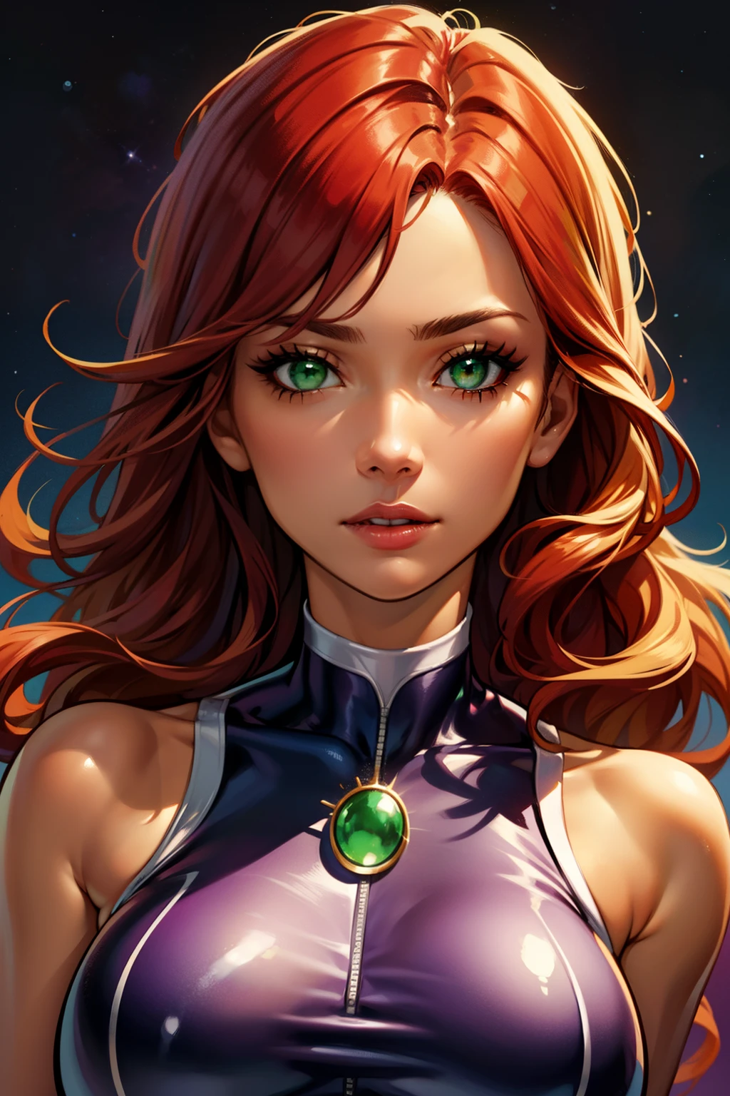 Trigger Words: StarfireDC, green eyes, red hair, glowing eyes tan skin, large breasts, (purple crop top:1.2), green pearl, bare shoulders, midriff, purple miniskirt, purple thighhighs, belt