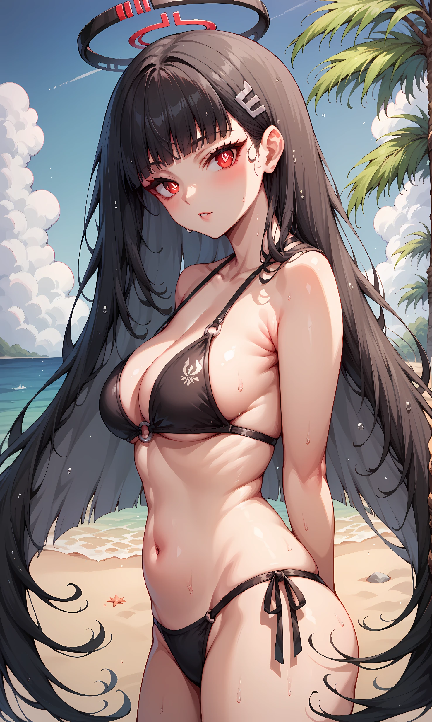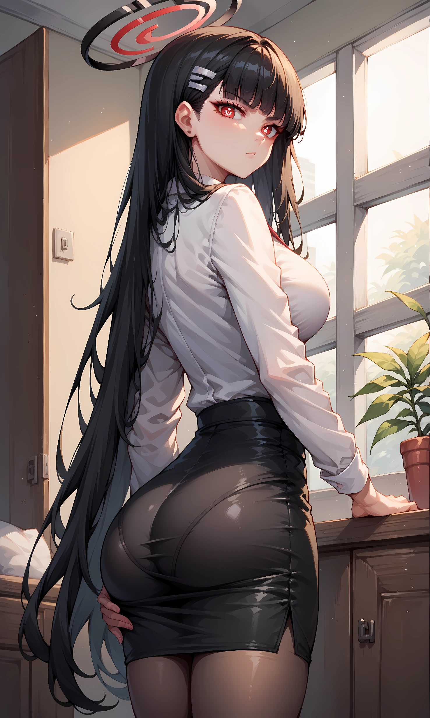 rio, red eyes, bright pupils, black hair, very long hair, blunt bangs, hairclip, halo