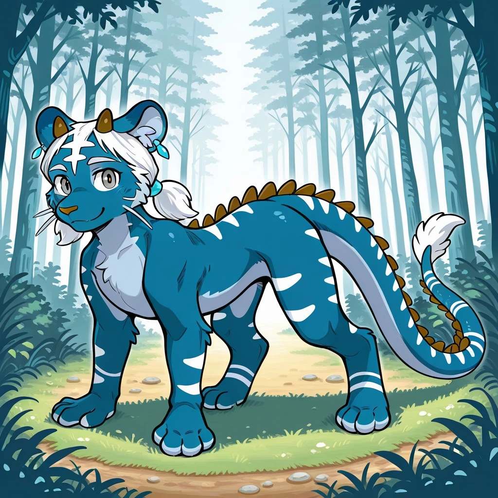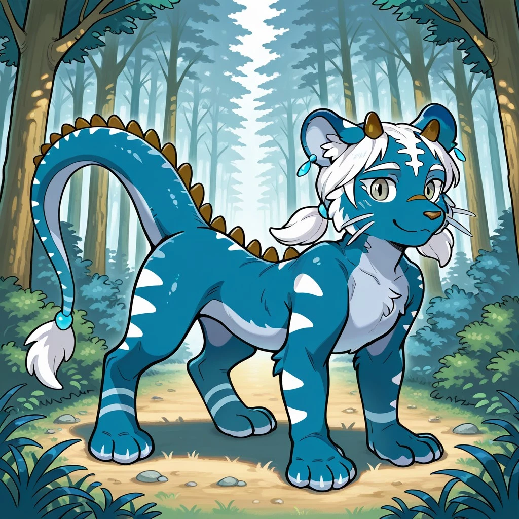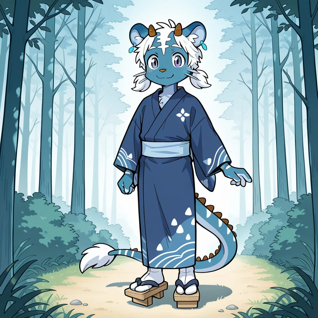 tiger, dragon, blue and white fur, gray eyes, white hair, twintails, brown nose, brown horns, whiskers, animal ears, blue earrings, dragon tail, blue kimono, sash, yukata,