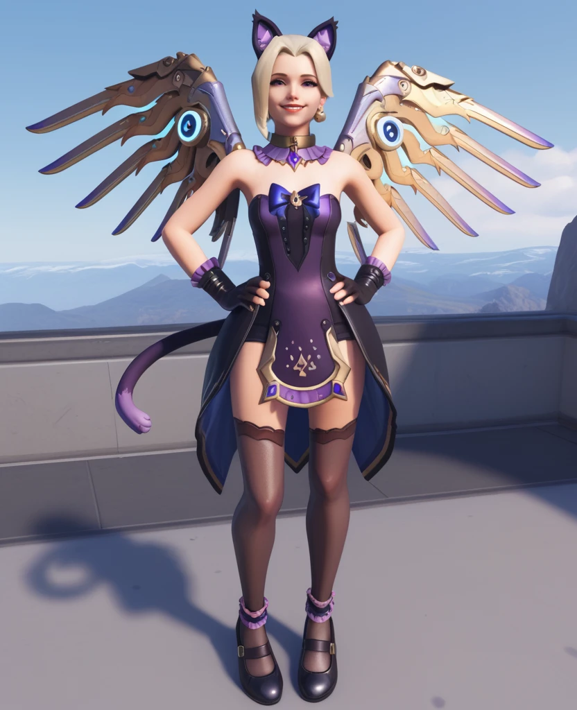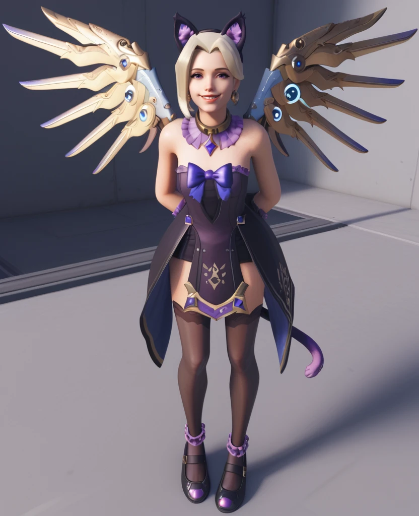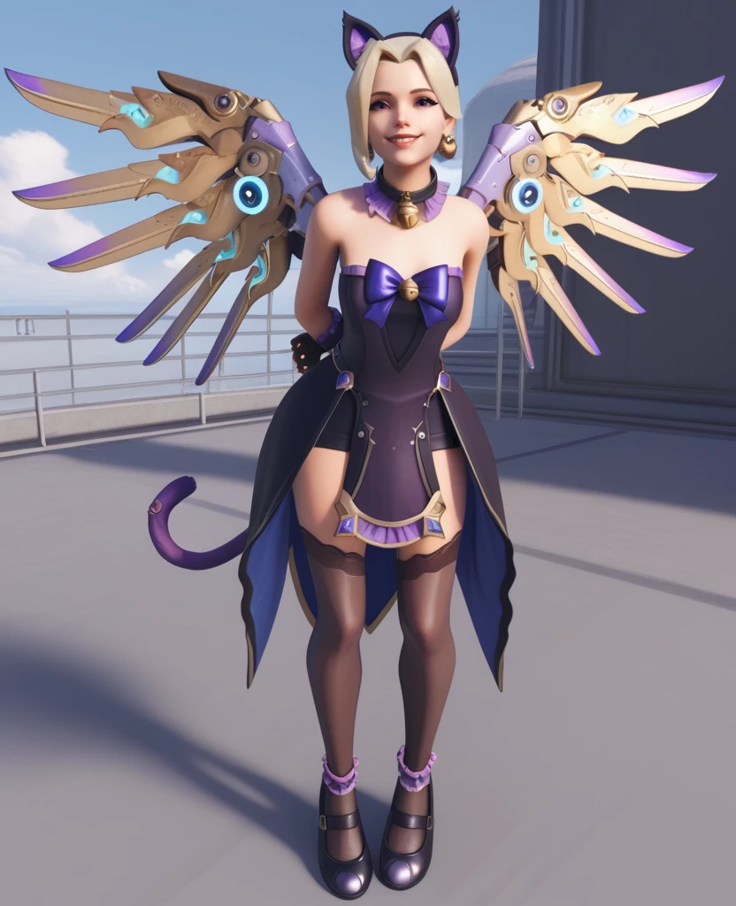 bcmer, 1girl, blonde hair, cat ears, purple eyes, earrings, short hair, fingerless gloves, frilled gloves, ankle cuffs, shoes, dress, bow, tail, thighhighs, pelvic curtain, collar, mechanical wings,