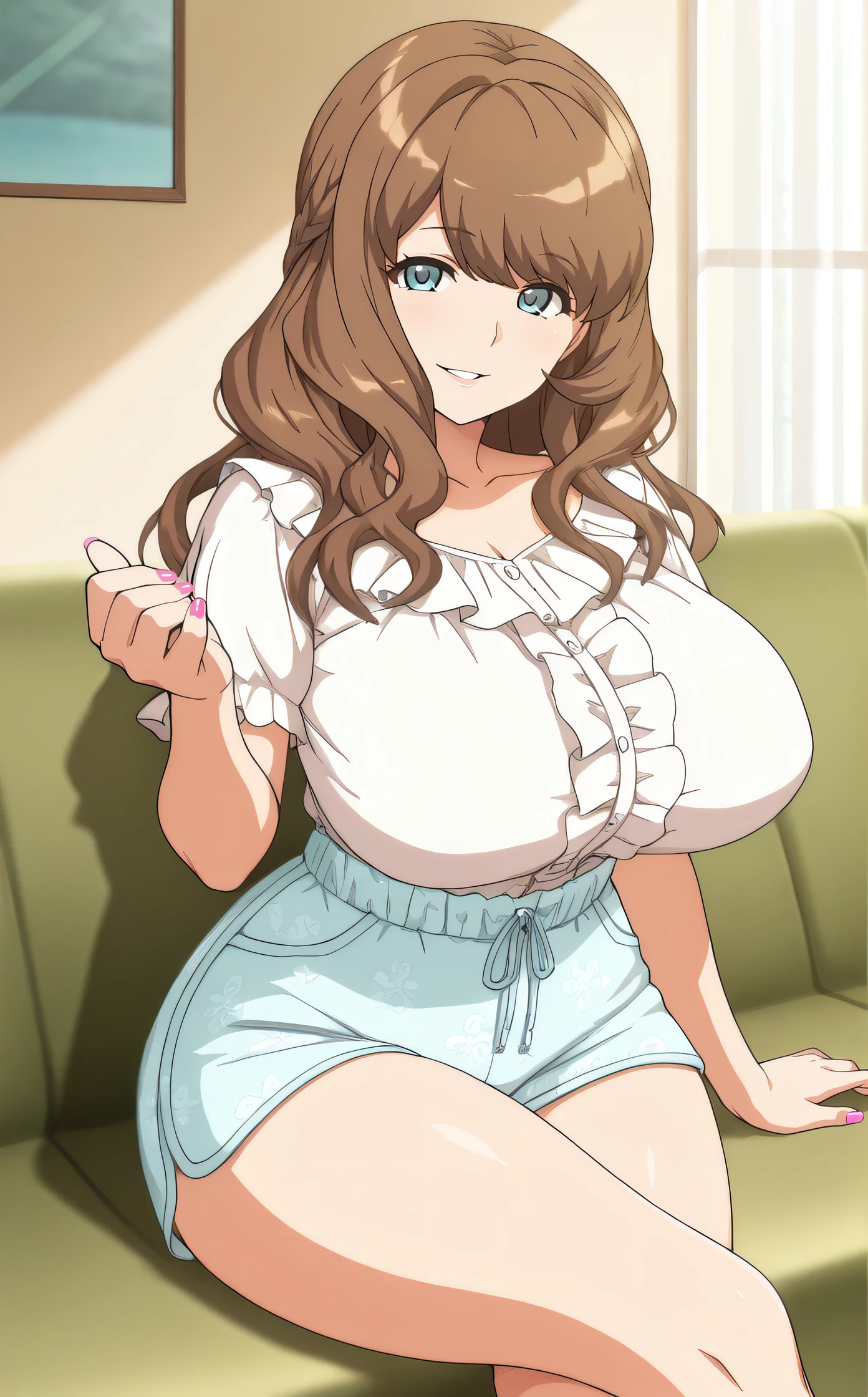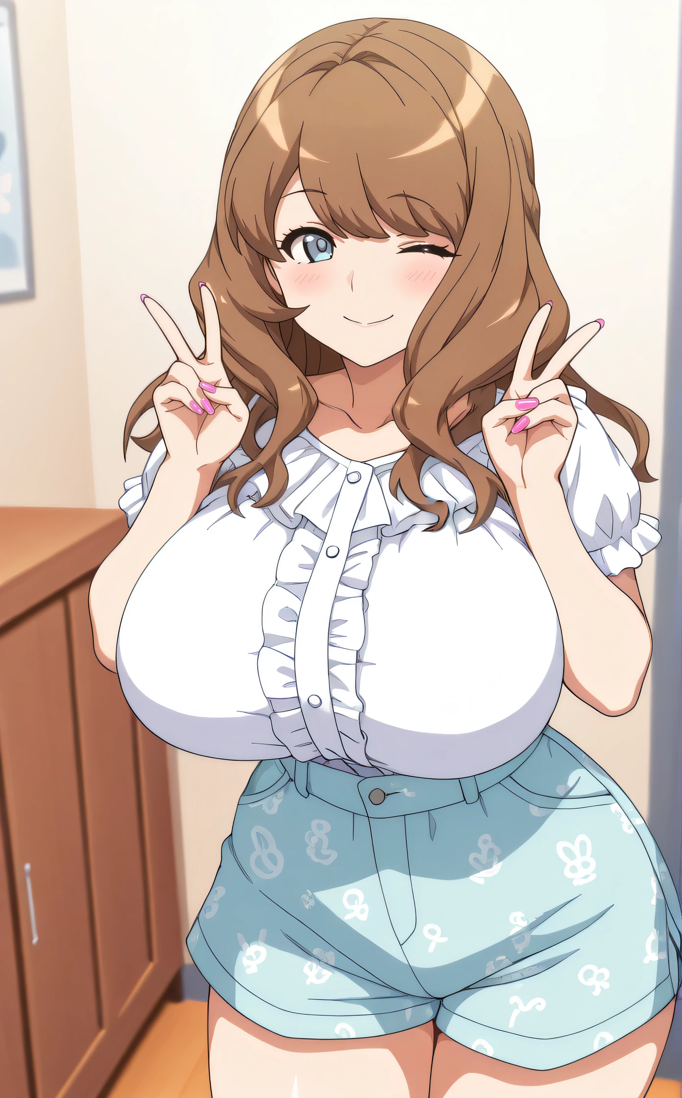 white frilled shirt, short sleeves, light blue shorts, printed shorts