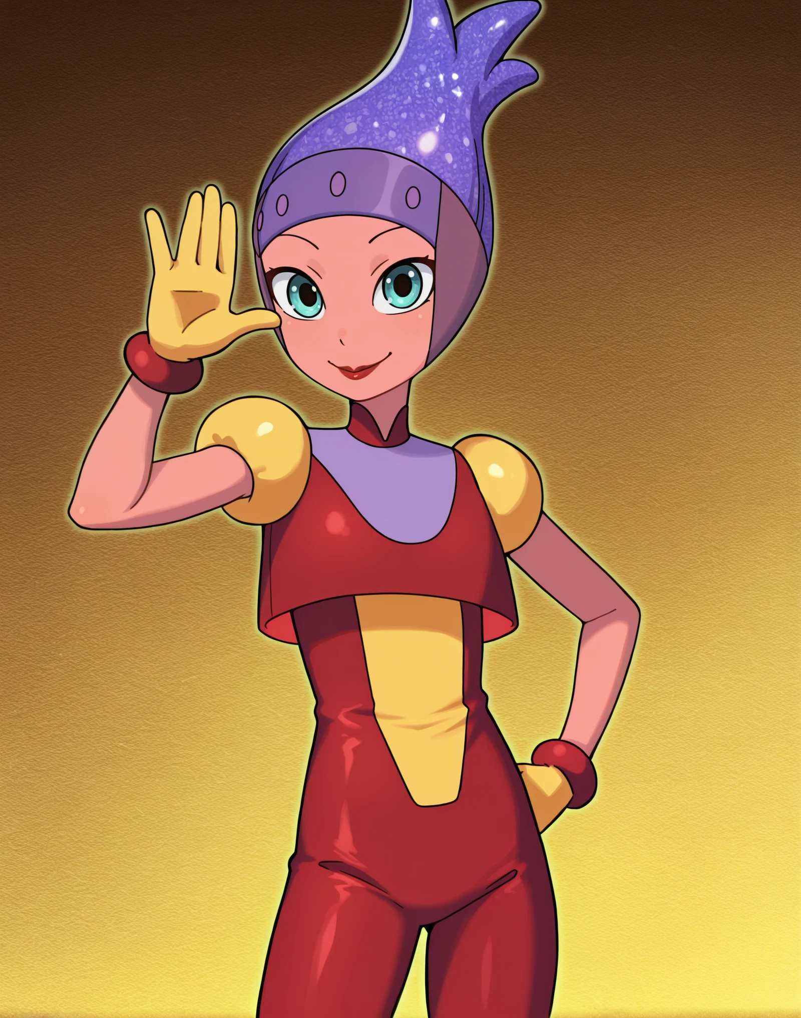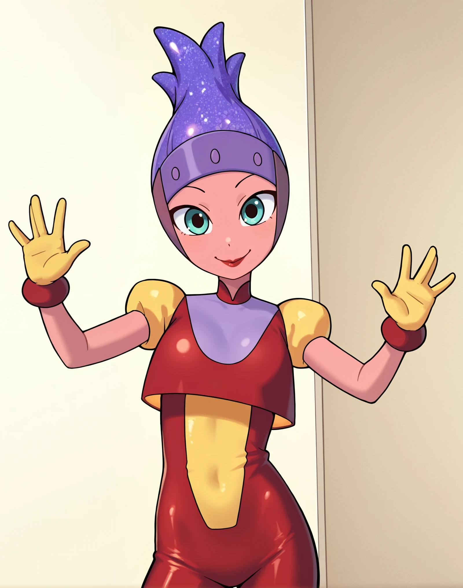 NeptunaHydro, female, 1girl, aqua eyes, red lips, yellow gloves, , pink skin