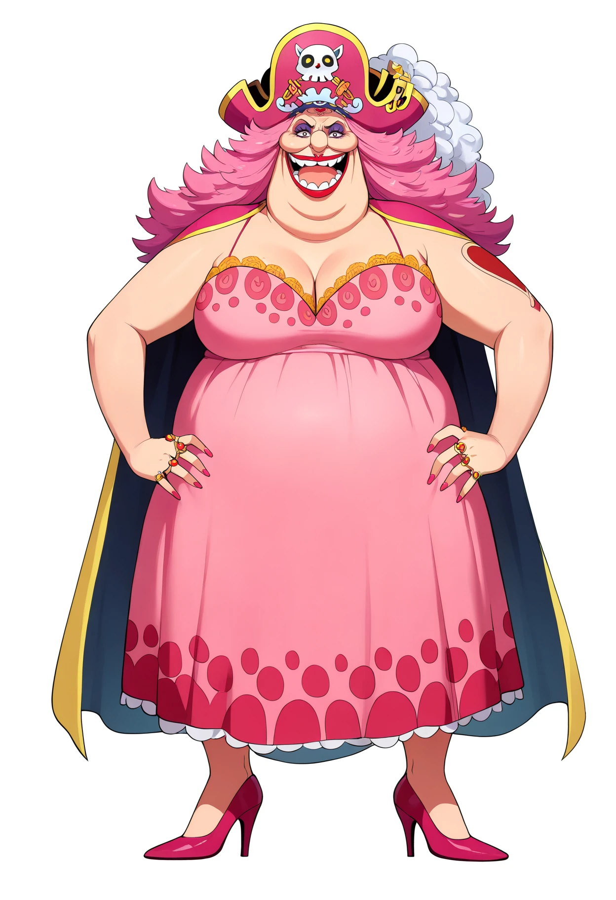 Basic prompts : 1girl, bigmom, pink hair, makeup, long hair, brown eyes, lipstick, fat