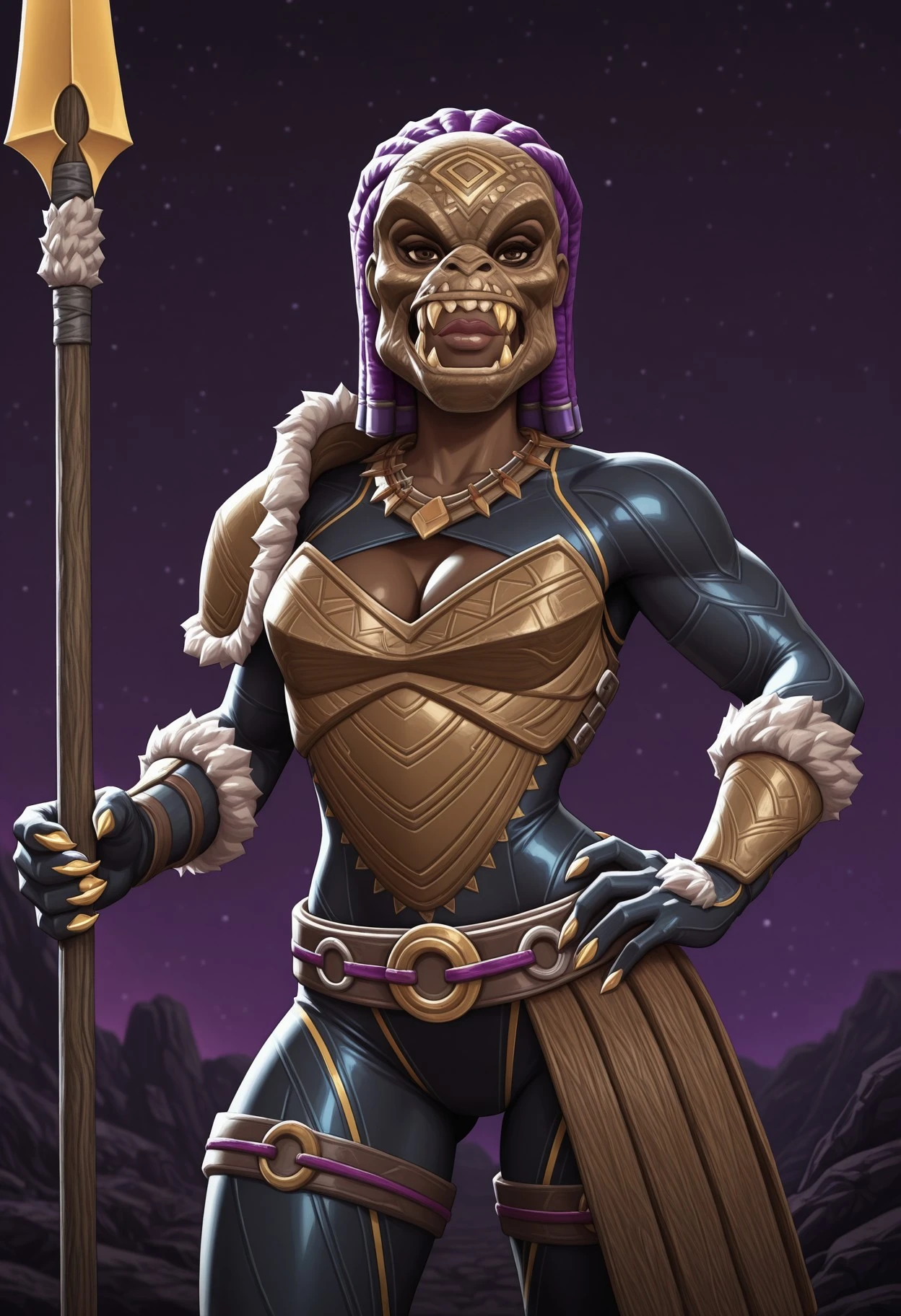1girl, solo, purple_hair, dreadlocks, wooden gorilla mask, fake teeth, lips, closed mouth, dark-skinned female, ebony female, brown eyes, black , gold trim, necklace, cleavage window, cleavage cutout, wooden armor, breastplate, fur trim, pauldron, belt, gold claws,