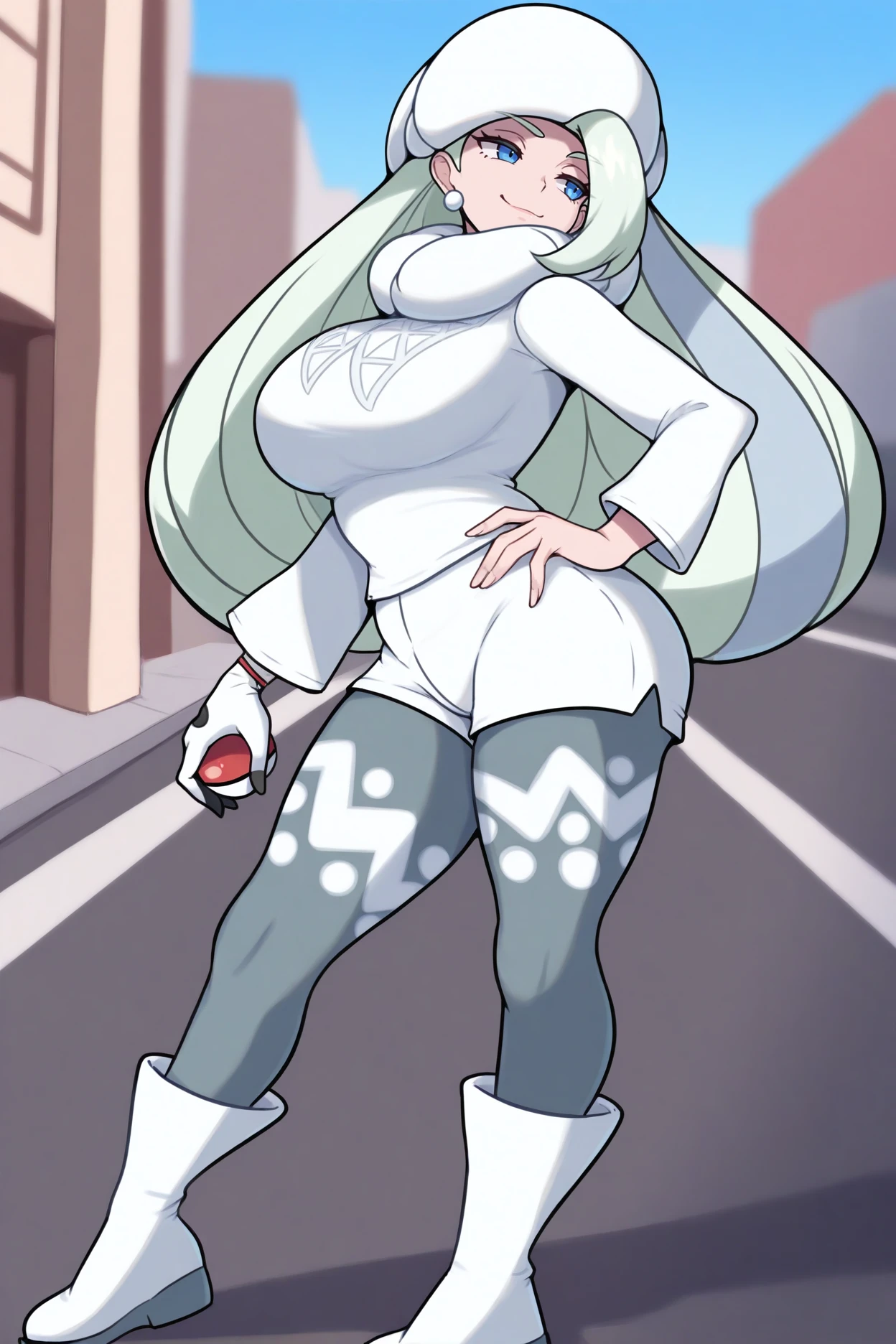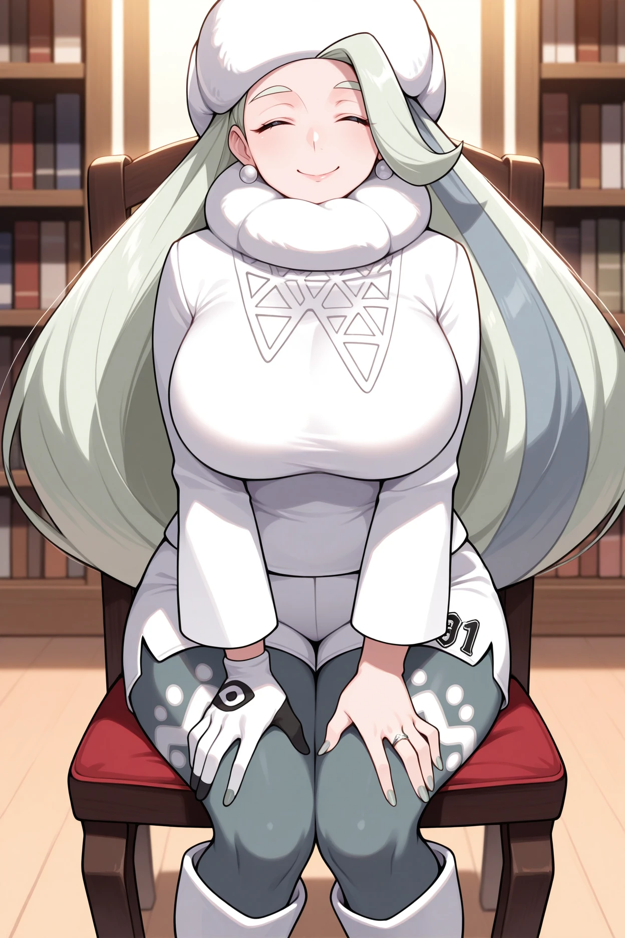 Add "fur hat, white headwear, pearl earrings, white neck pillow, white sweater, white shorts, single glove, grey leggings, print legwear, white boots, wedding ring" for her typical look.