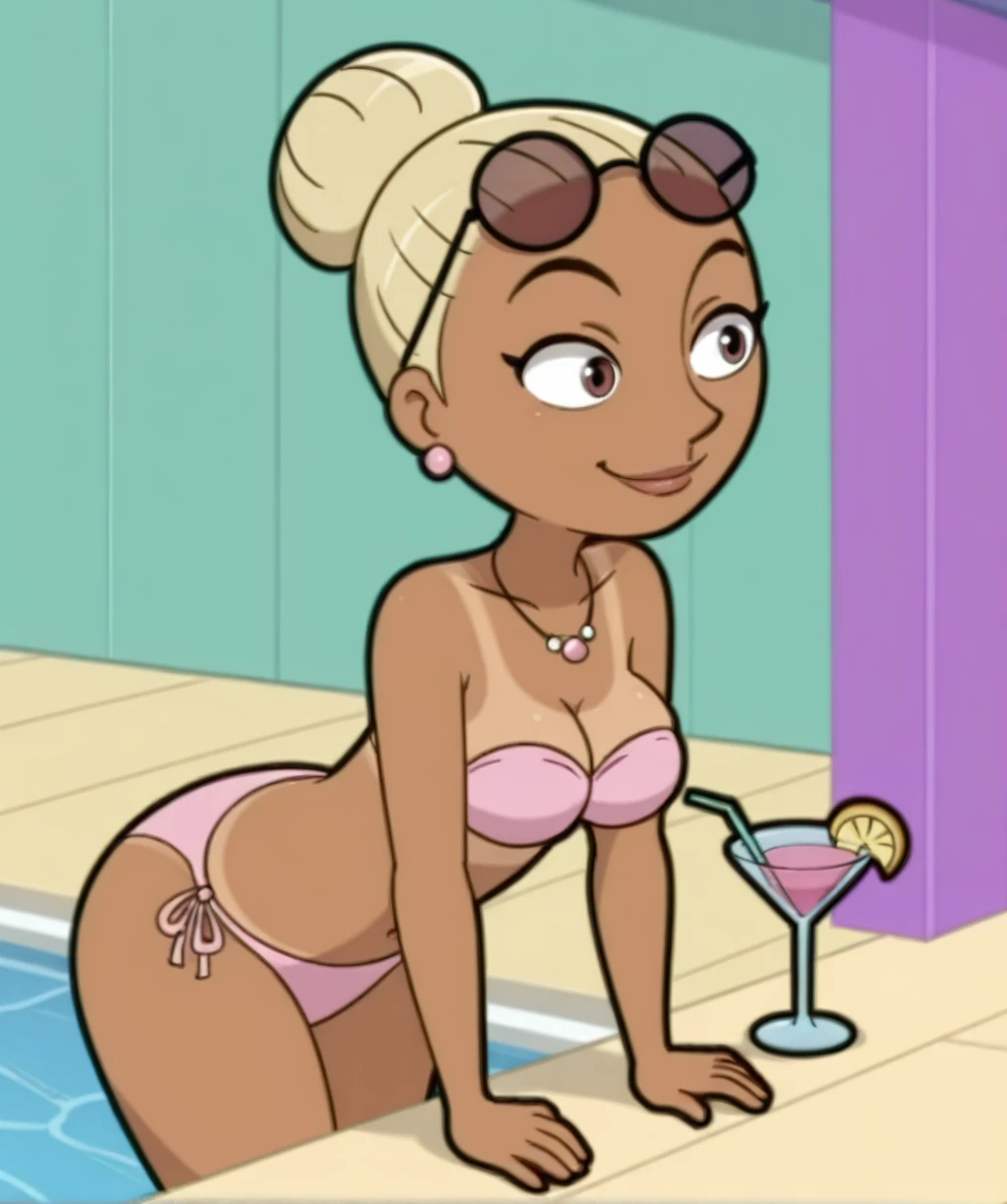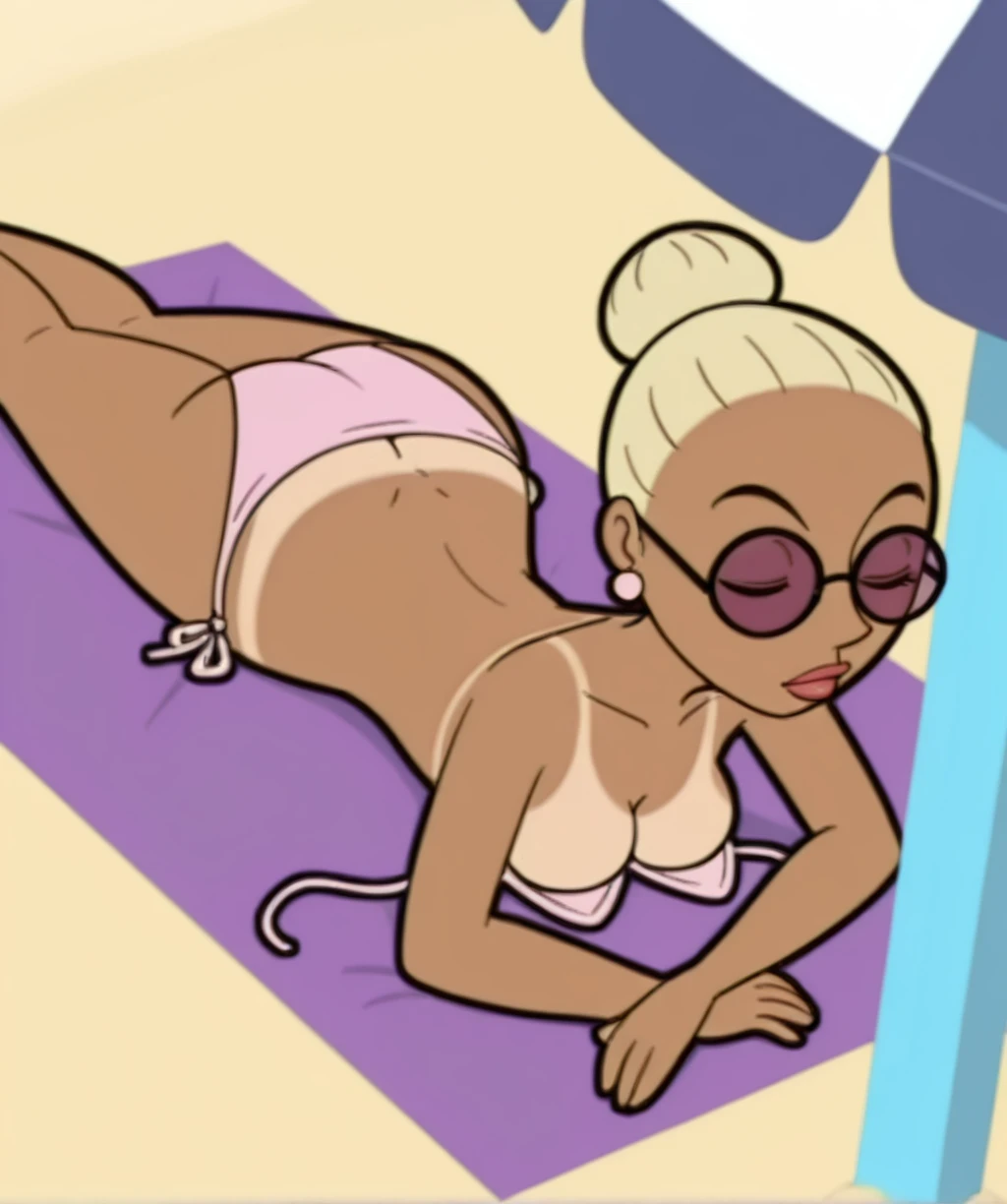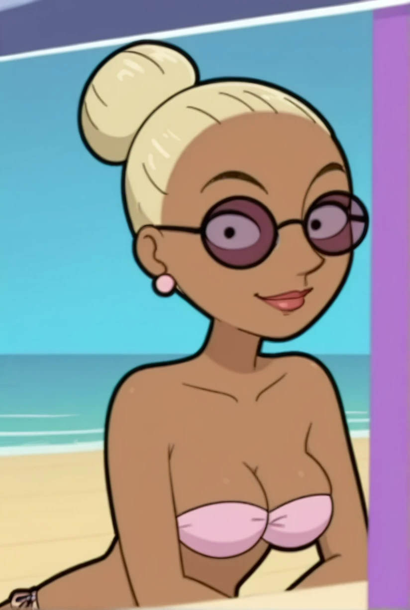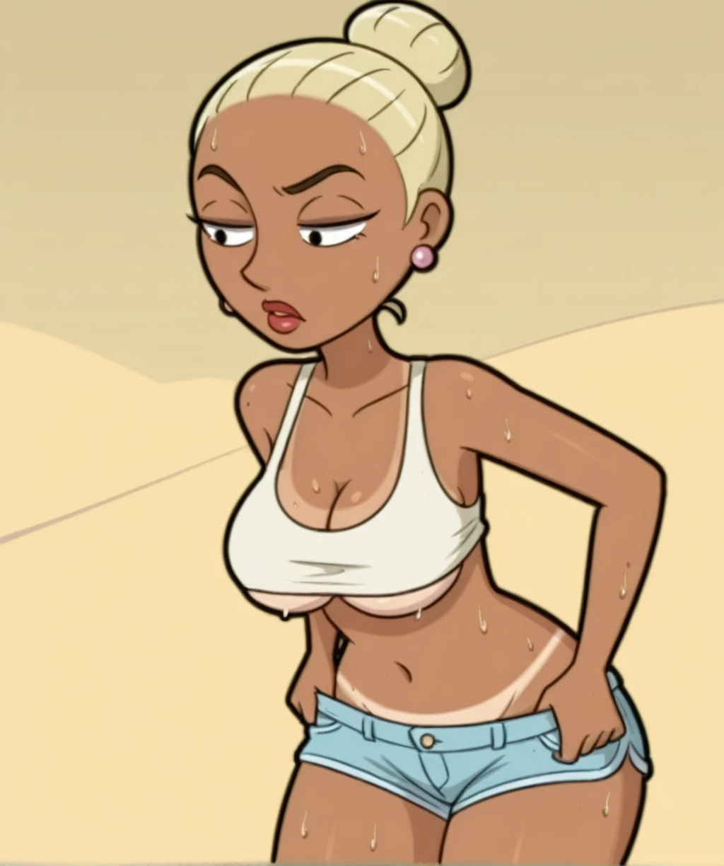 She’s a dark-skinned female with blonde hair styled in a single hair bun, usually seen in bikinis or casual swimsuits.