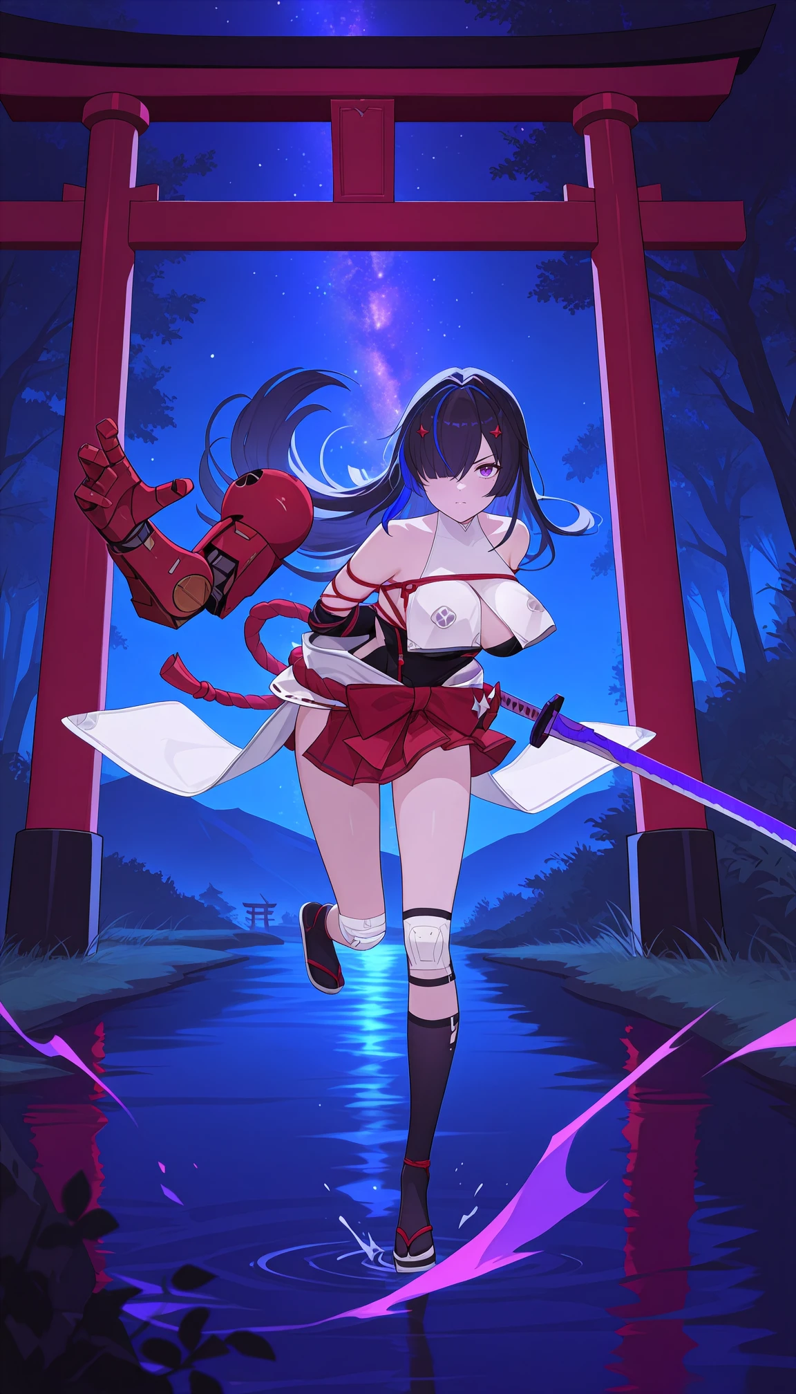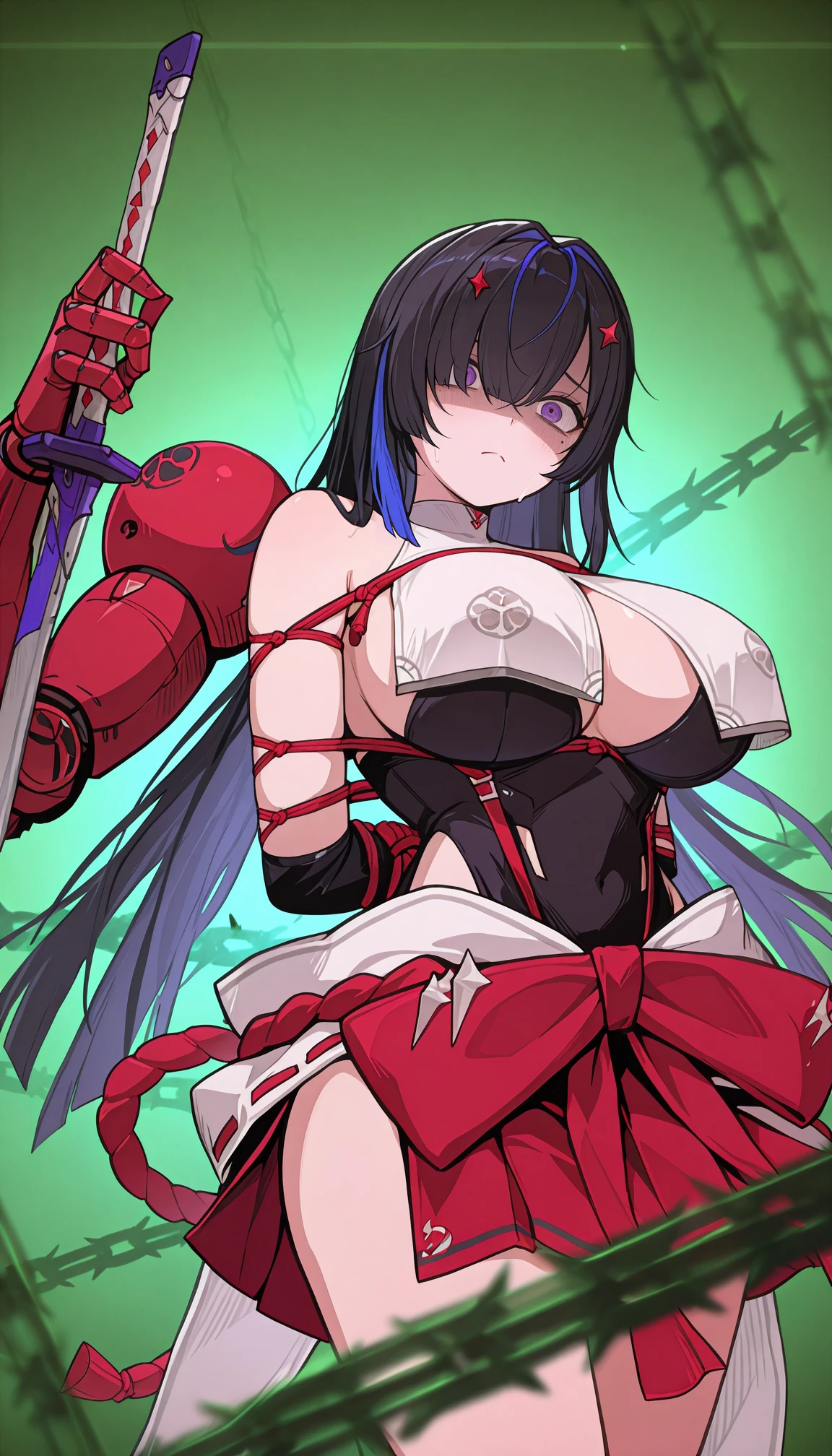 chzrczn, purple eyes, black hair, purple hair, streaked hair, colored inner hair, long hair, blunt bangs, hair intakes, hair over one eye, hair ornament, turtleneck, curtains, chest harness, shibari, bondage, red rope, restrained, bound arms, arms behind back, sideboob, innerboob, black leotard, clothing cutout, side cutout, red suspenders, black gloves, elbow gloves, red arm guards, shimenawa, red bow, kimono around waist, hakama skirt, red skirt, side slit, miniskirt,