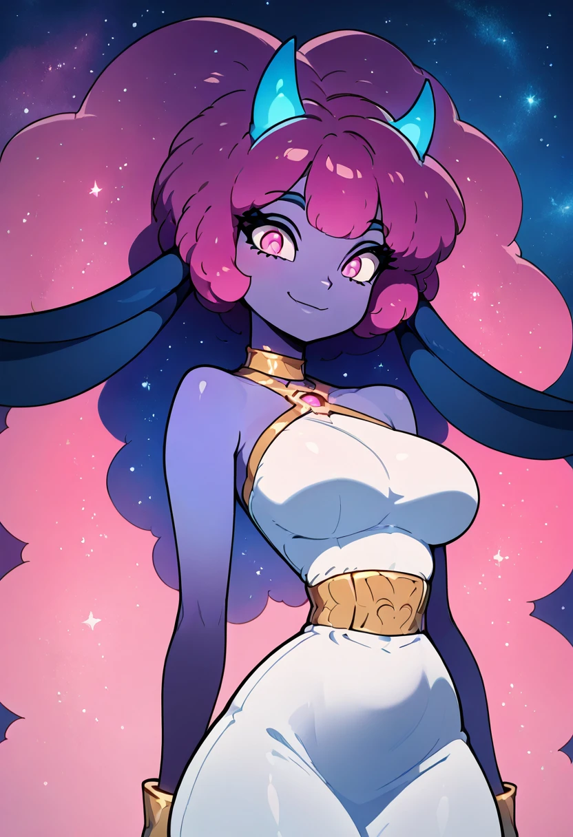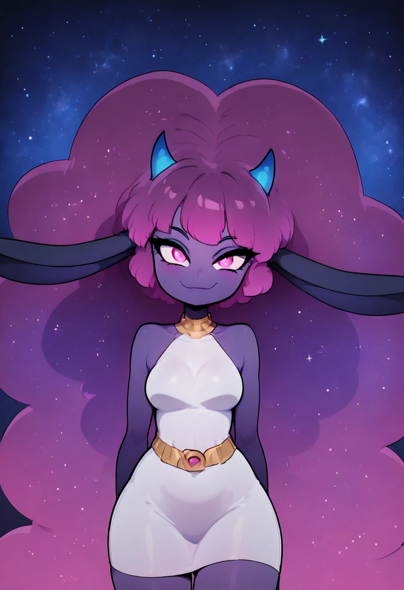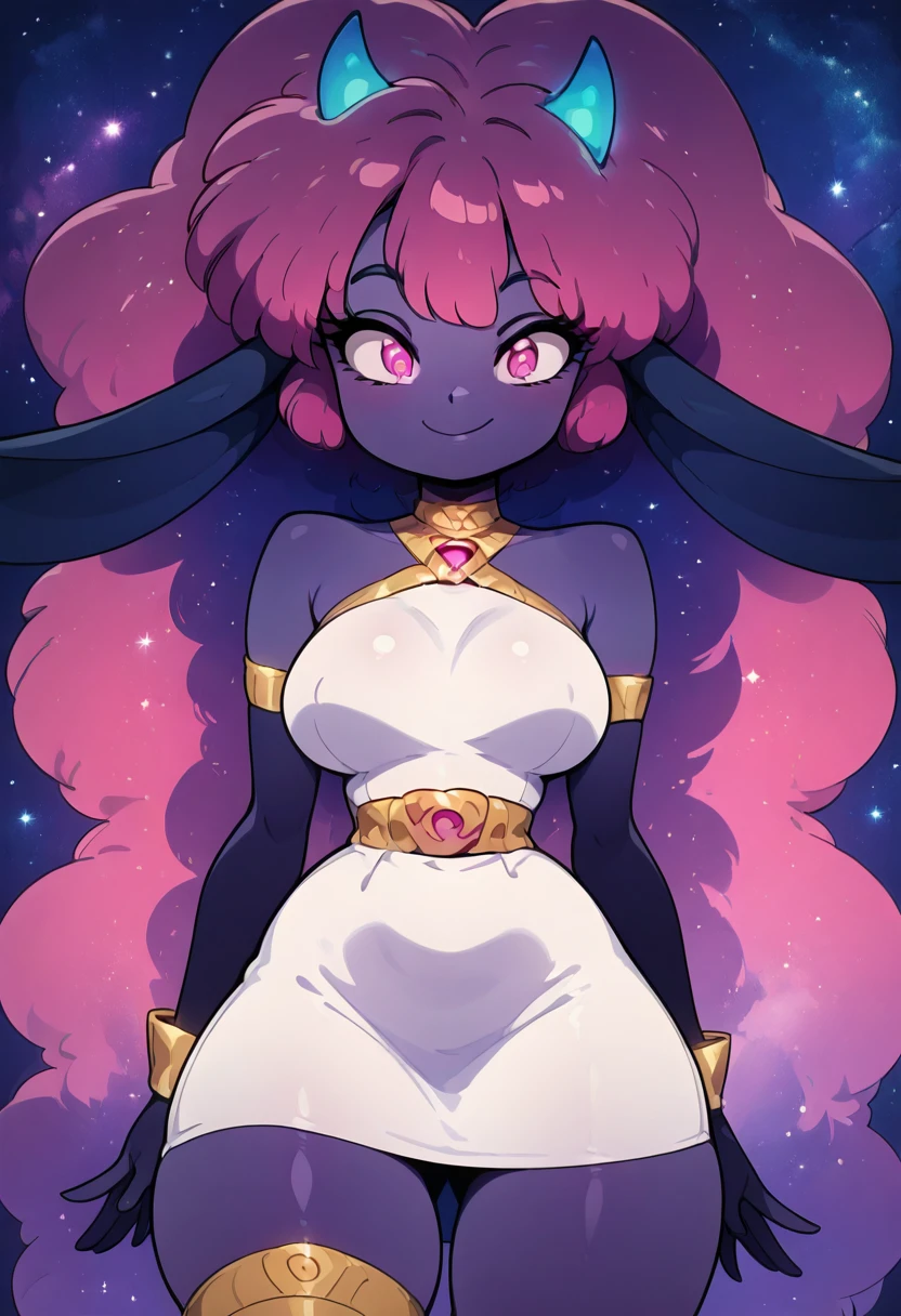 zzDaedreamCitronOC, long floating hair, big hair, purple skin, 1girl, blue horns, glowing pink hair, glowing, pink eyes, gradient hair, purple hair, starry hair, animal ears, long ears, white dress,