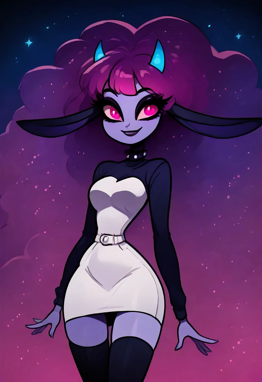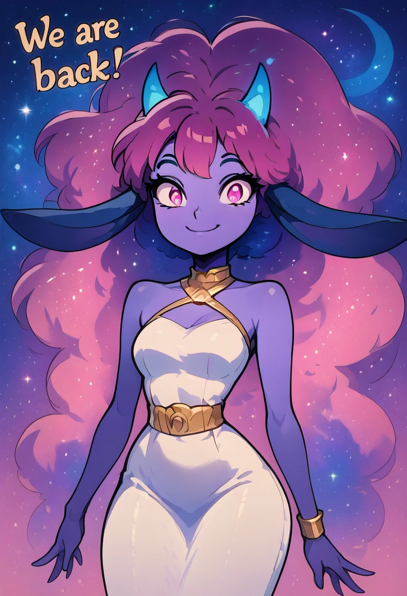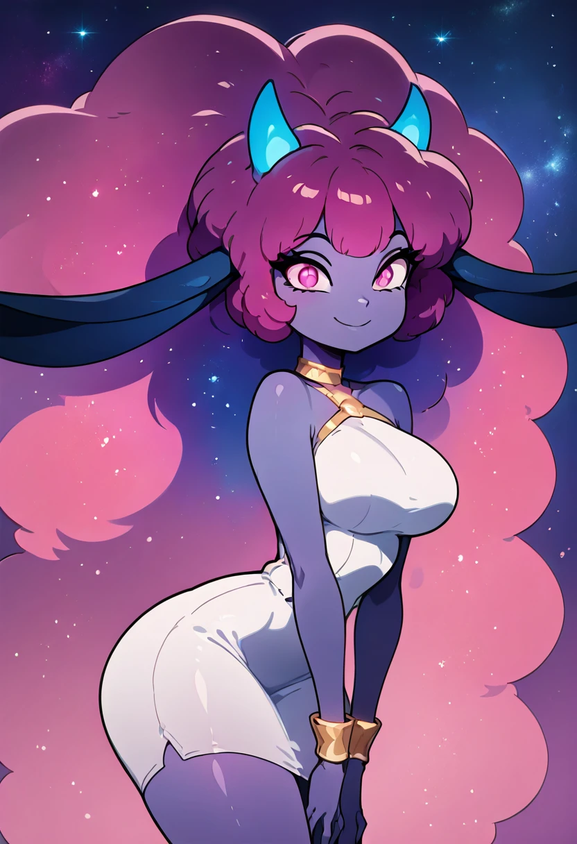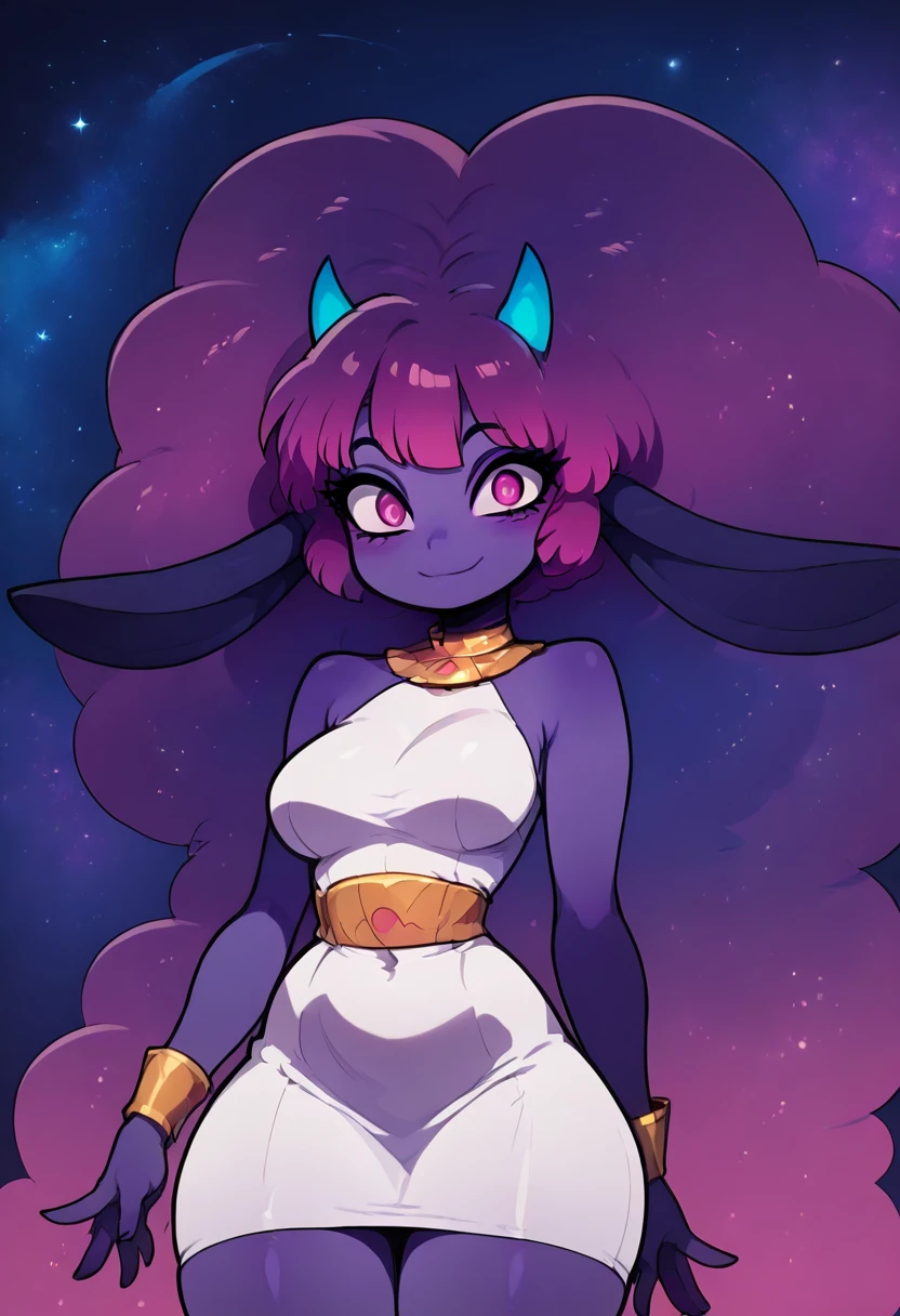 zzDaedreamCitronOC, long floating hair, big hair, purple skin, 1girl, blue horns, glowing pink hair, glowing, pink eyes, gradient hair, purple hair, starry hair, animal ears, long ears, white dress,