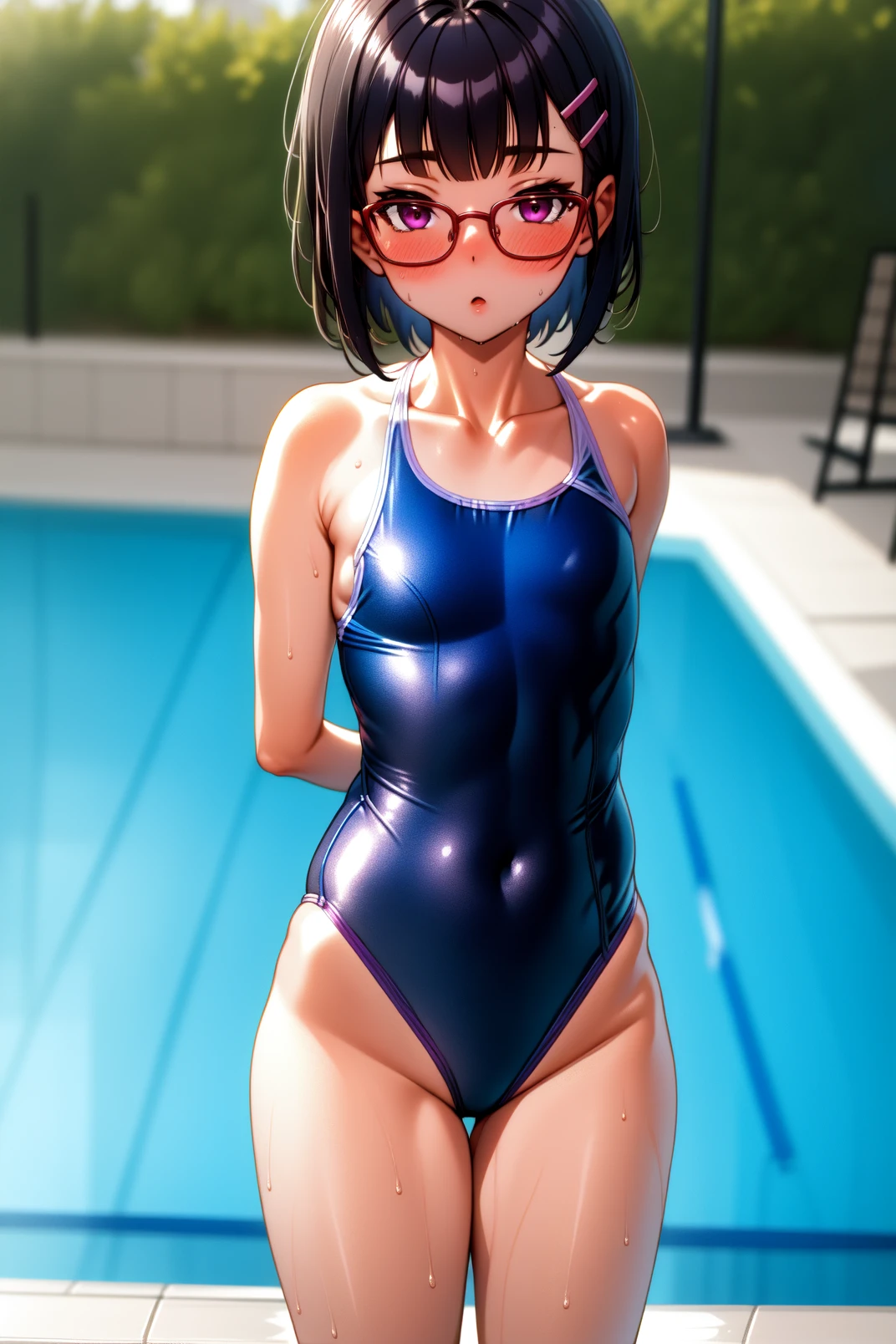 sona, purple eyes, black hair, short hair, glasses, hair clip