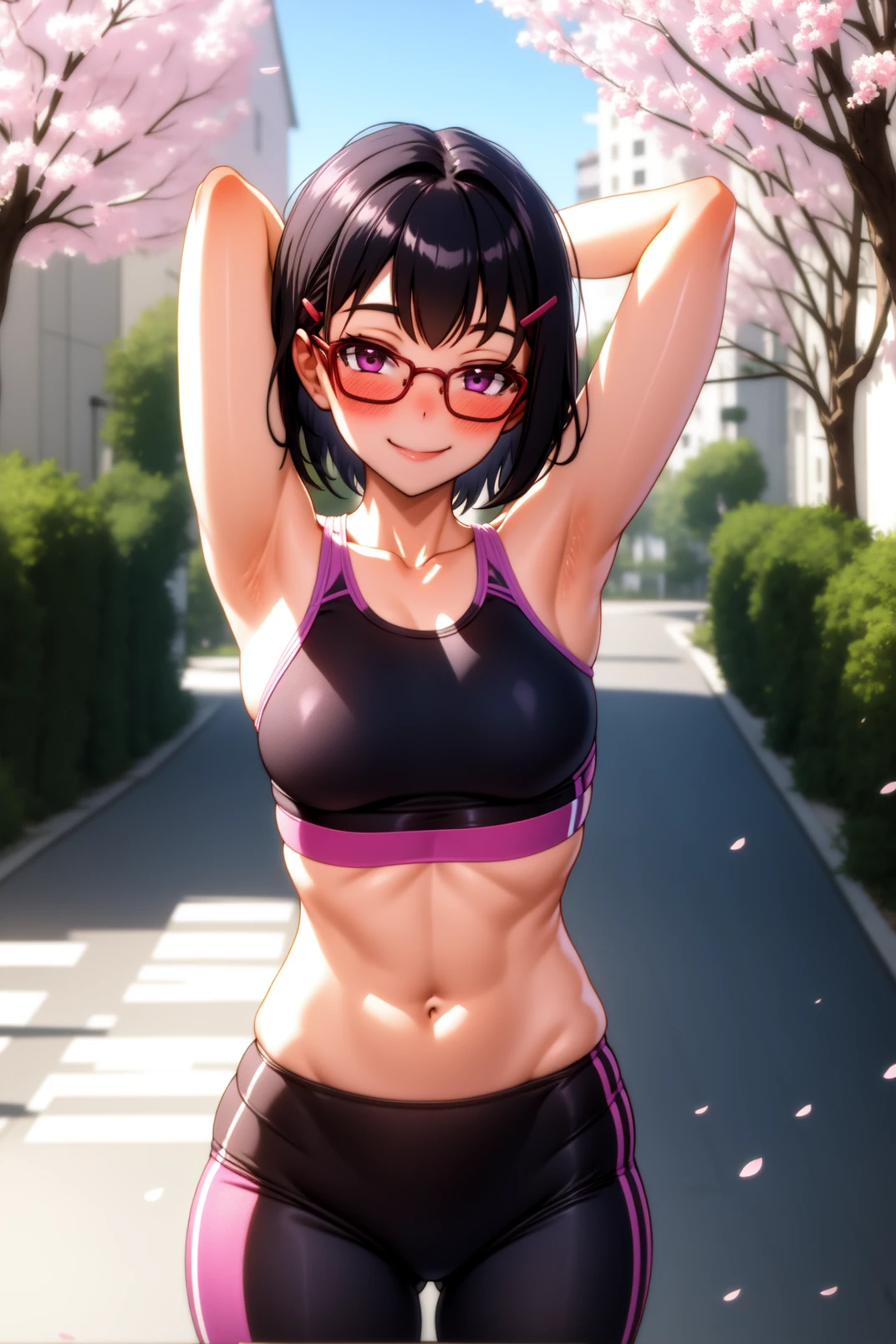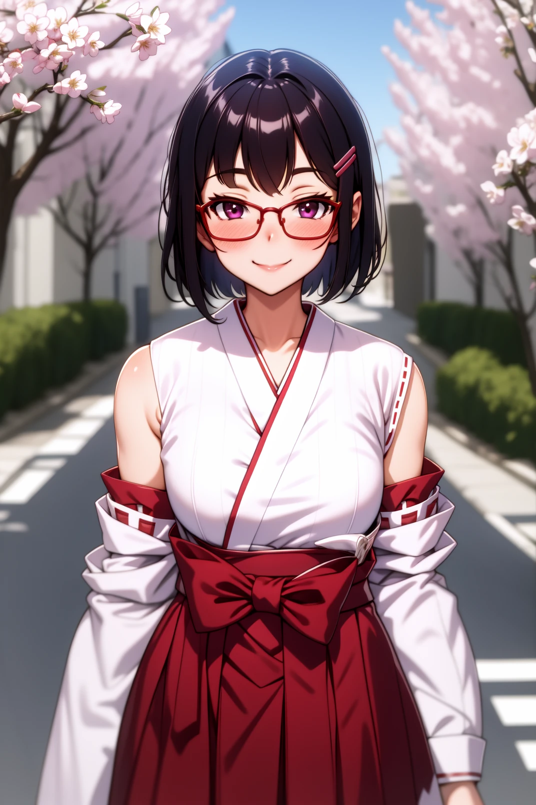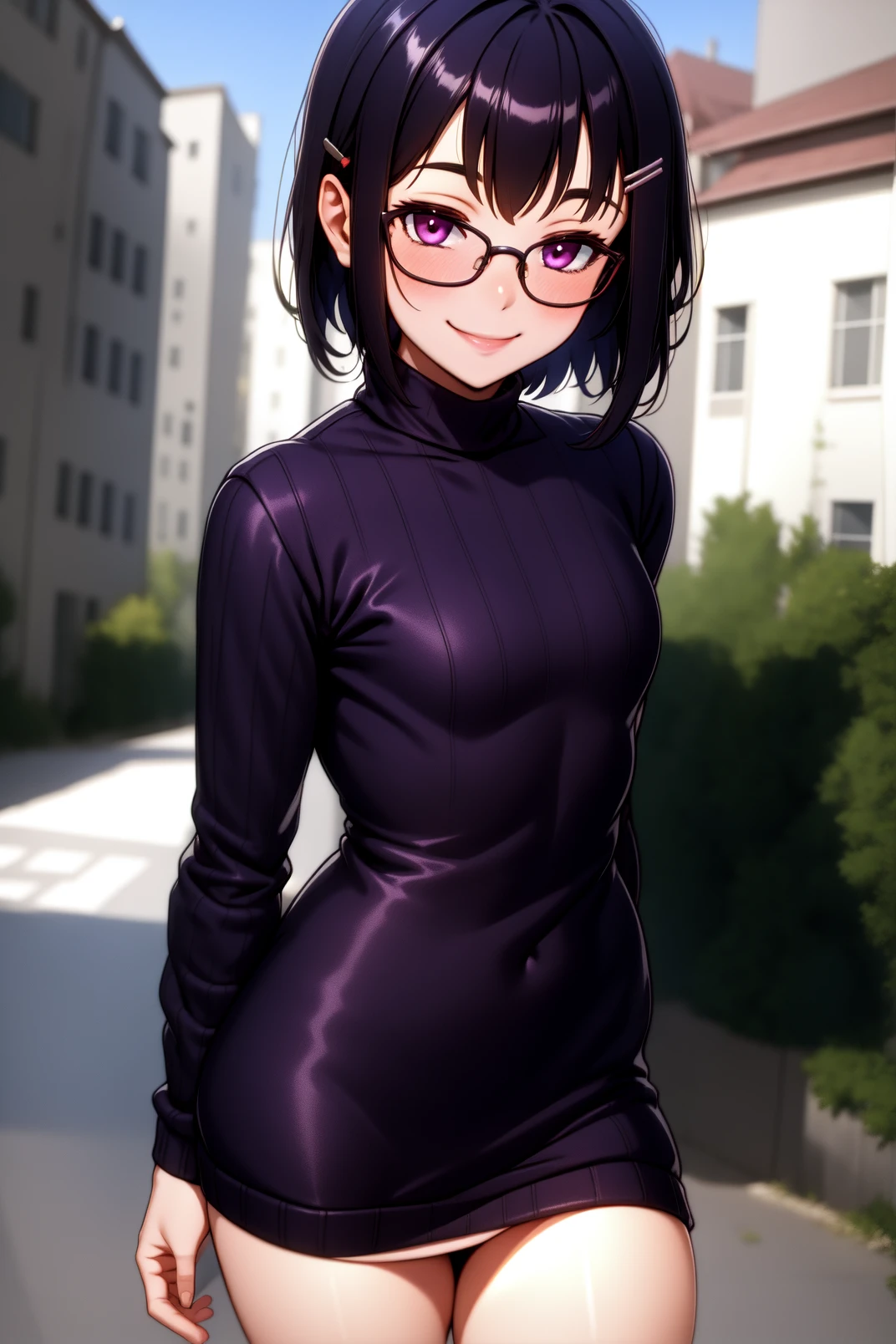 appearance: sona, purple eyes, black hair, short hair, glasses, hair clip