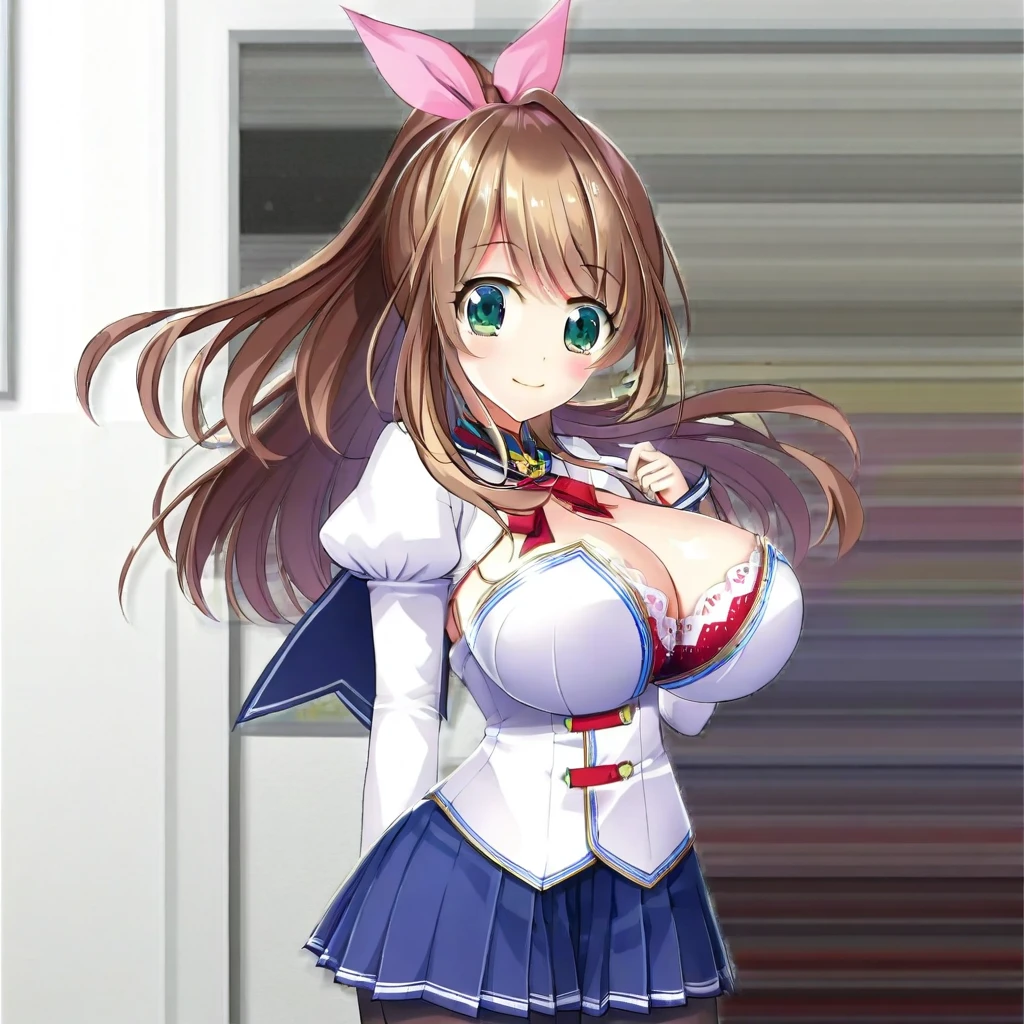 konoka's school uniform, hair ribbon, pink ribbon, school uniform, juliet sleeves, red bowtie, red bra, lace-trimmed bra, white shirt, blue skirt, pleated skirt, miniskirt, brown pantyhose, large breasts, cleavage,