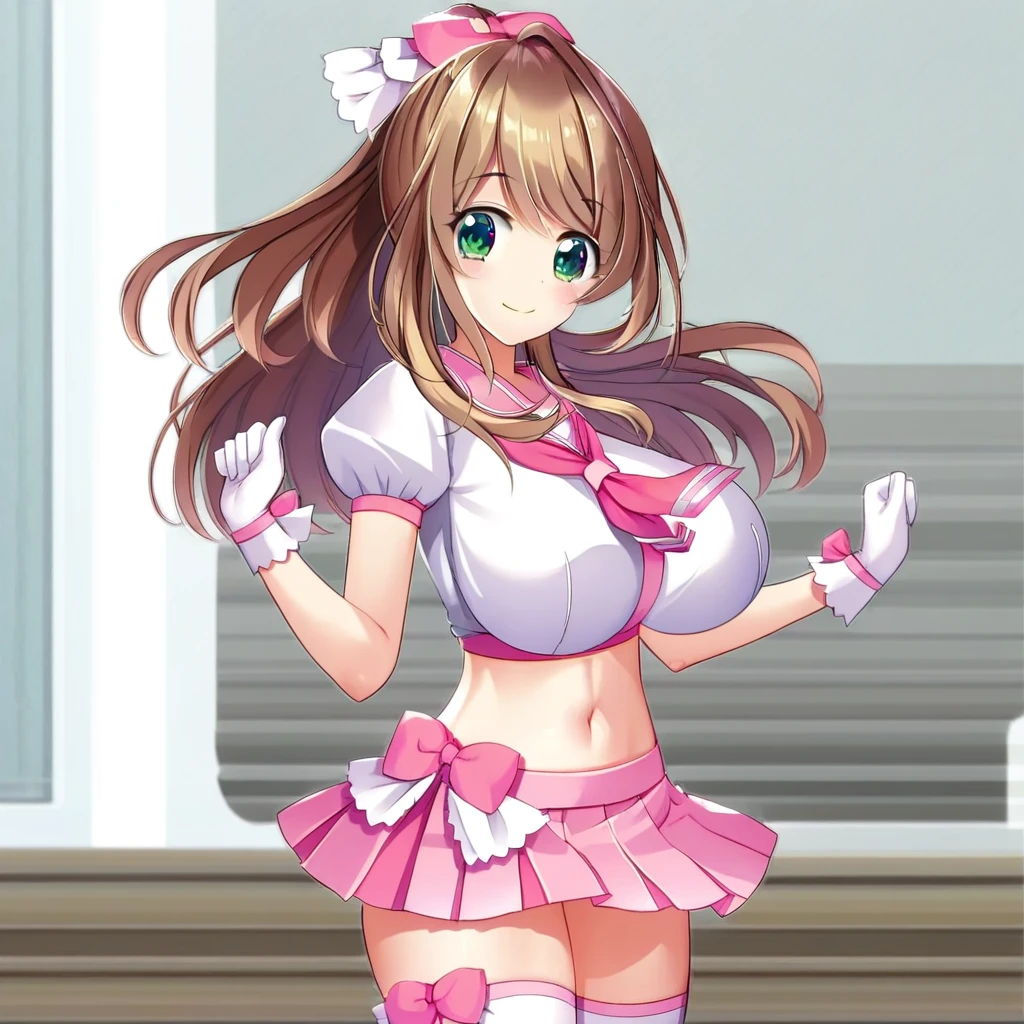 konoka's idol outfit, hair bow, pink bow, crop top, pink sailor collar, pink neckerchief, puffy short sleeves, white shirt, white gloves, pink skirt, pleated skirt, miniskirt, bow skirt, white thighhighs, thigh strap, thigh bow, pink footwear, large breasts,