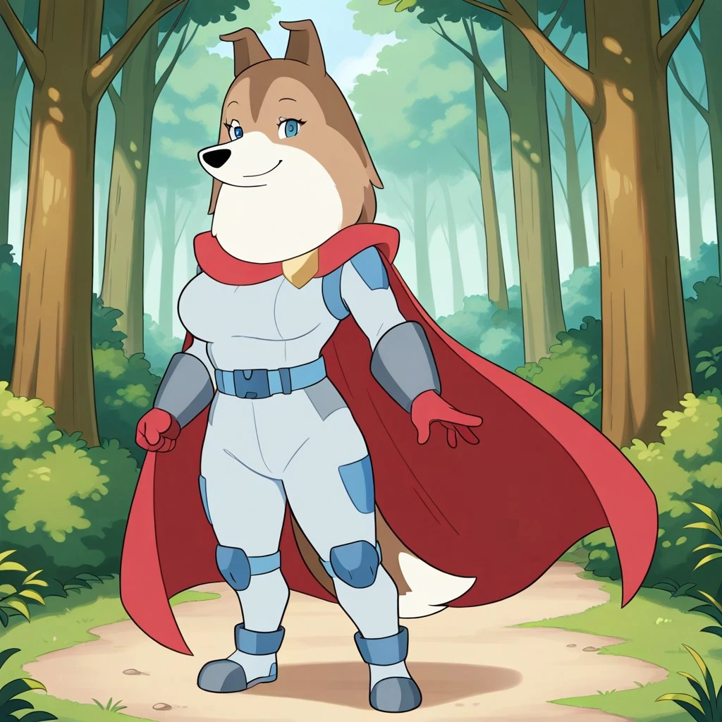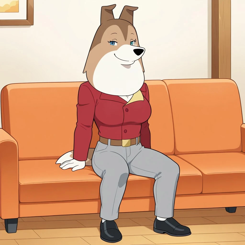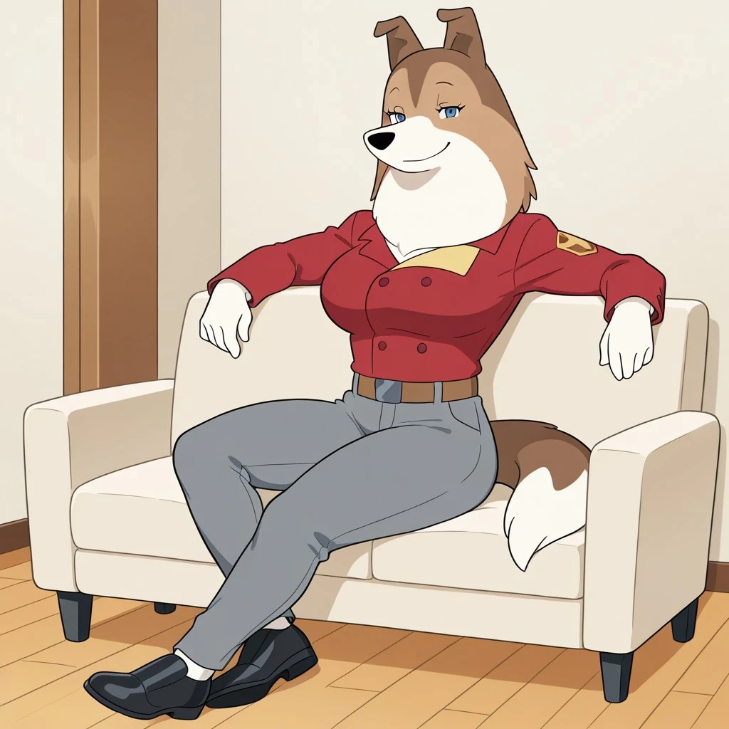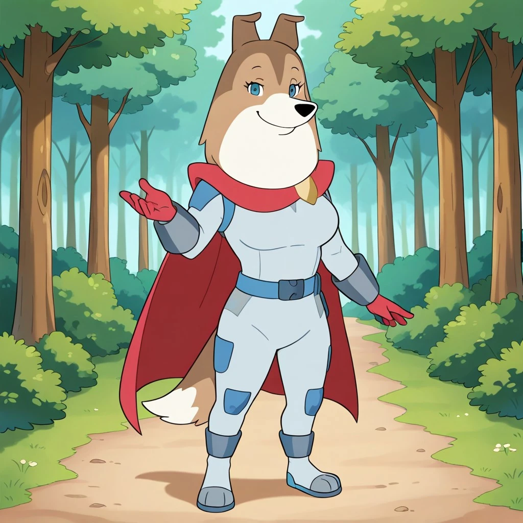 dog, dog girl, rough collie, brown and white fur, blue eyes, black nose, dog ears, dog tail,