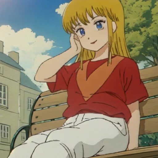 2) Hibari, 1boy, long hair, bangs, blue eyes, blonde hair, shirt, short sleeves, pants, red shirt, white pants,