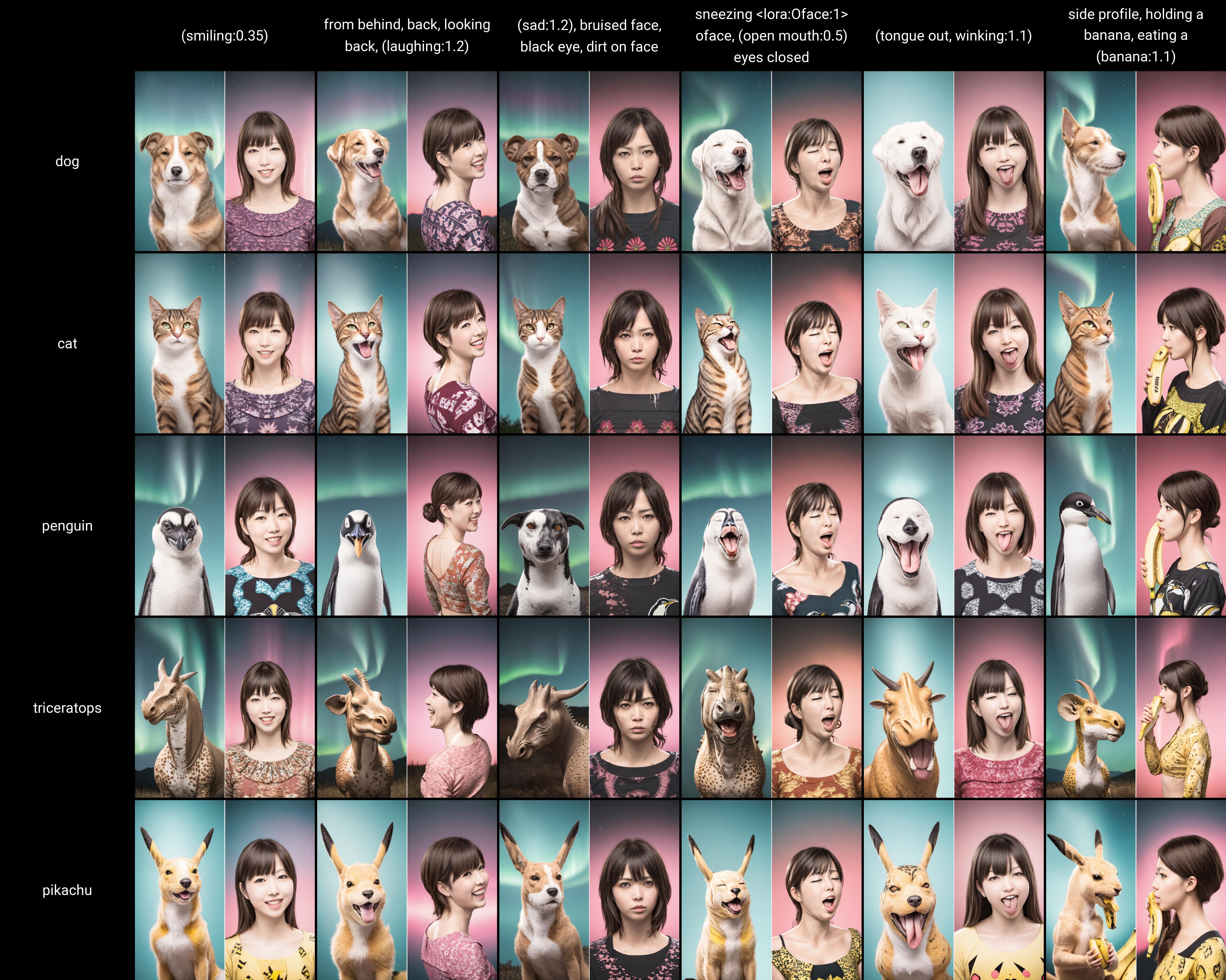 Example prompt: lolp, {person}, {a common animal}
