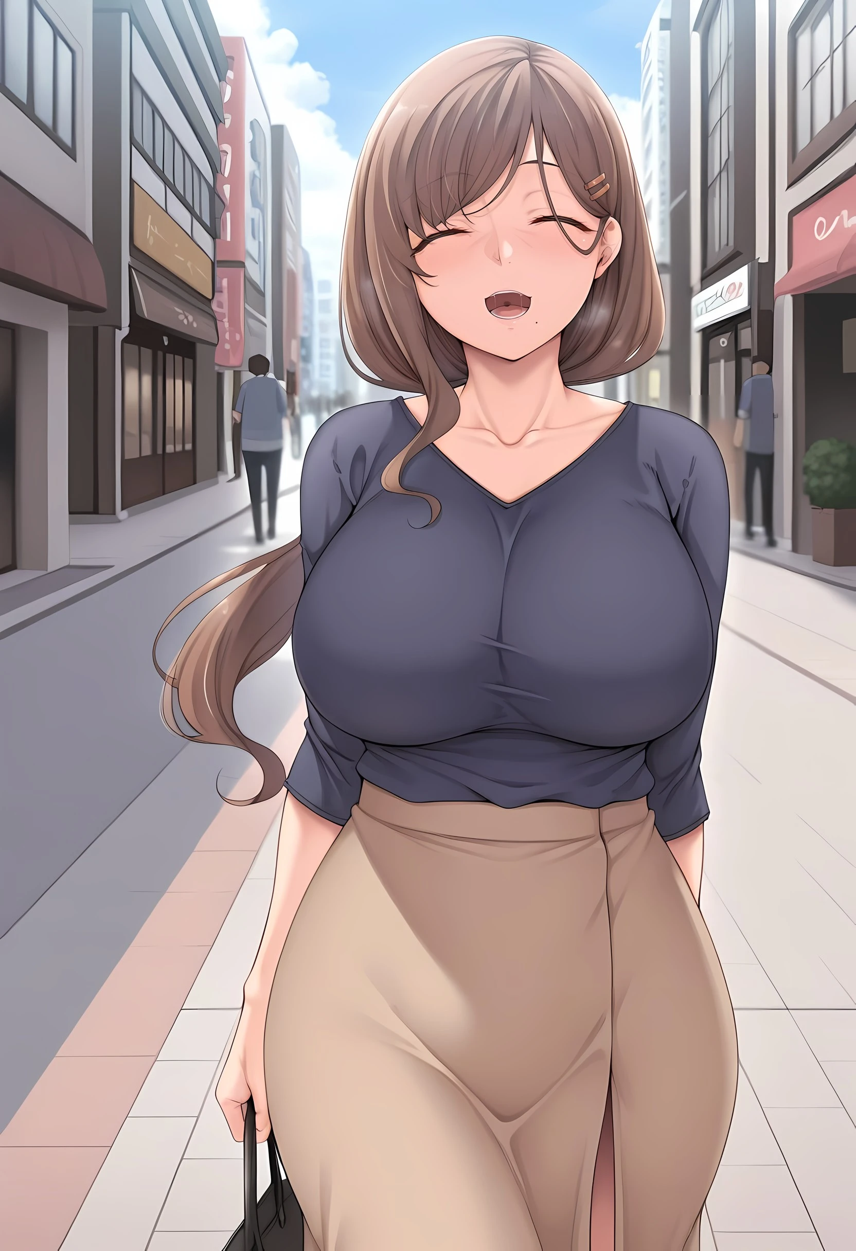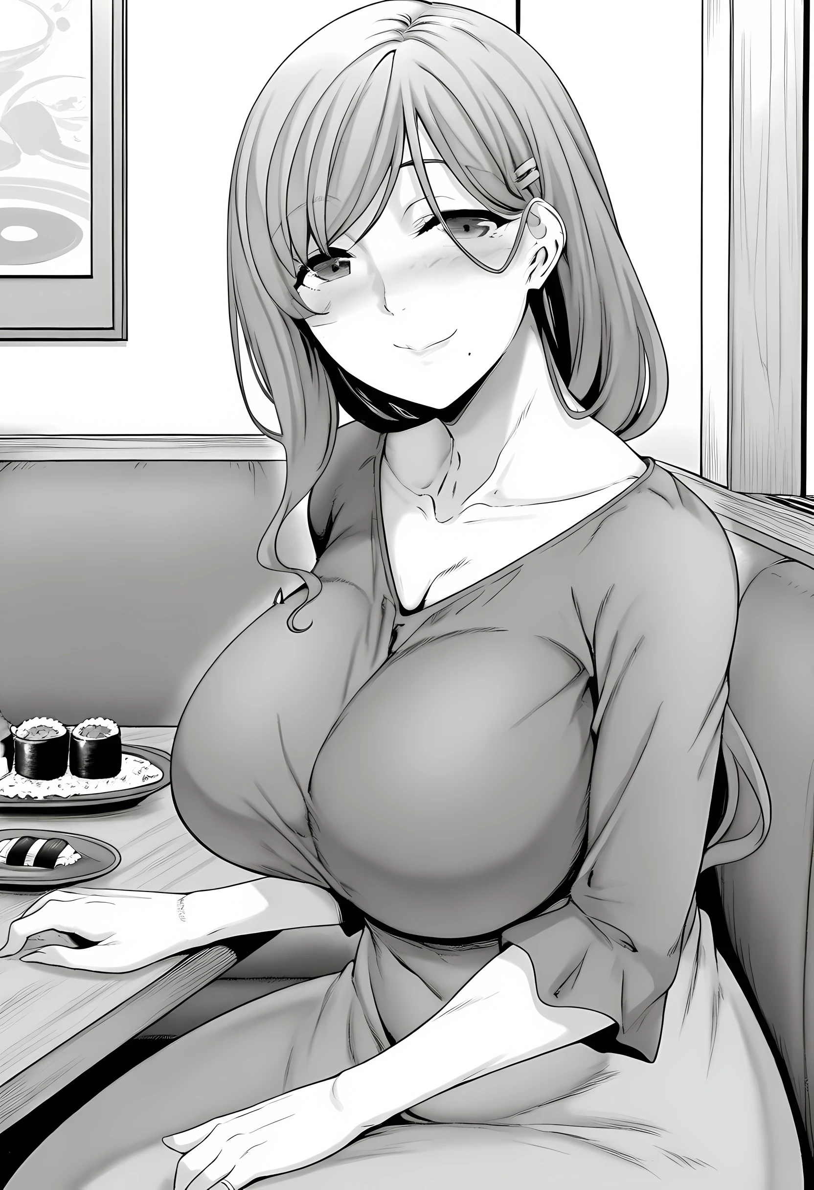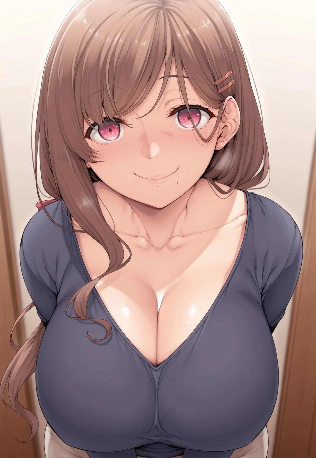 1girl, pink eyes, dark brown hair, large breasts, mature female, hairclip, mole under mouth, long hair,