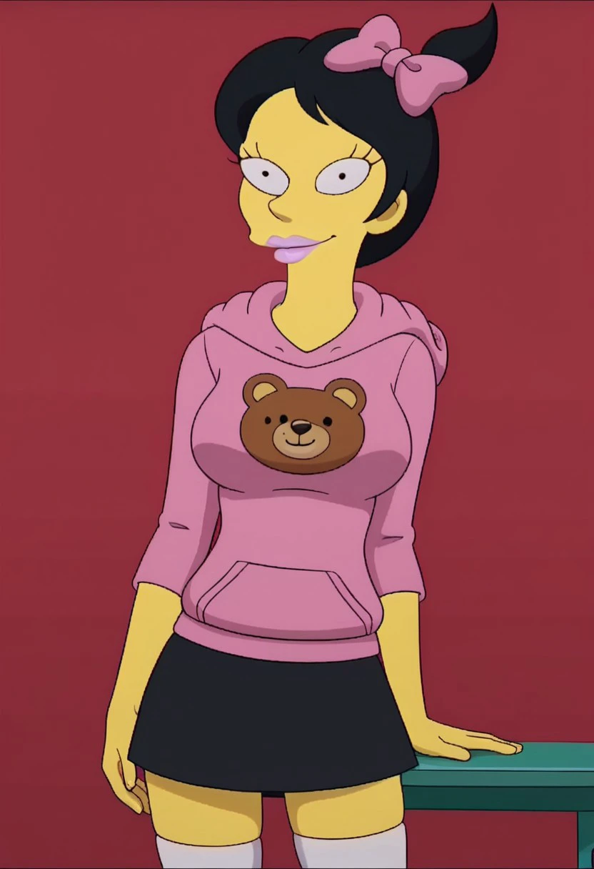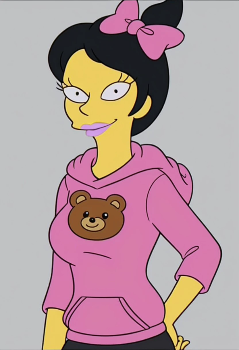 1girl, Solo, Kumiko_TS, light yellow skin, black eyes, black hair, short hair, high bun ponytail, pink hairbow, light pink lips