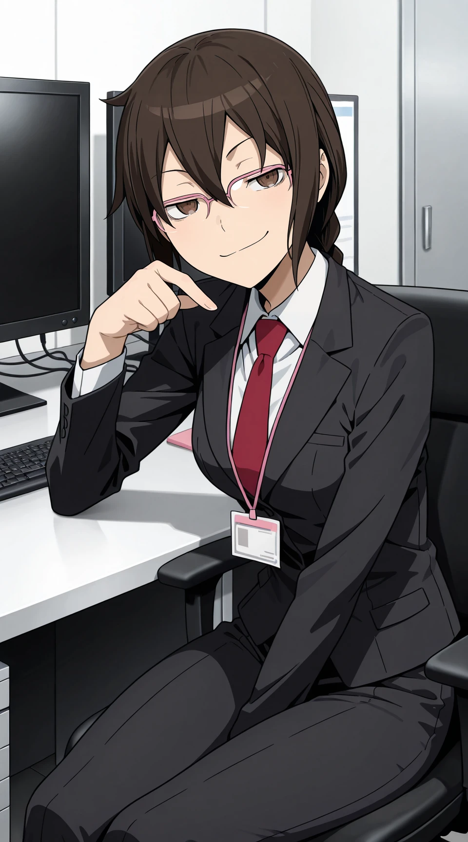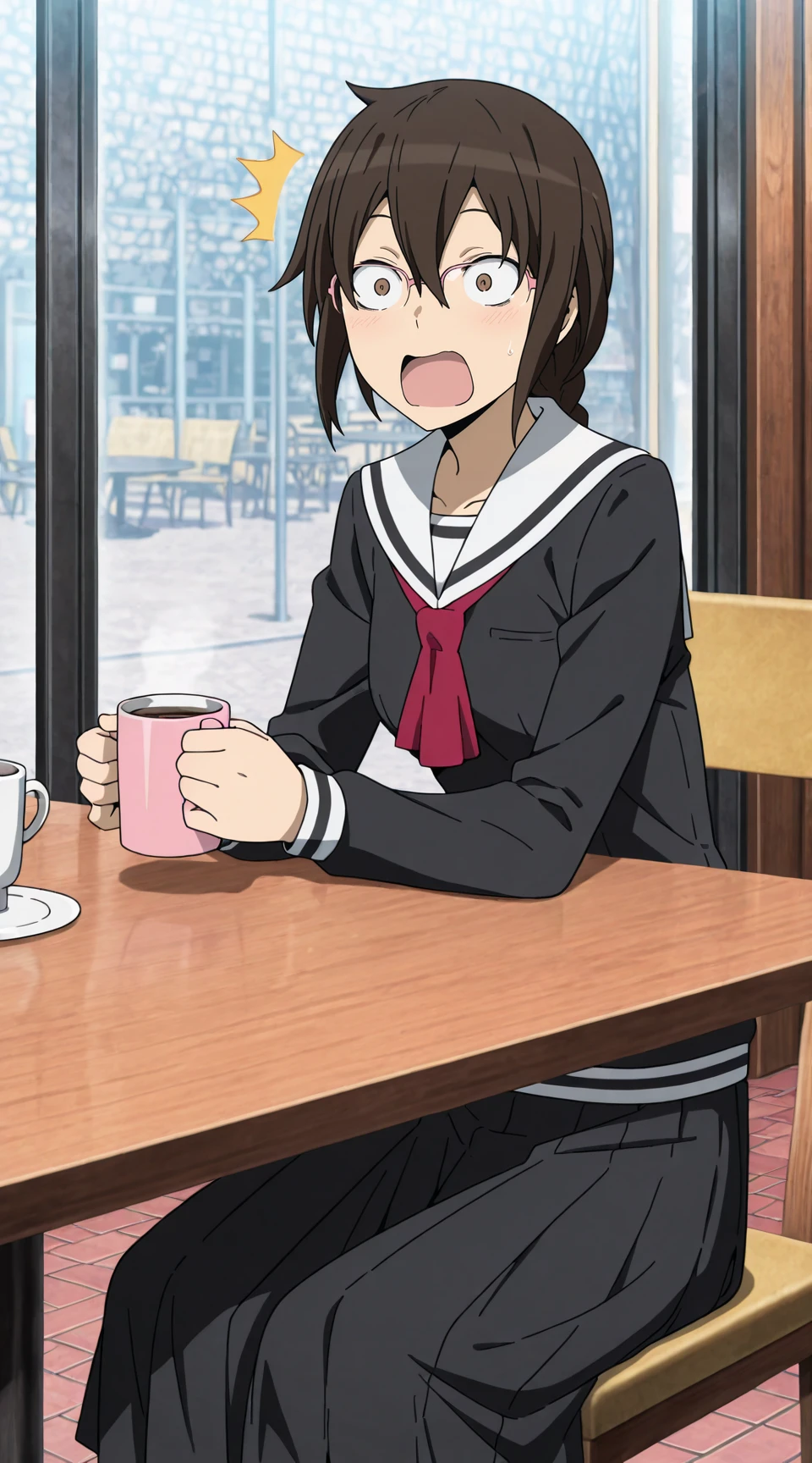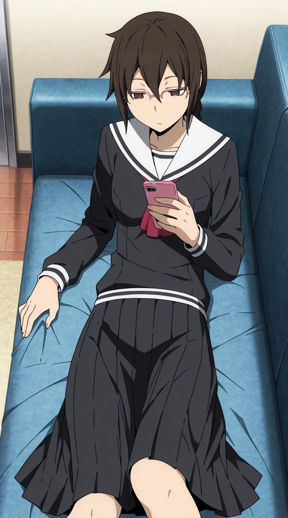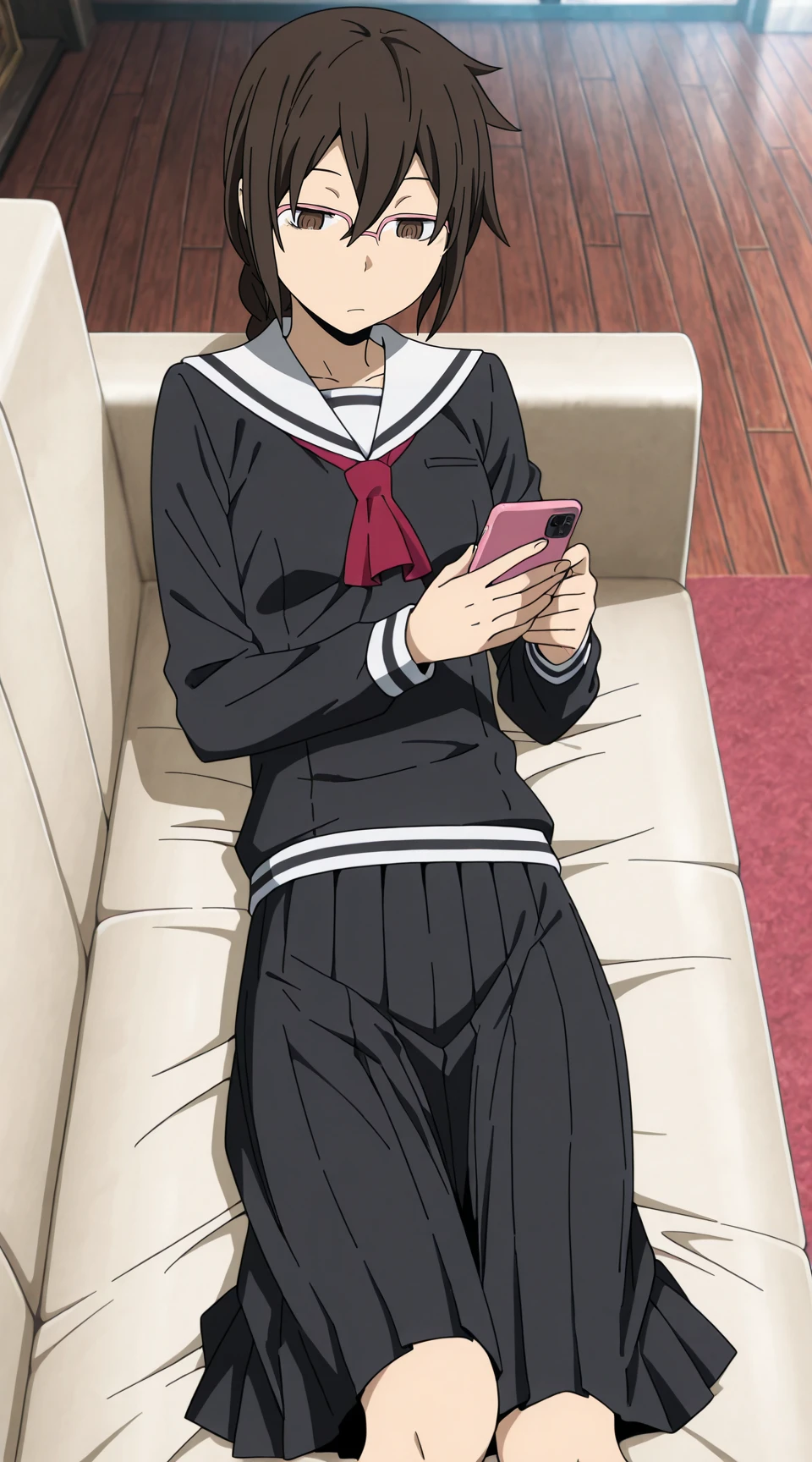 Prompt for uniform: orihara_mairu, pink_glasses, black_serafuku, red_neckerchief, black_pleated_skirt solo, anime_screenshot, long_skirt