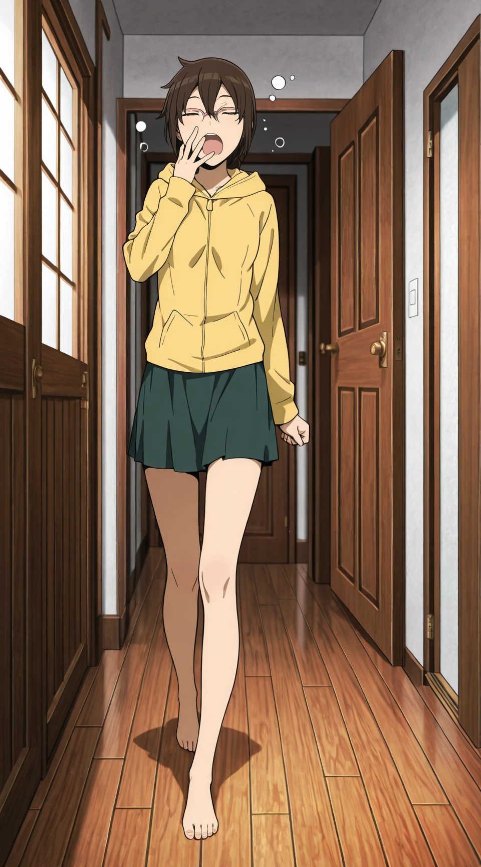Prompt for casual hoodie outfit(hood_up and hood_down supported): orihara_mairu, pink_glasses, yellow_hoodie, green_skirt, anime_screenshot