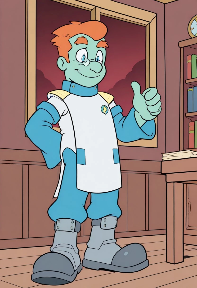 Professor Von Schlemmer, green skin, ginger hair, blue eyes, glasses, bushy ginger eyebrows, white coat, blue collar, blue sleeves, blue pants, gray shoes