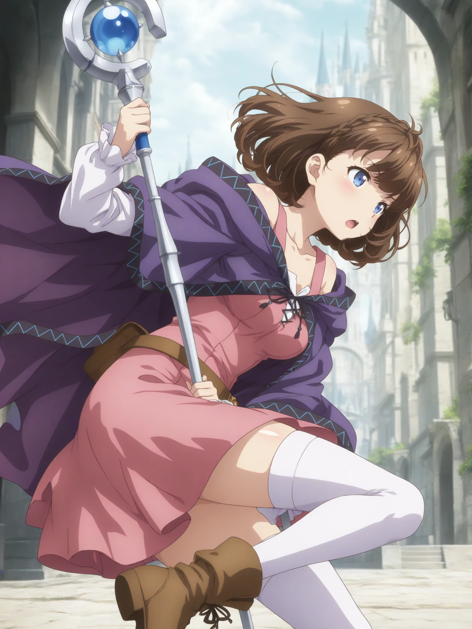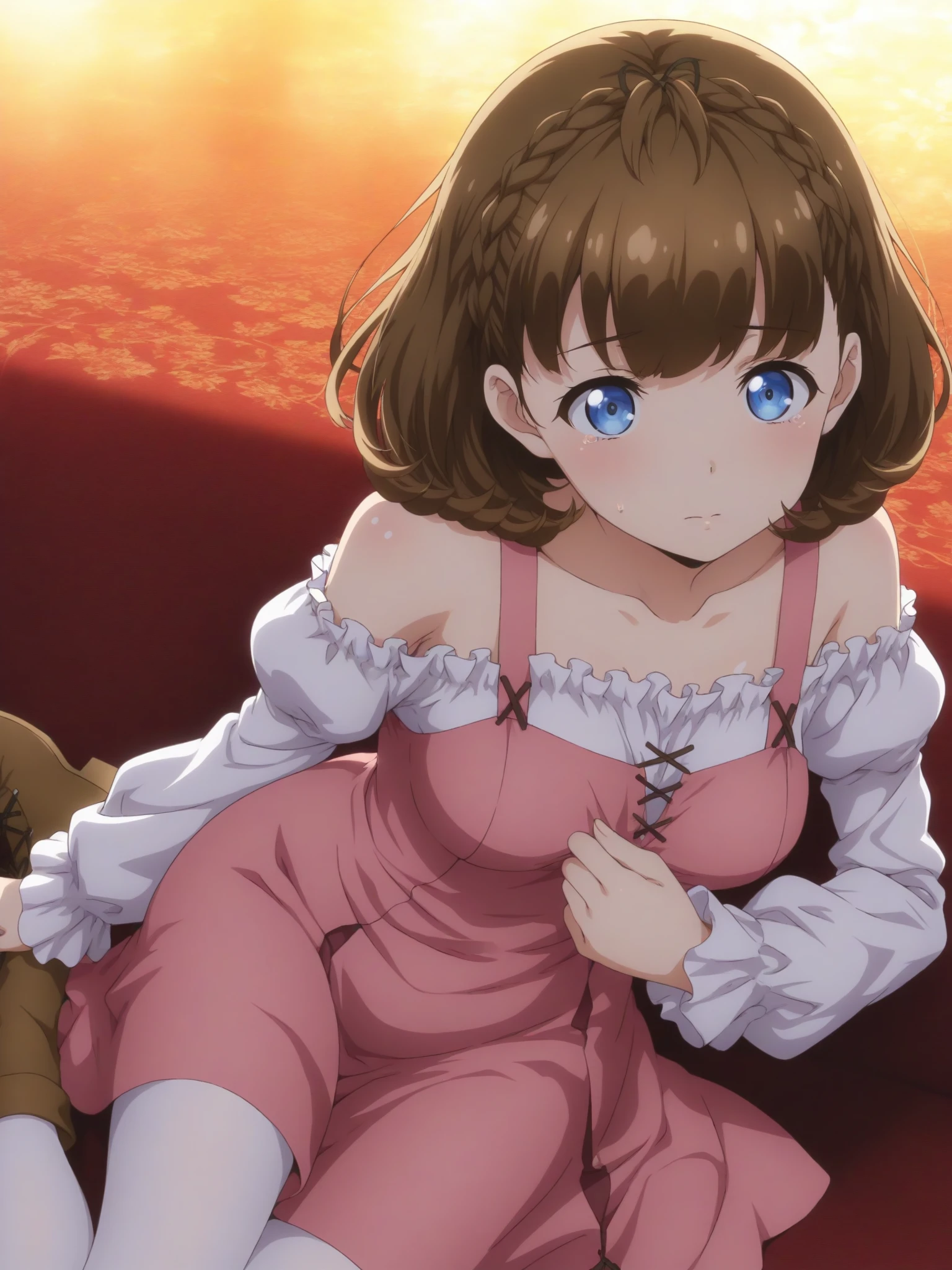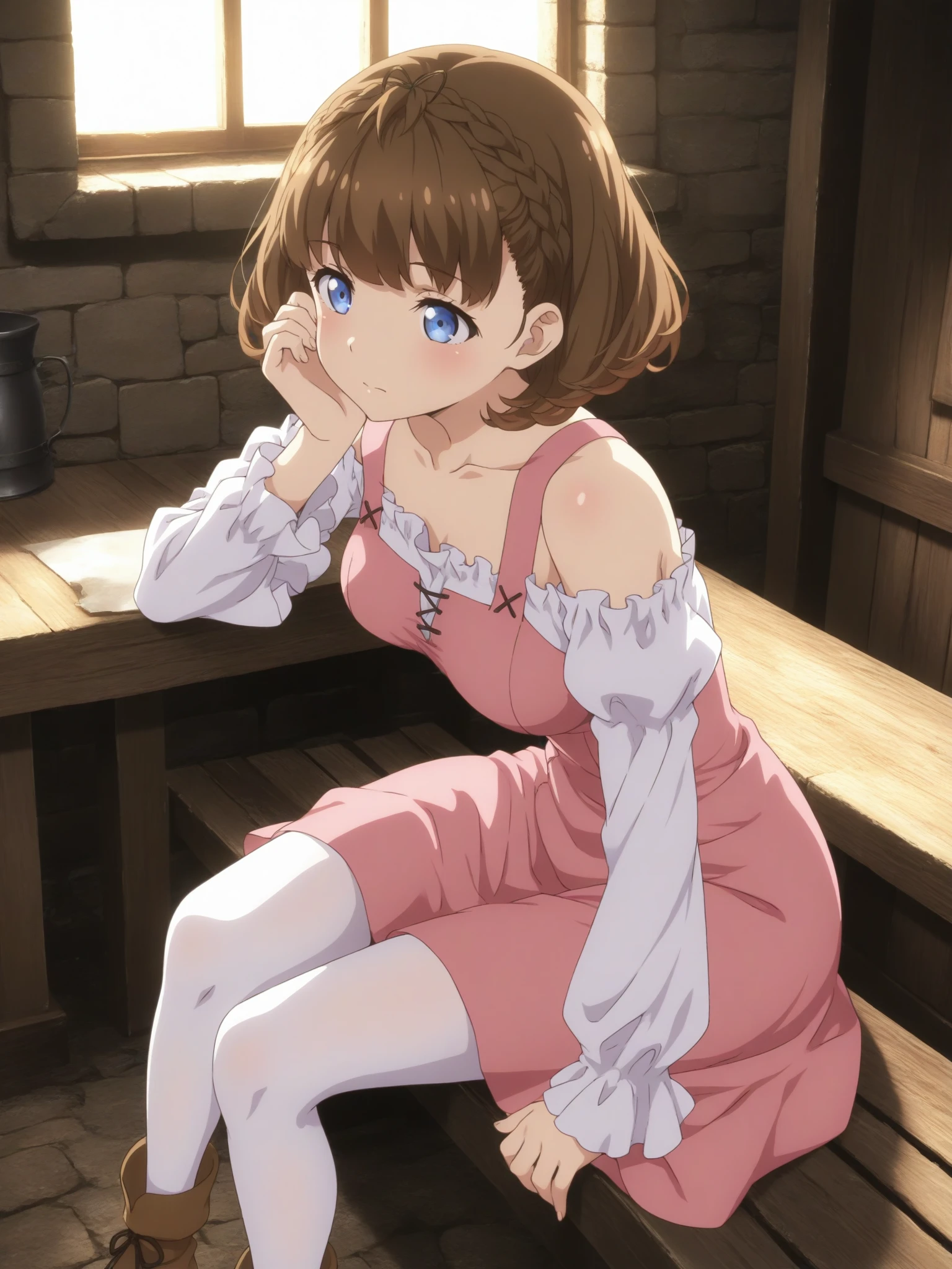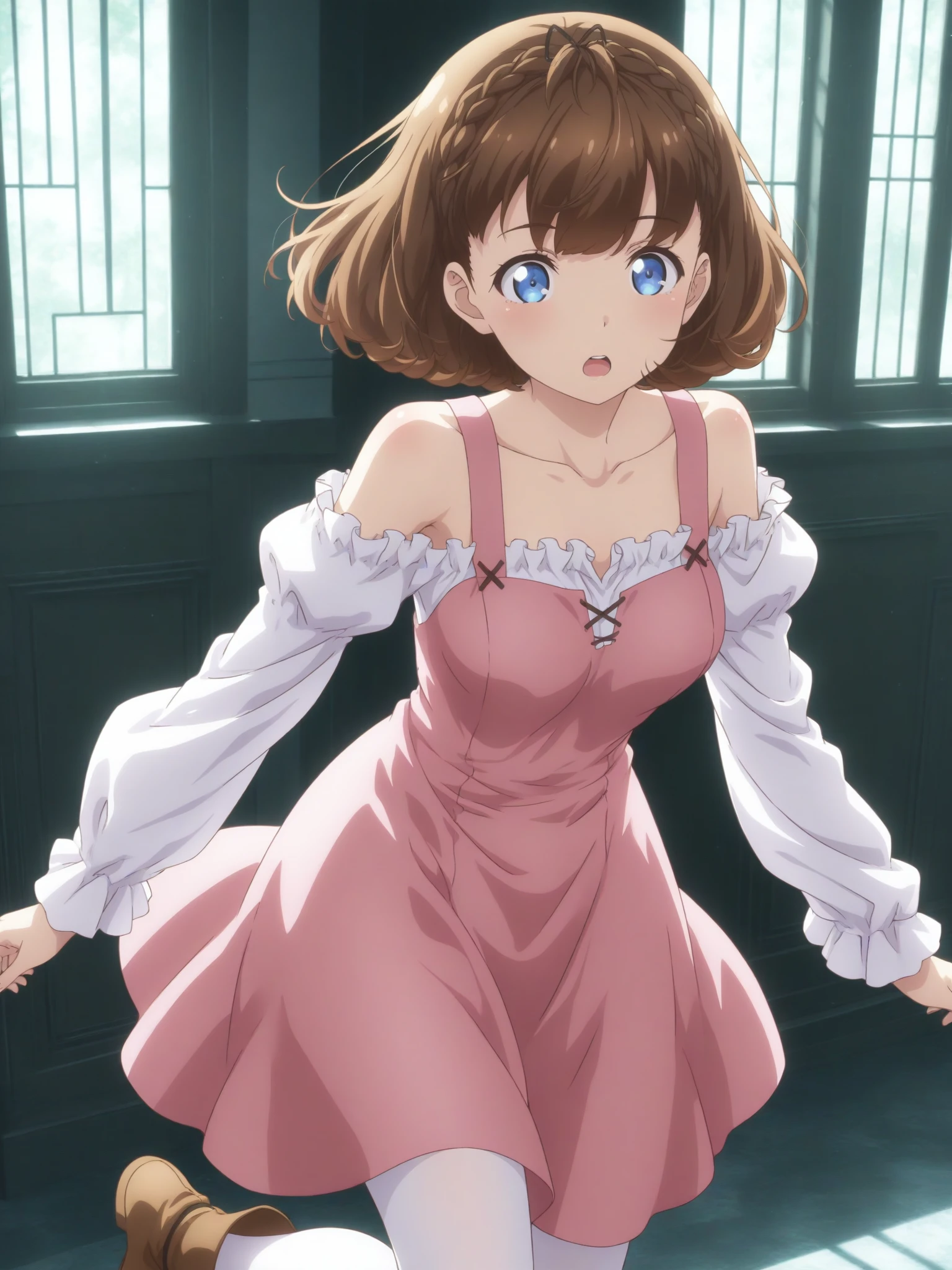 Clothes: (pink dress, white shirt, long sleeves, bare shoulders, collarbone, white stockings, brown ankle boots)