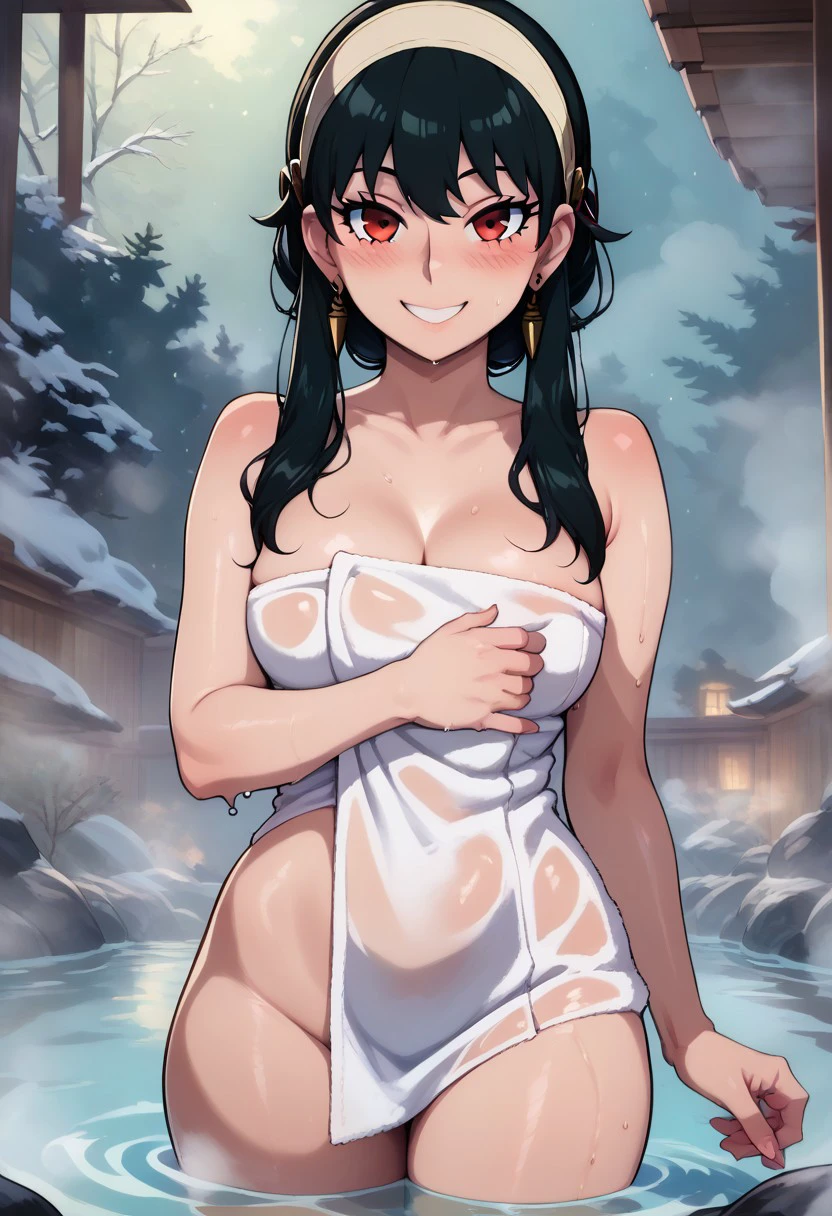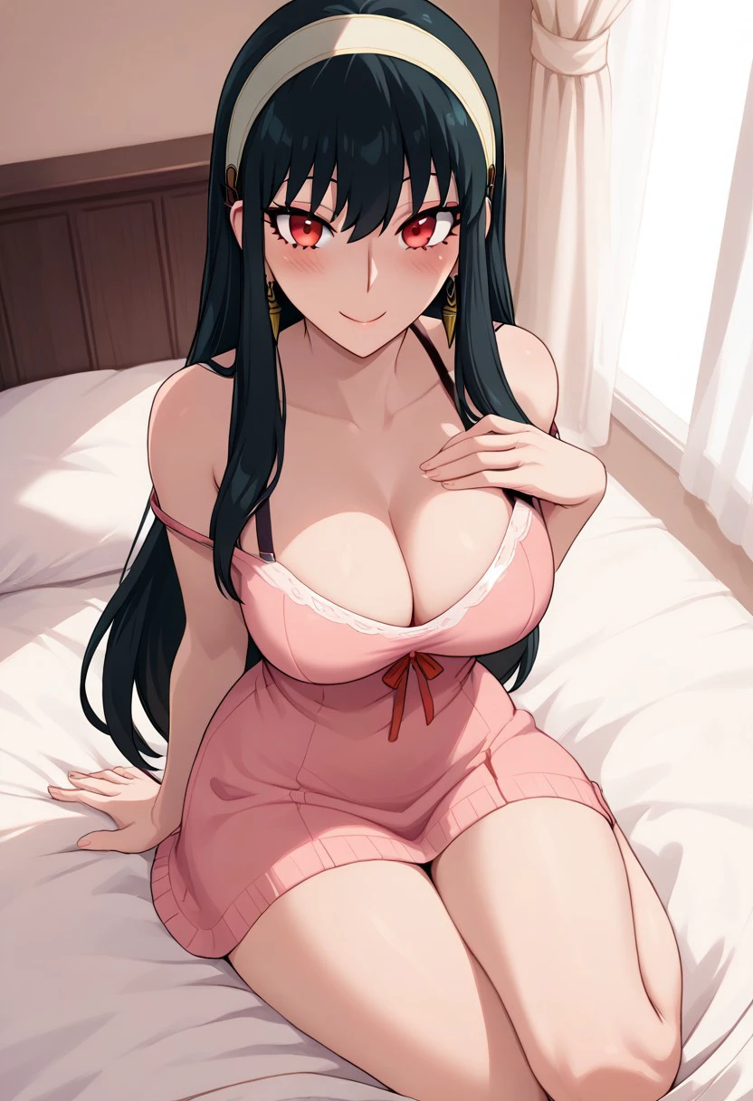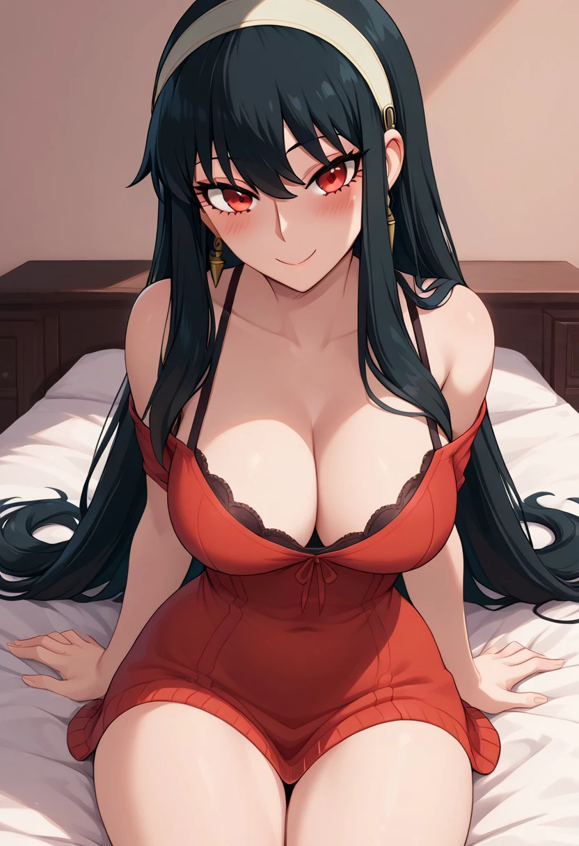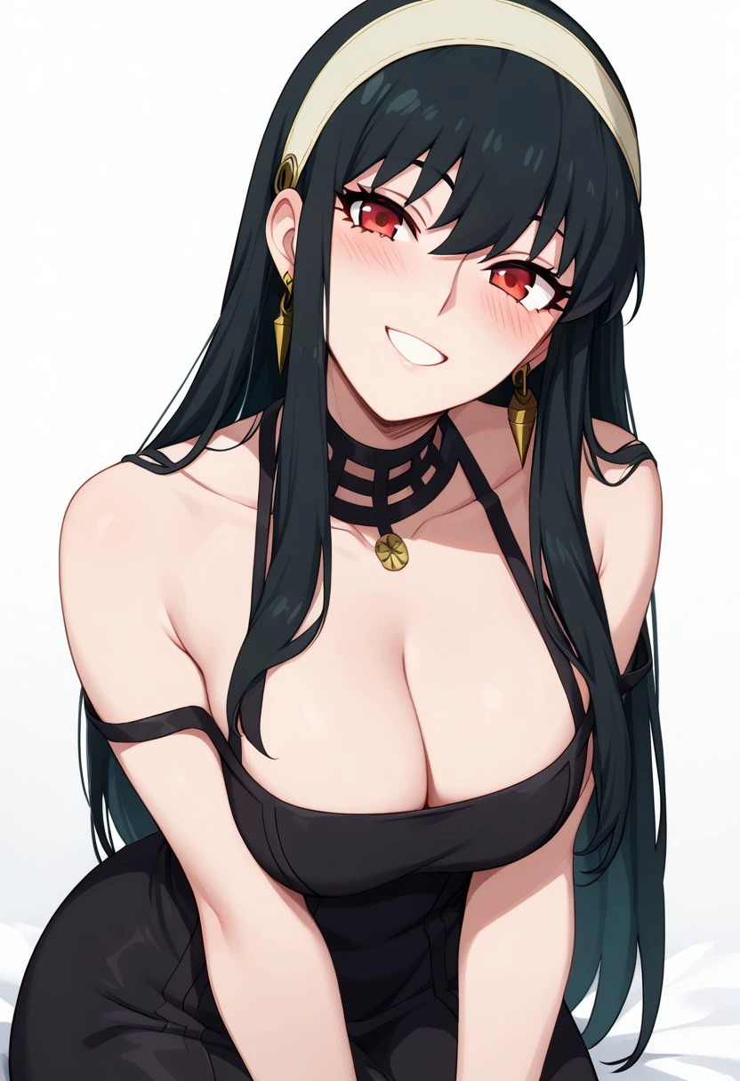 patYor, yor briar, black hair, red eyes, earrings, white hairband, hairband, long hair, sidelocks, dress, cleavage, bare shoulders, jewelry, collarbone, sleeveless, black dress, halterneck, white headband,