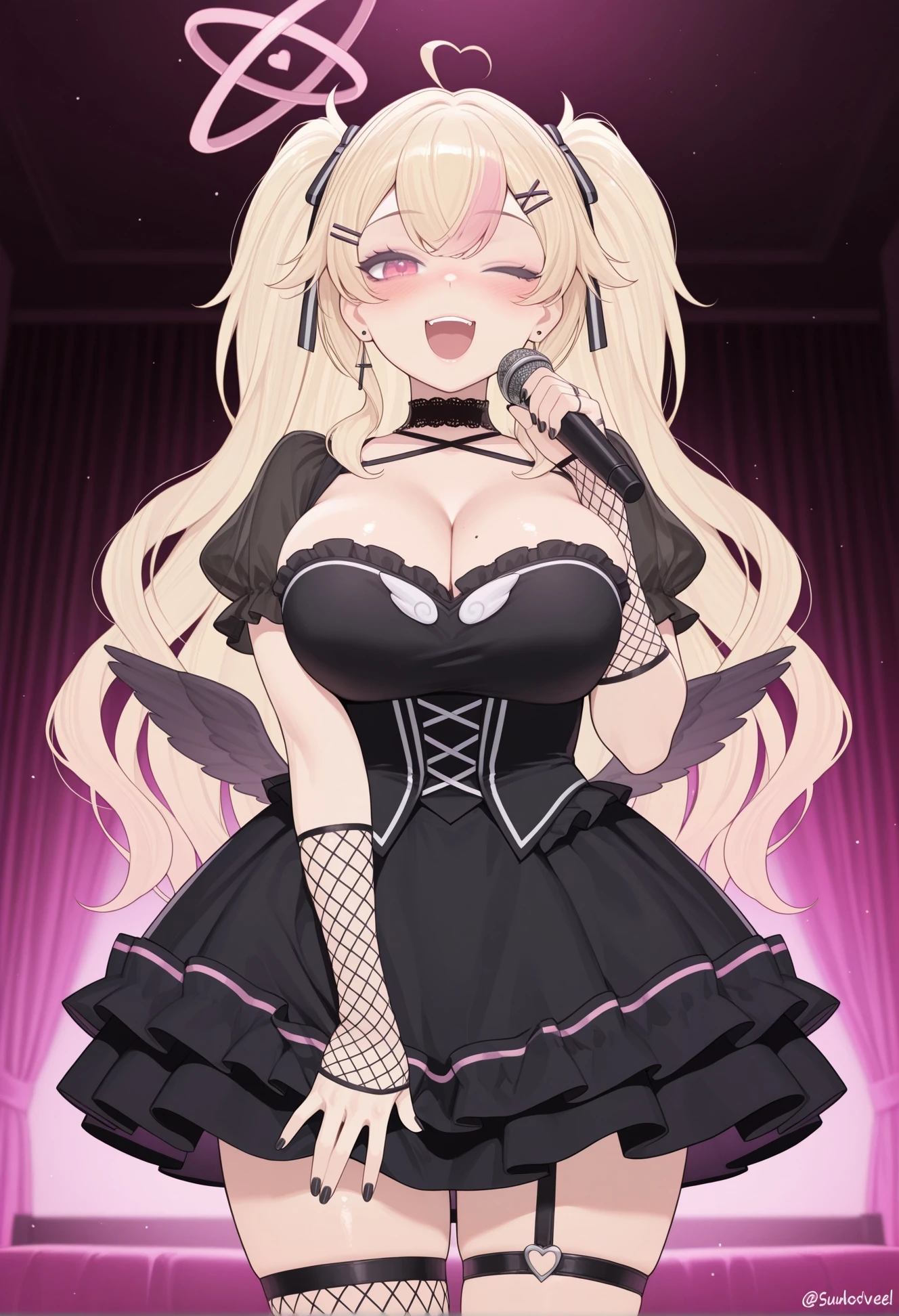 pink ophanim halo, cross necklace, cross earrings, uneven gloves, blond hair, pink streakslace-trimmed chokerOr, for the hoodie/pink swimsuit outfit: