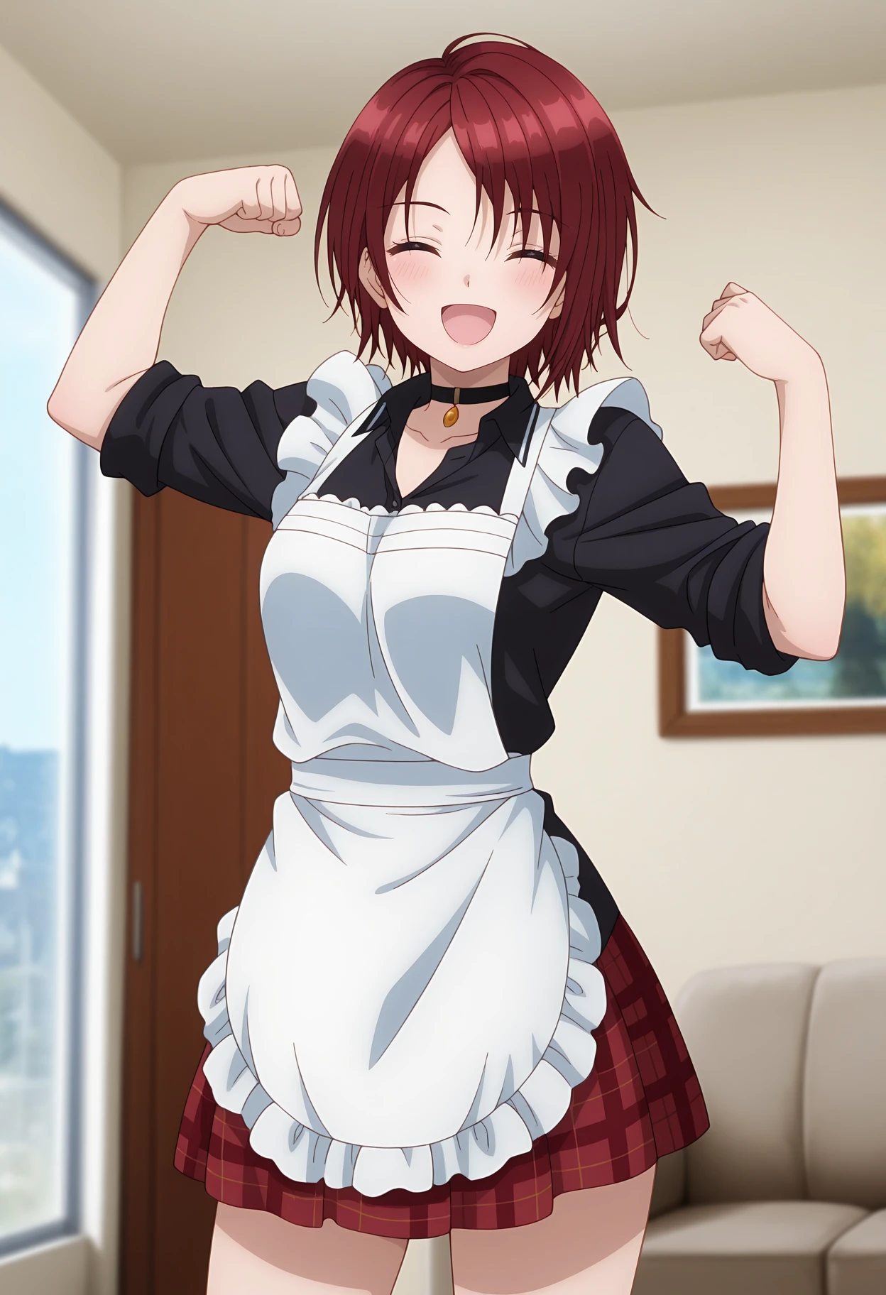 pendant choker, black shirt, sleeves rolled up, maid apron, white apron, plaid skirt, red skirt